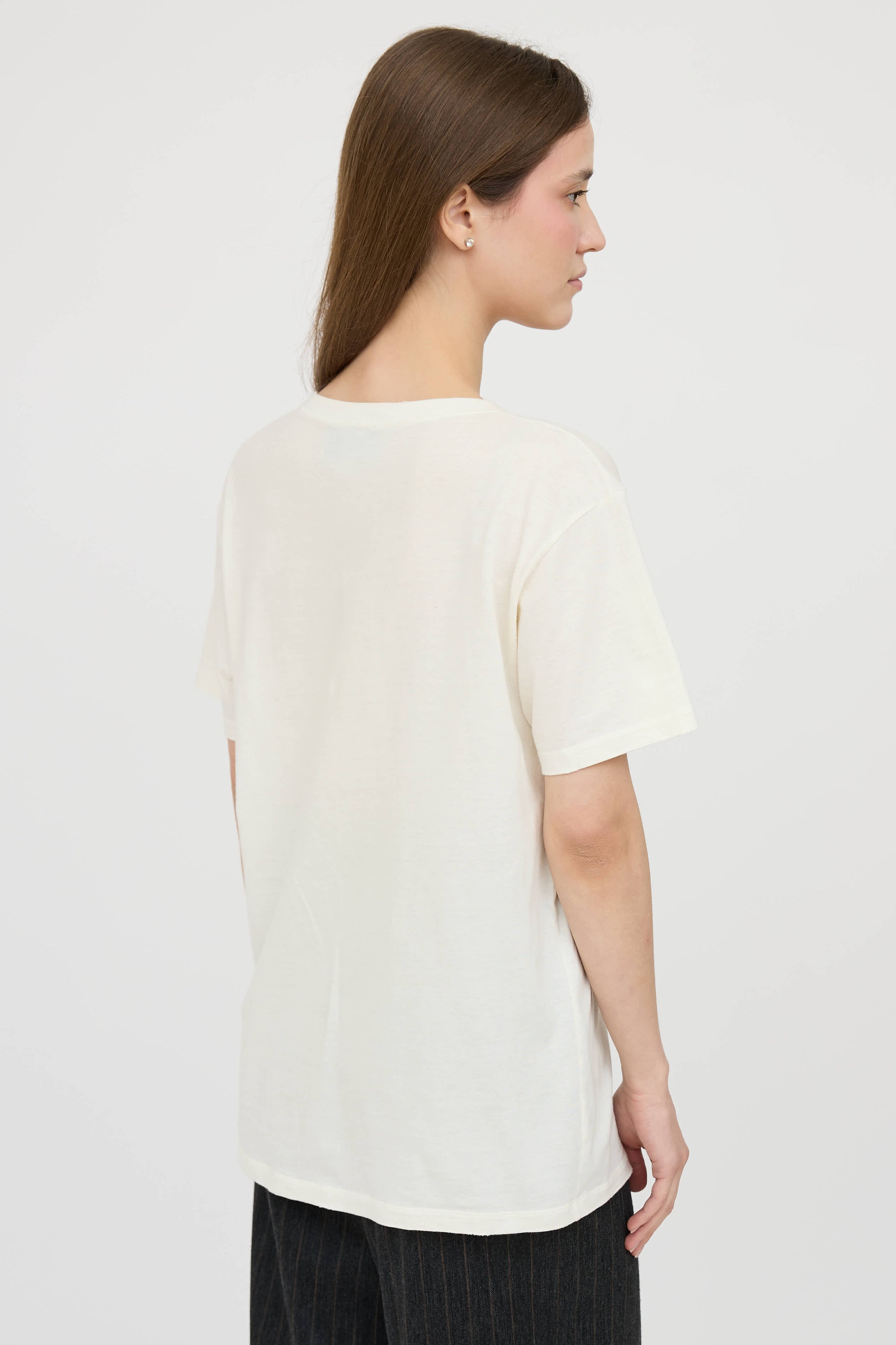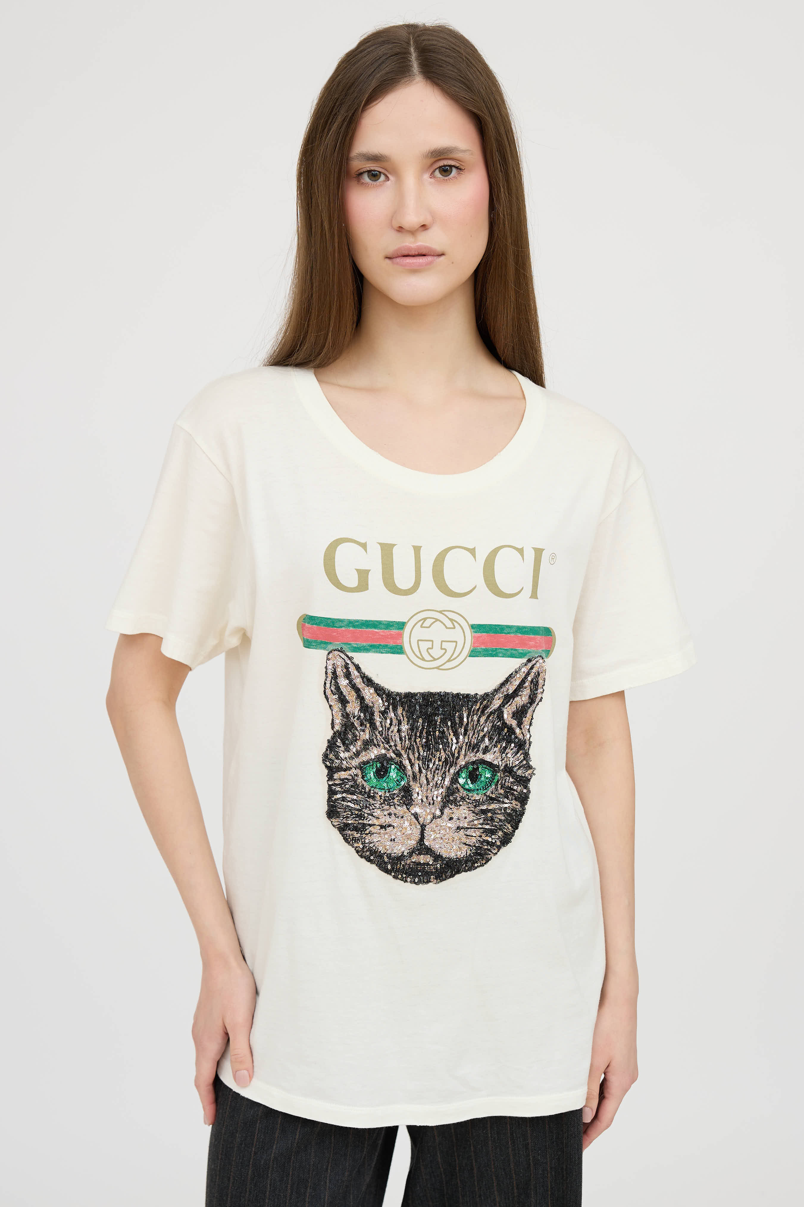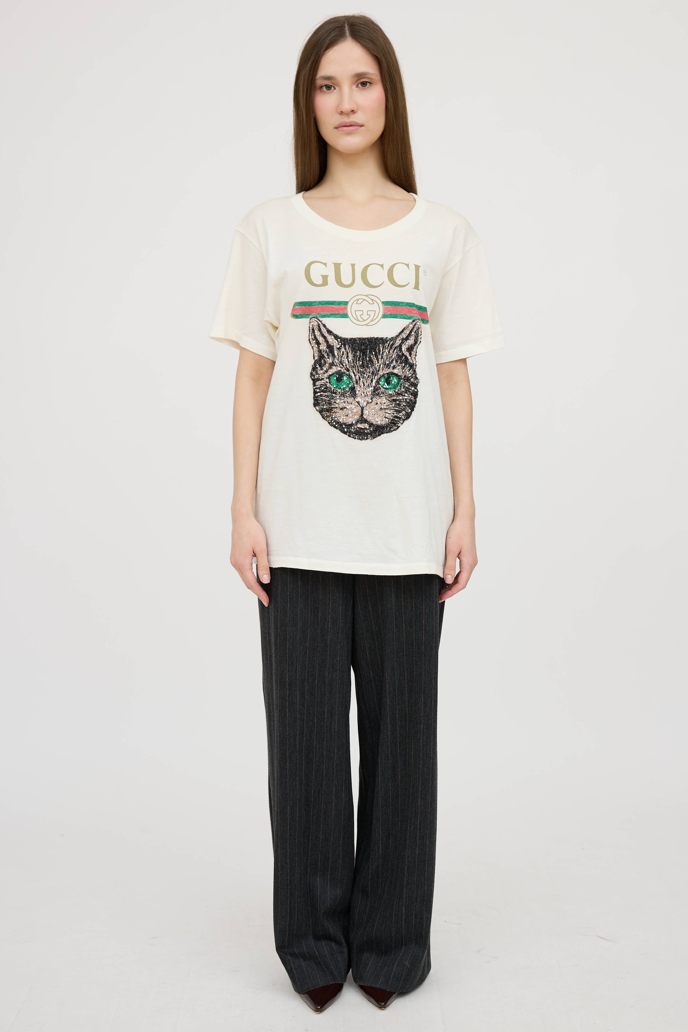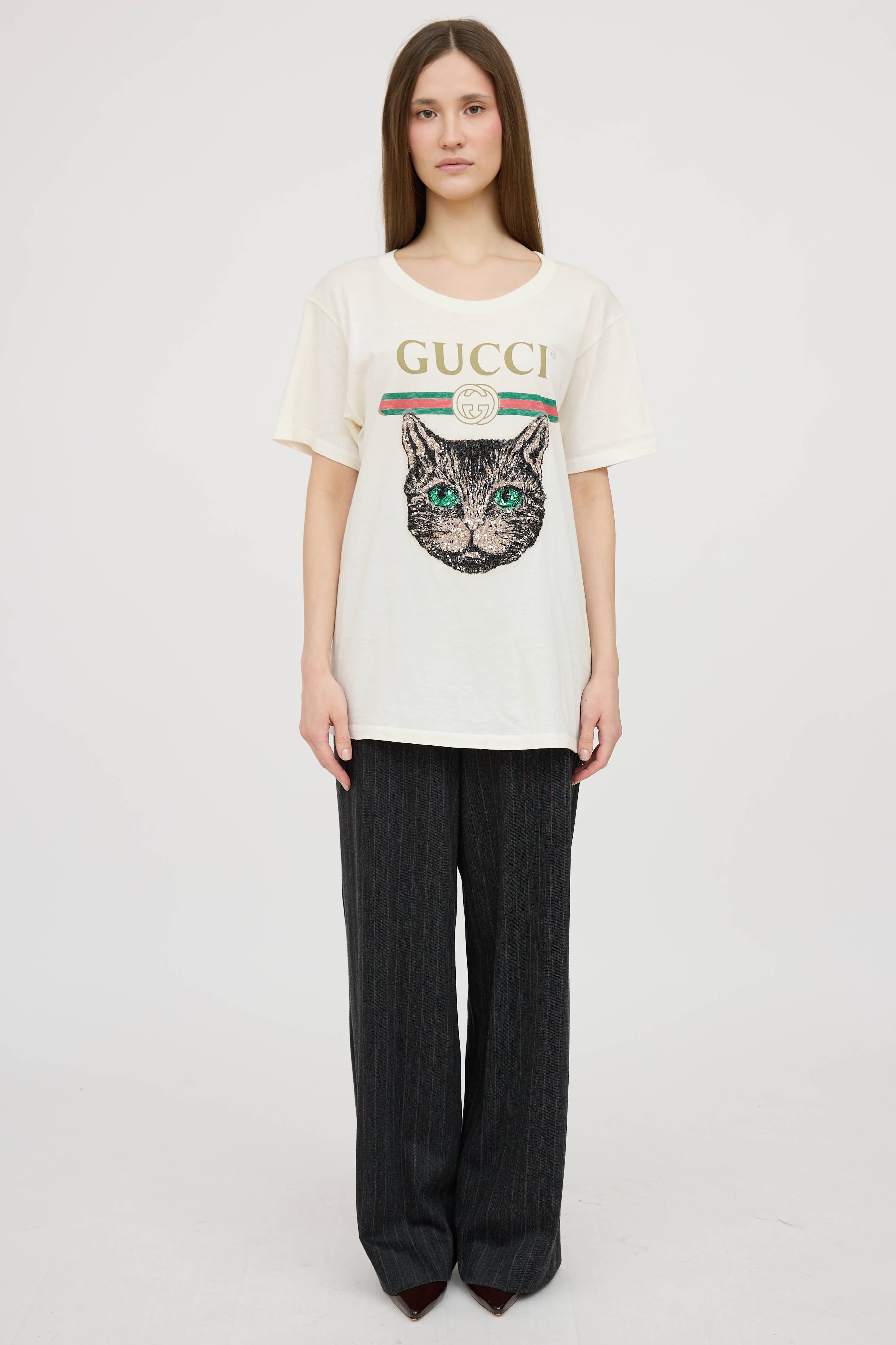 Pre-owned Gucci cream and multicolour logo shortsleeve t-shirt featuring round neckline, distressing at collar, and cat sequin patch and logo at front.
