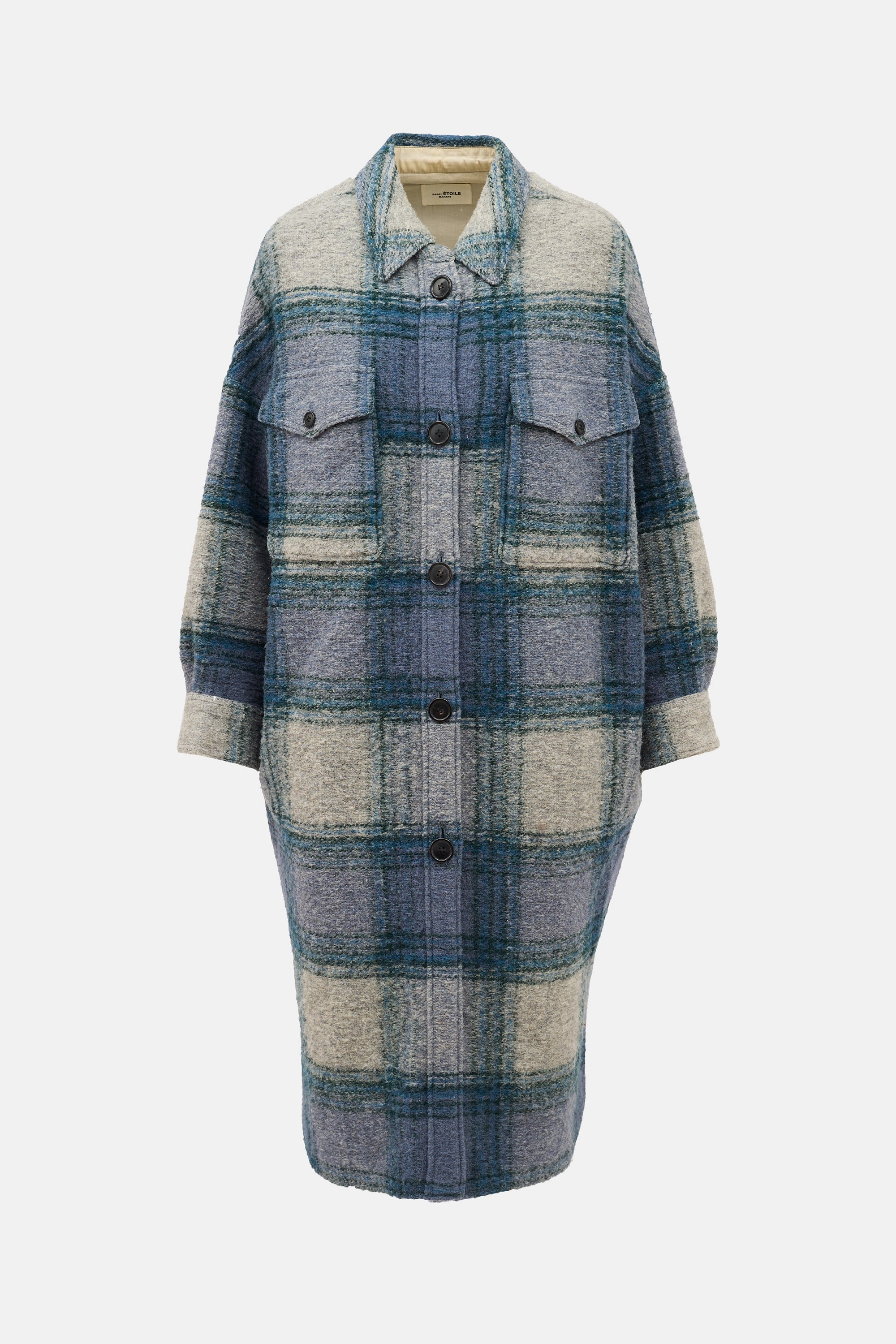 Pre-owned Isabel Marant Étoile blue and grey wool blend Gabrion coat featuring plaid pattern, spread collar, button up front, two front flap pockets, and buttoned cuffs. Lined yoke.