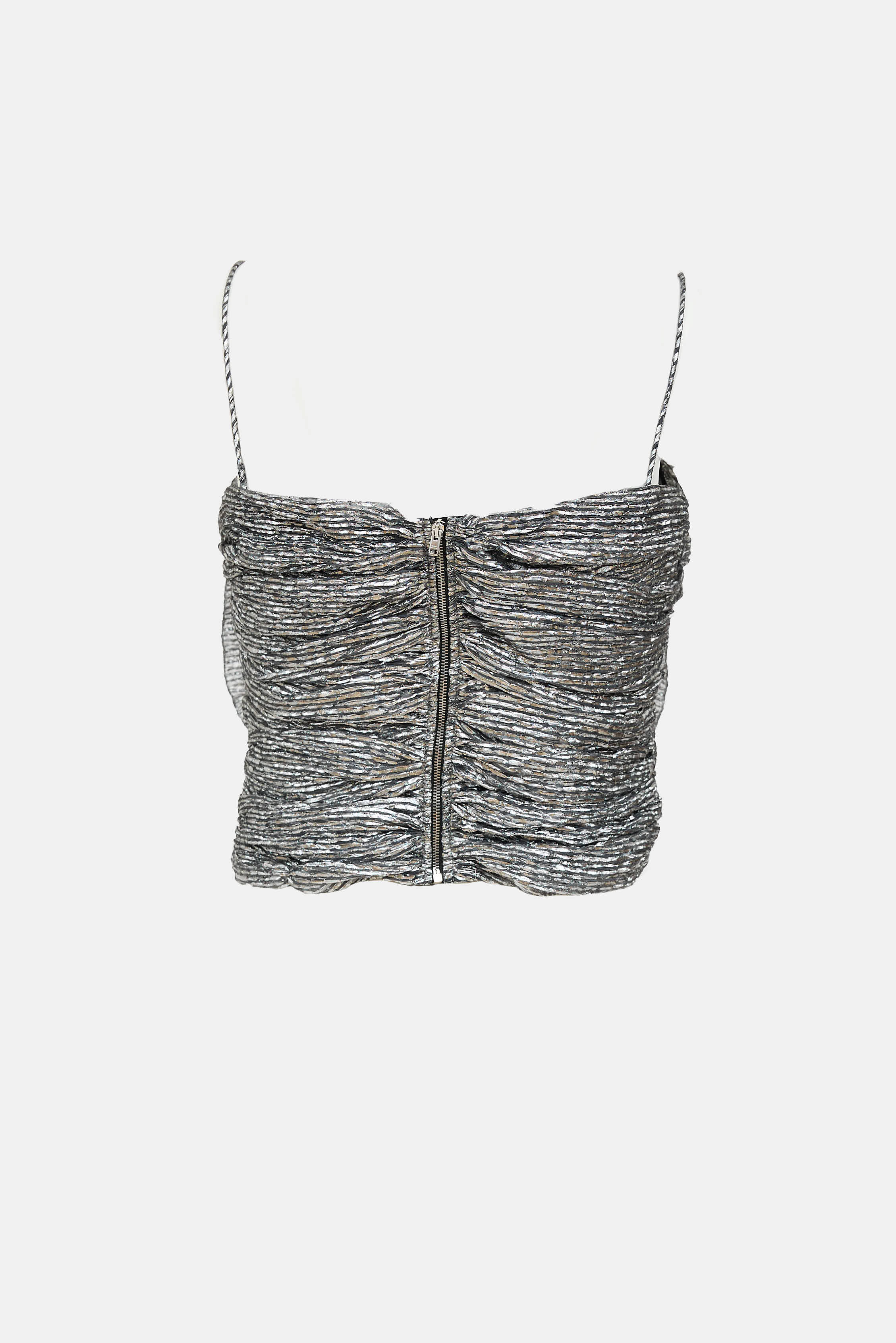 Pre-owned Isabel Marant silver metallic featuring a V-neckline, sleeveless styling, layered bow at front, ruhed bust, and zip closure at back. Lined.