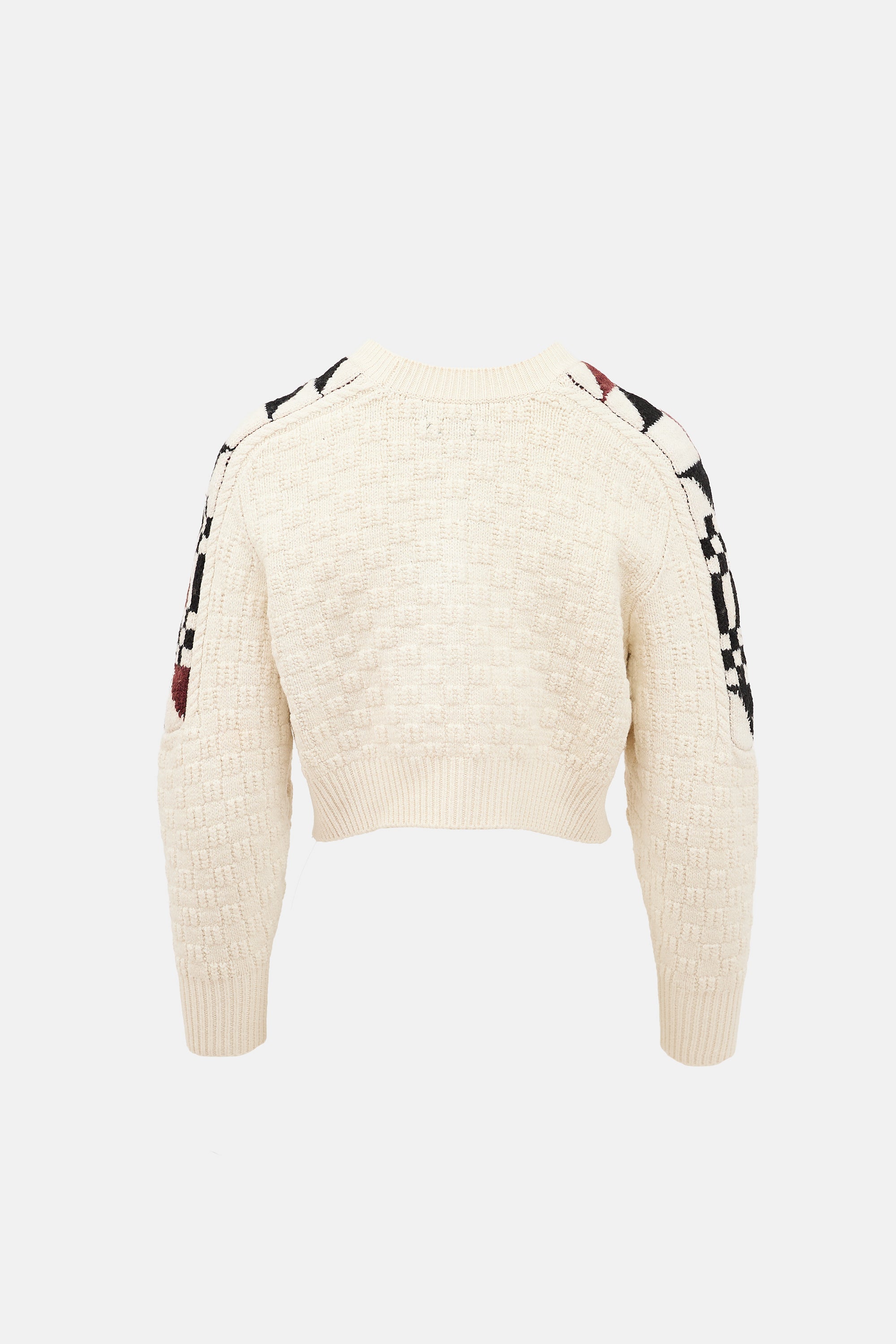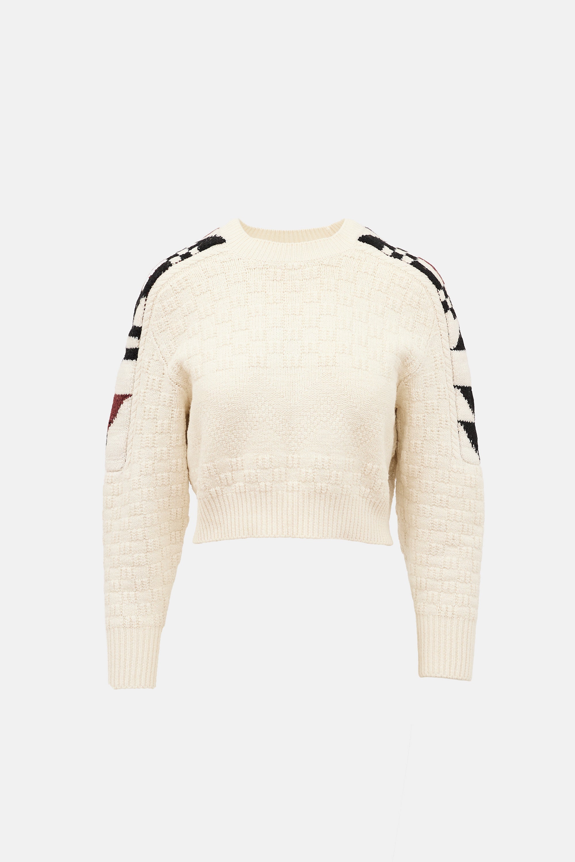Pre-owned Isabel Marant cream and multicolour wool blend Laytonn Origami cropped sweater featuring crew neck, patterned knit, geometric shoulder panels, and ribbed collar, hem, and cuffs.