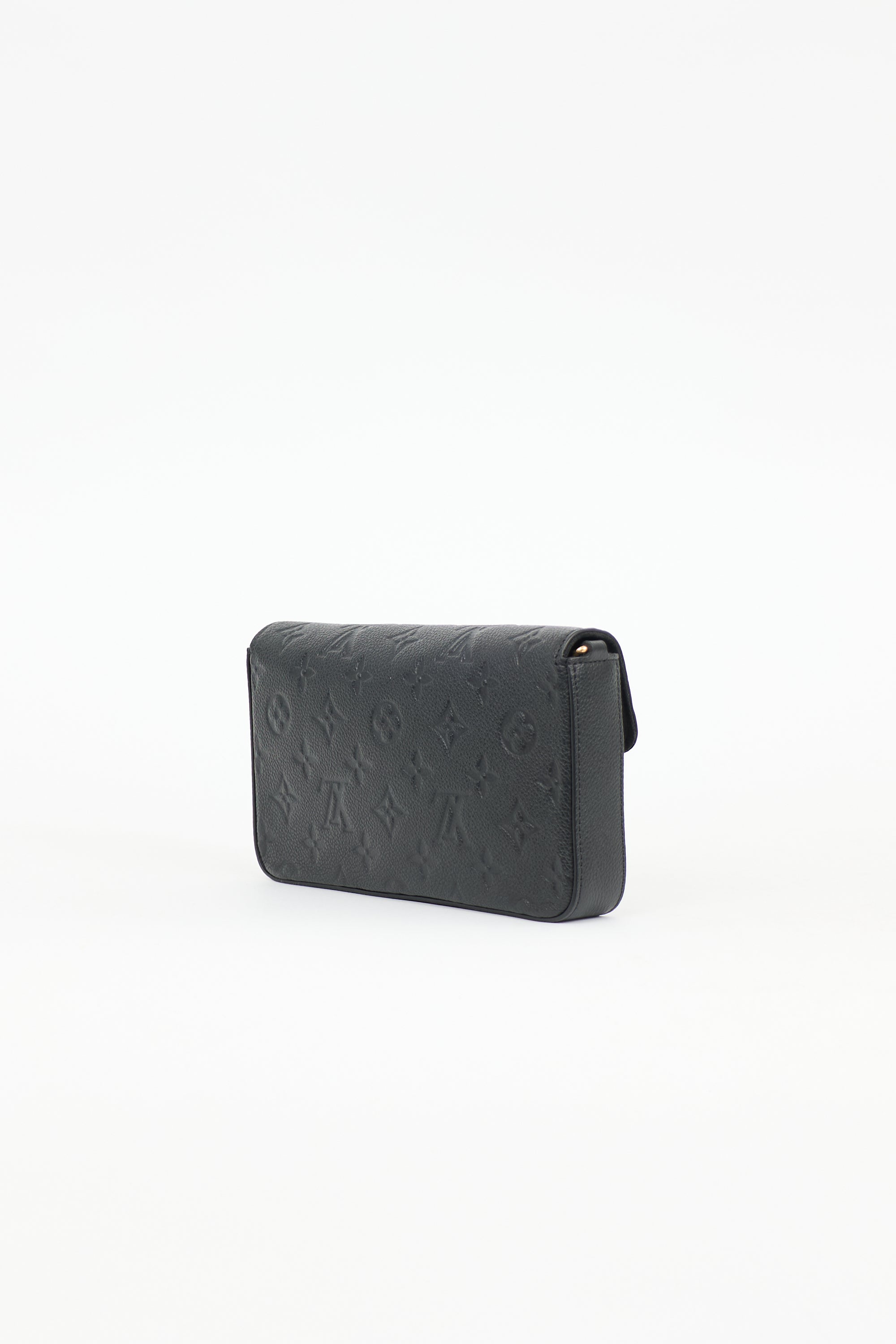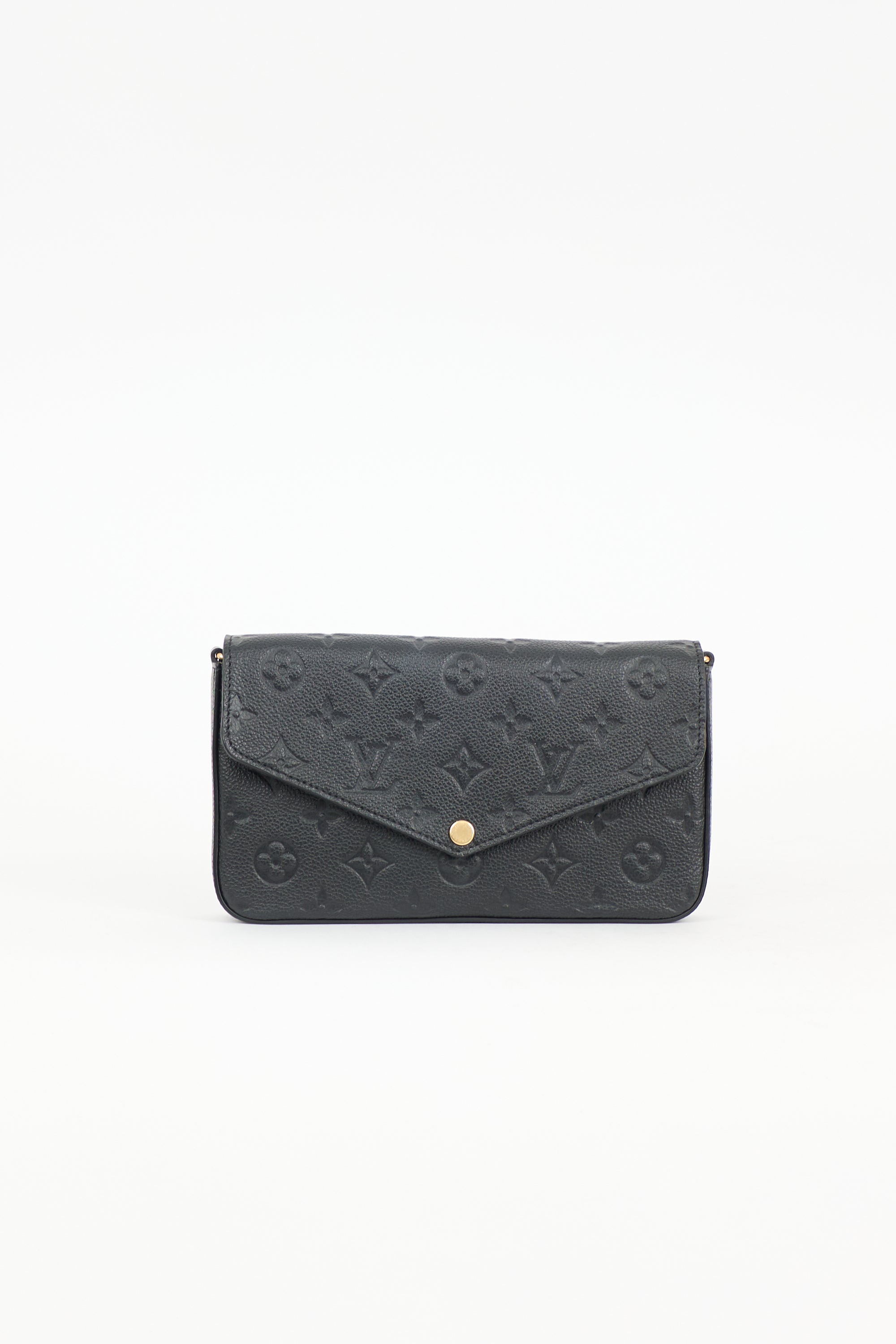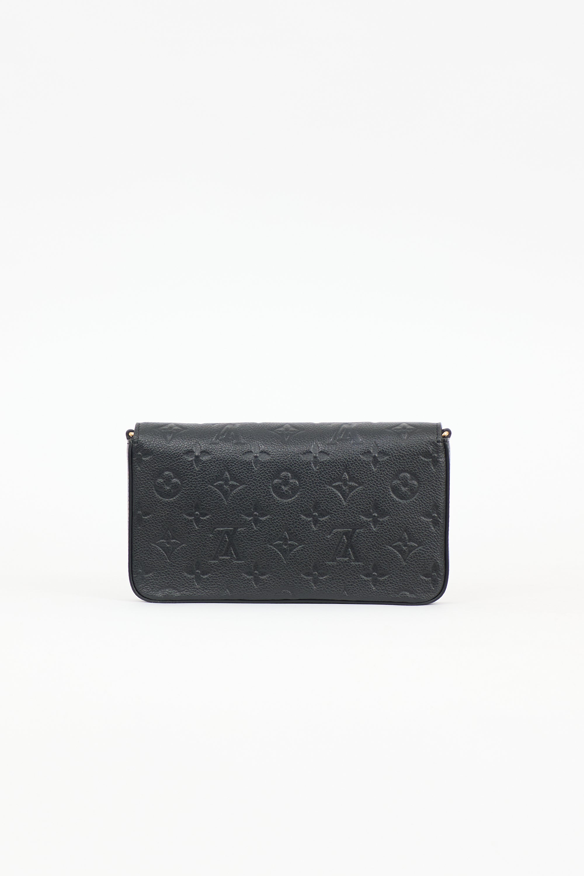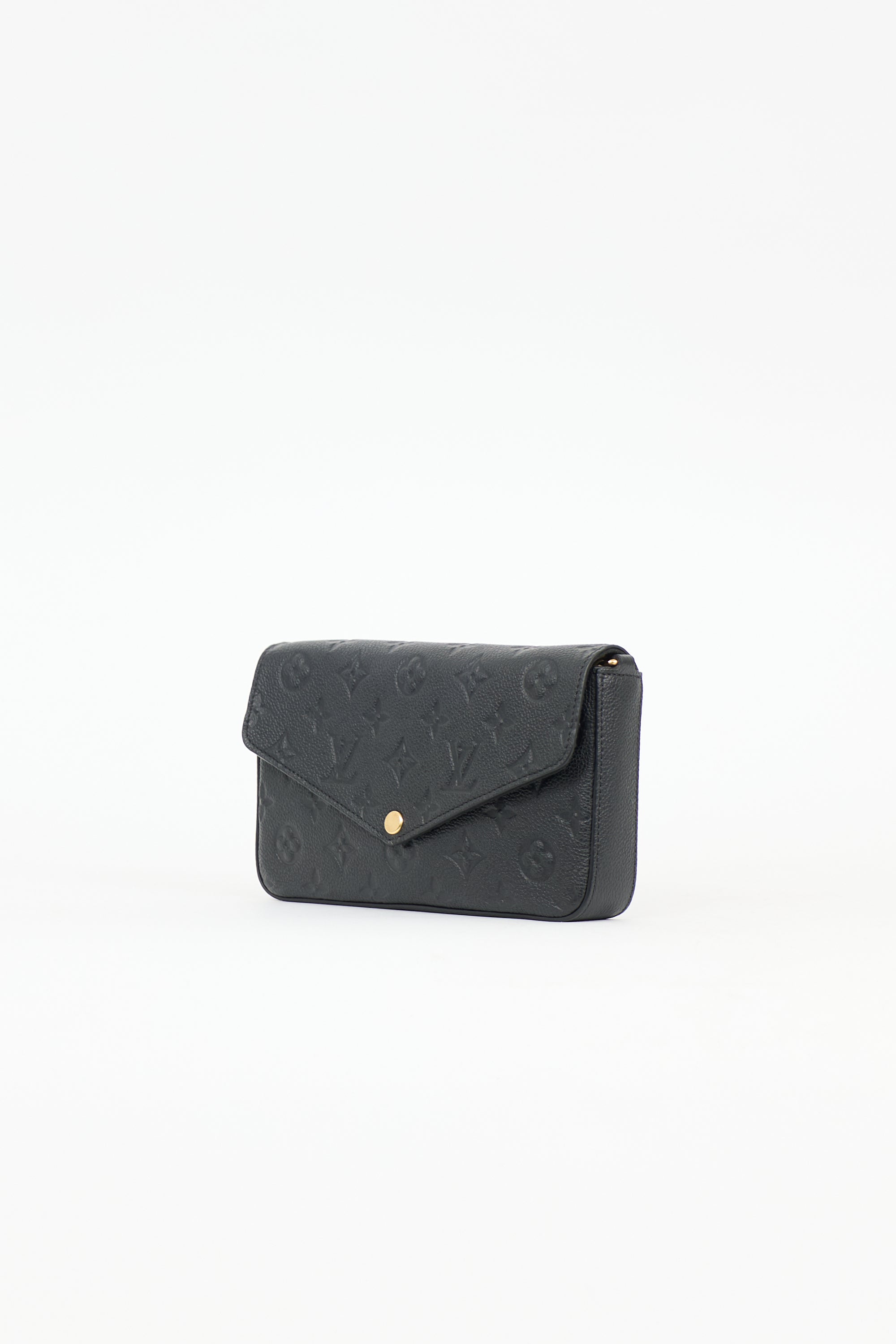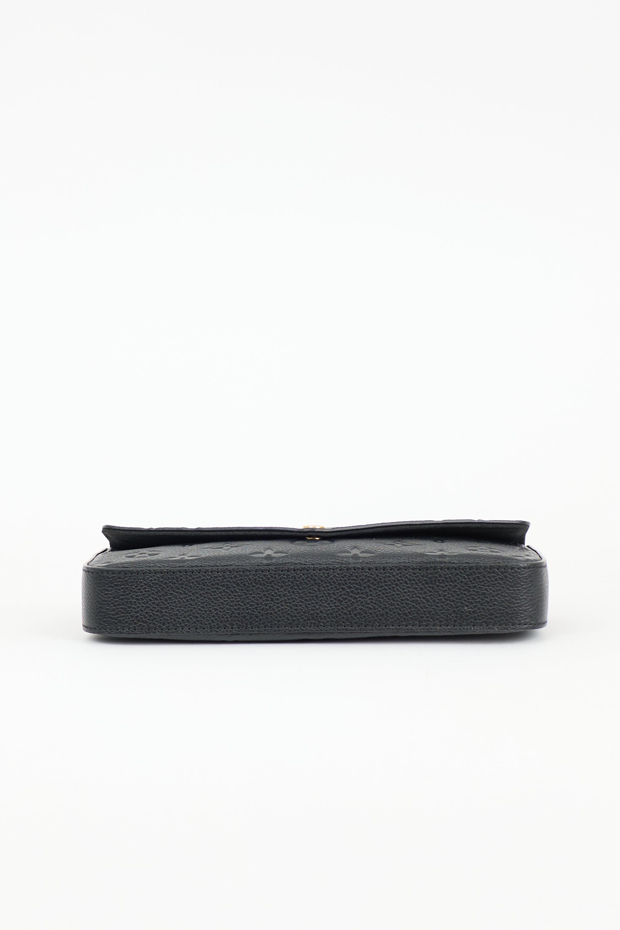 Pre-owned Louis Vuitton black empreinte leather Félicie Pochette bag featuring debossed monogram, gold tone hardware, removable chain strap, front flap with snap button closure, and one lined main compartment with one slip pocket. Does not come with insert.