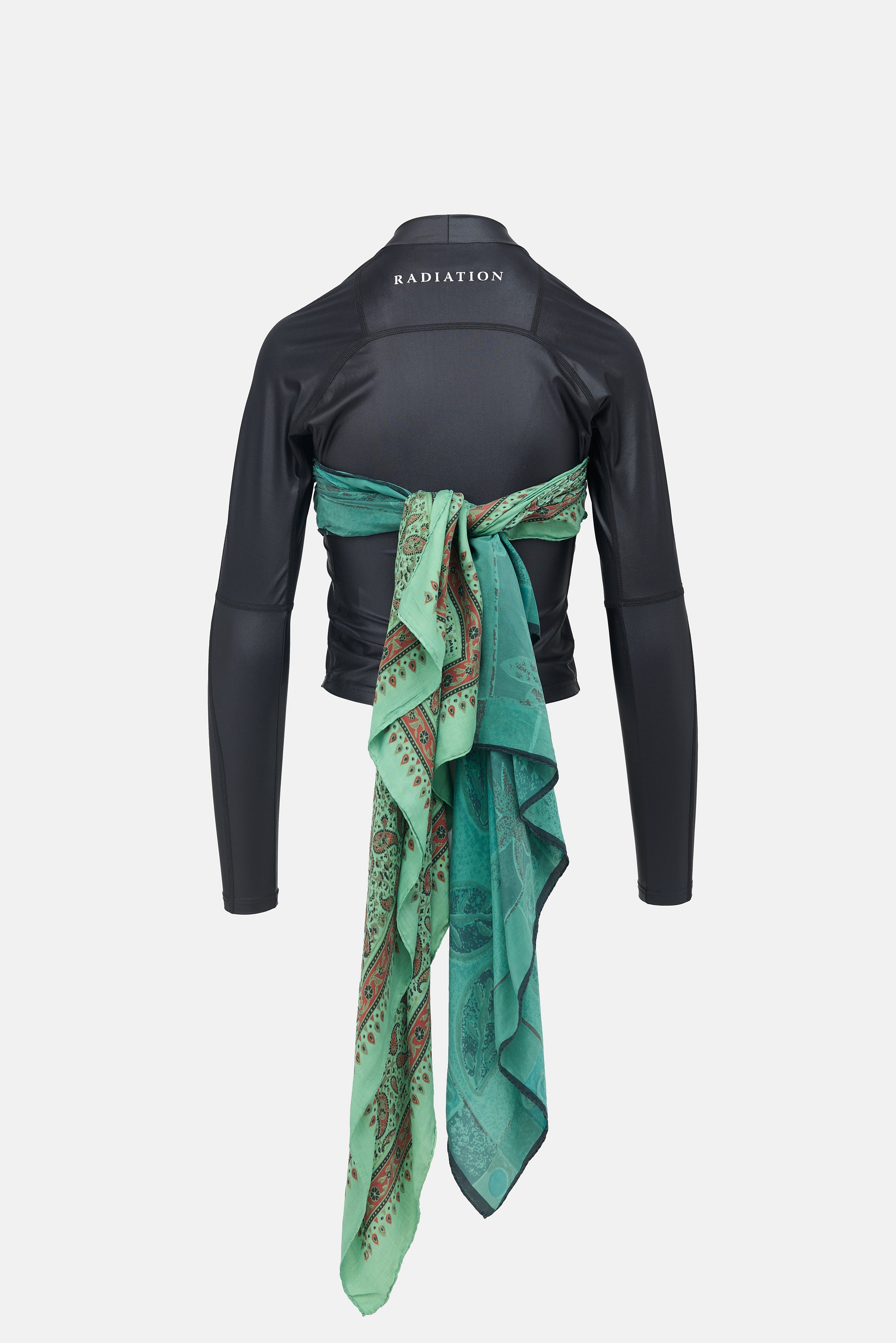 Pre-owned Marine Serre black spandex top featuring a mock neck, signature crescent moon printed logo at chest, green silk scarf detail at bust with asymmetric drape, and graphic text printed at back collar.