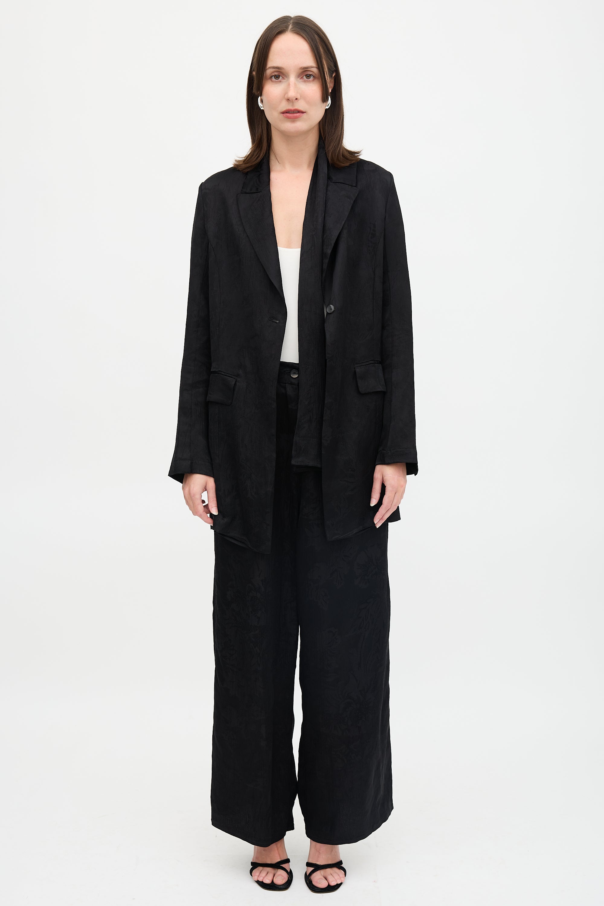Pre-owned Masnada black linen blend blazer featuring floral jacquard, peak collar with sash design, single button front, two front flaps, open back with button closure, and buttoned cuffs.