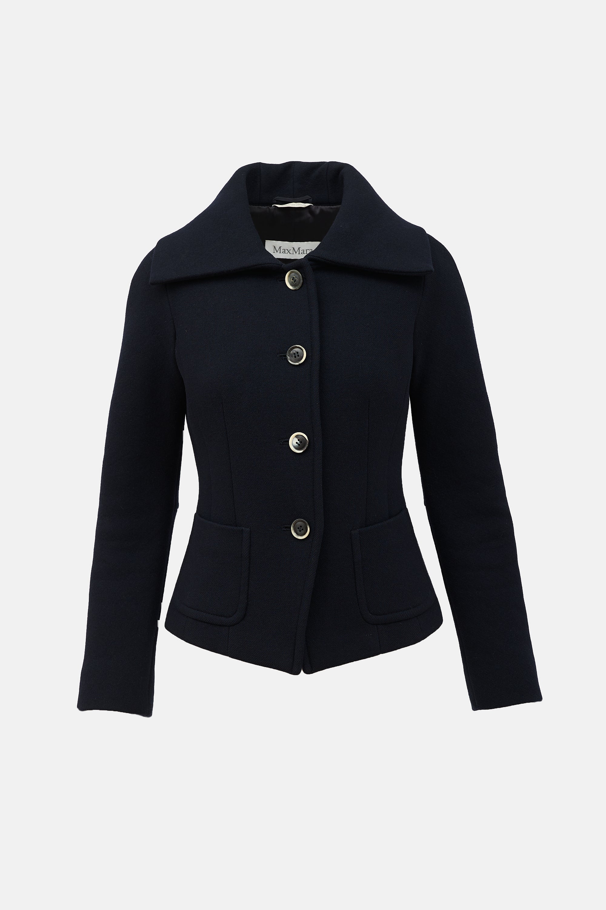 Pre-owned Max Mara black wool blend jacket featuring wide collar, button up front, and two front patch pockets. Lined.