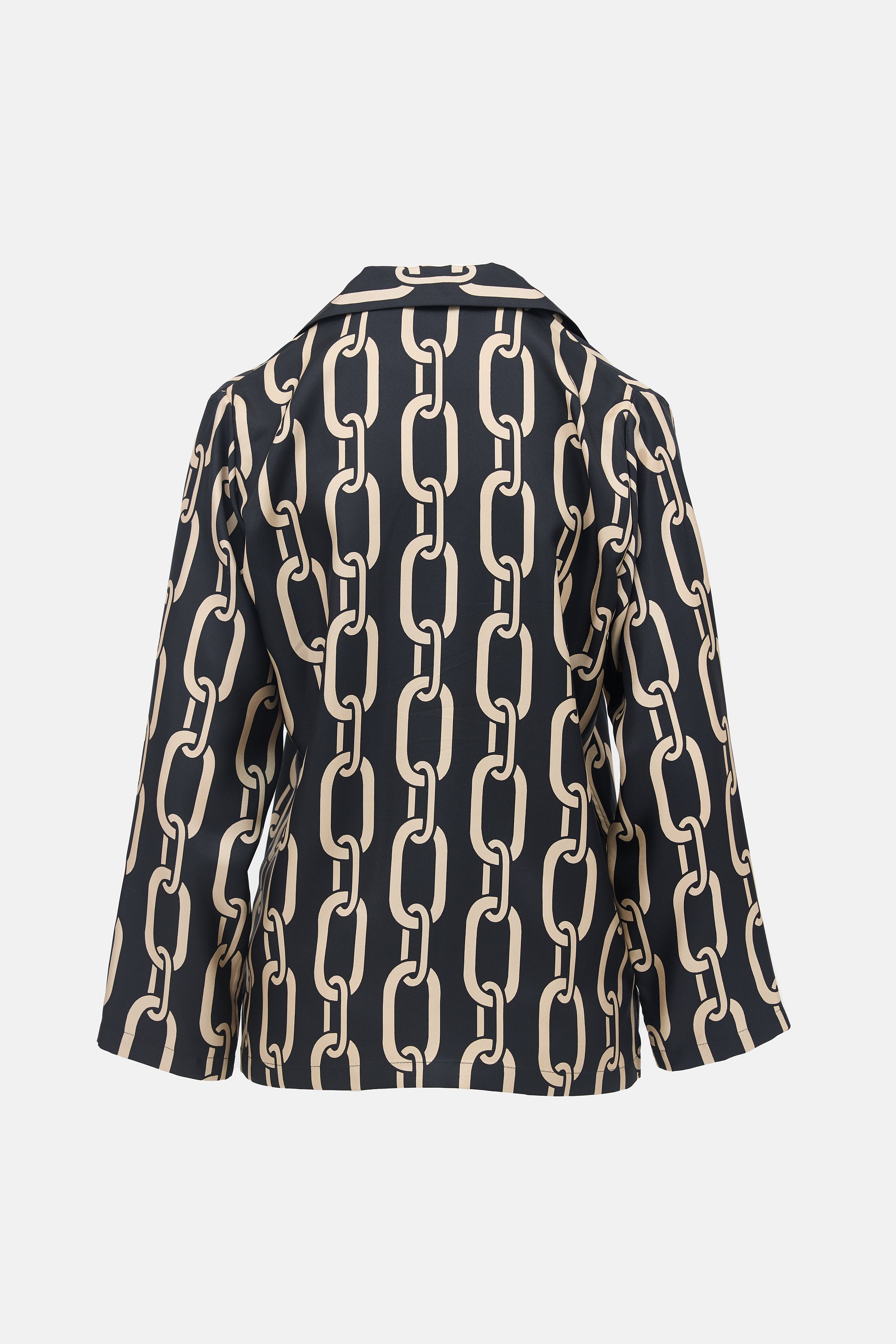 Pre-owned Nili Lotan black and gold silk Juste shirt featuring a large chain print throughout, notched lapel, one welt pocket at chest, button front, and side slits.