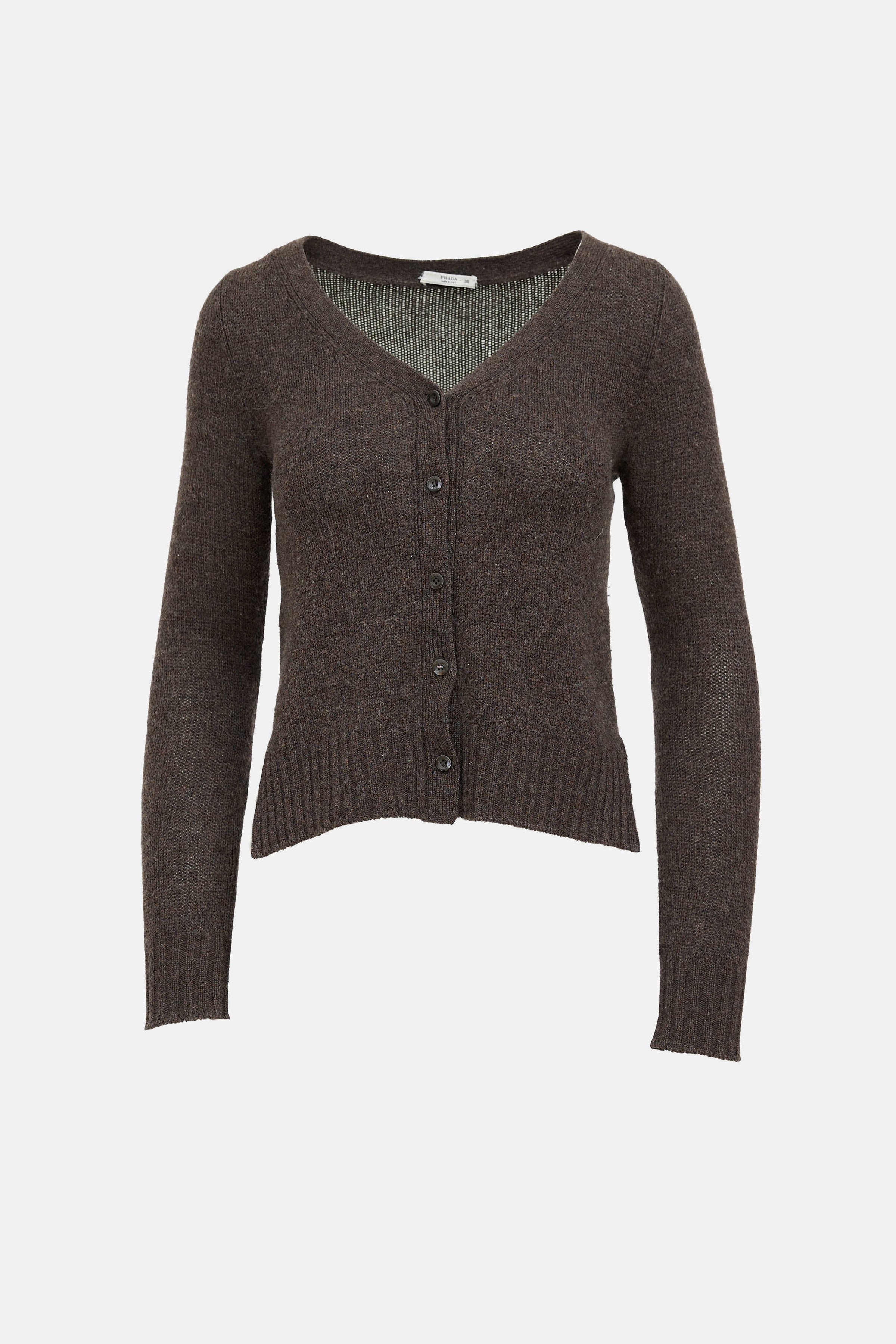 Pre-owned Prada brown knit cardigan featuring a V-neckline, long sleeves with tonal suede elbow pads, ribbed hem, and button up closure.