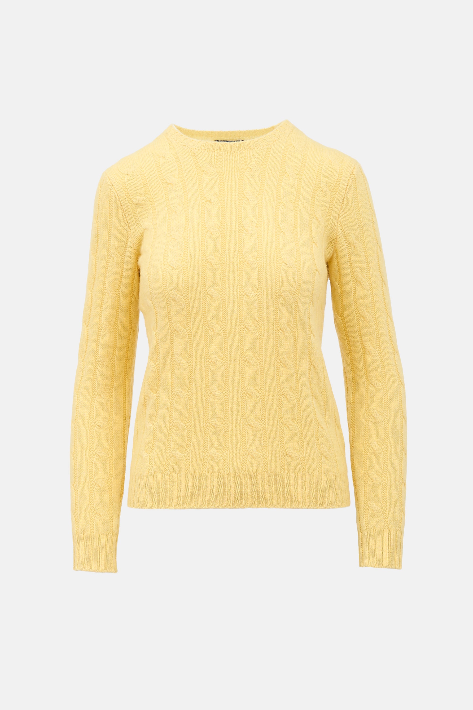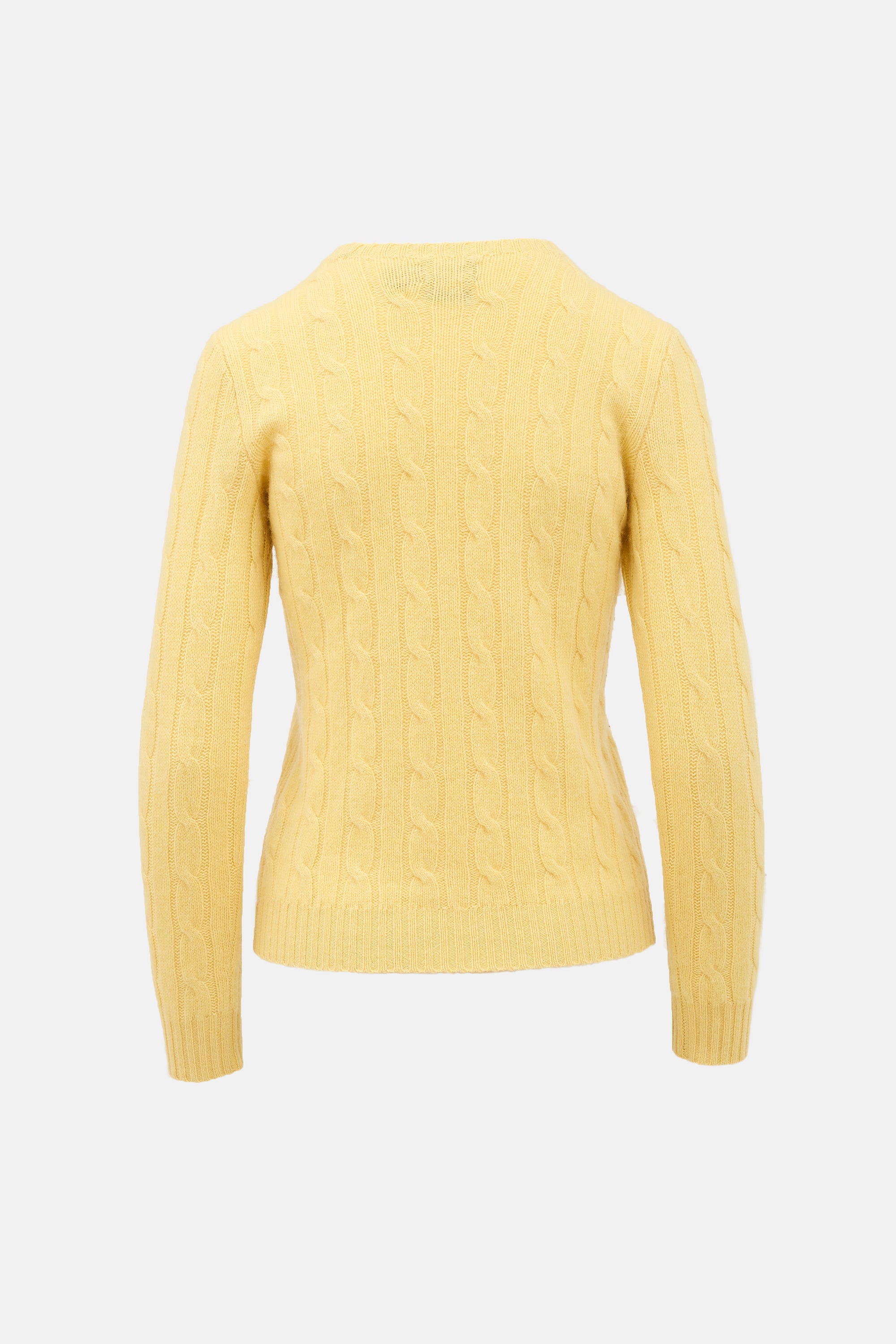 Pre-owned Ralph Lauren Polo yellow cashmere sweater featuring crew neck, cable knit, and ribbed collar, hem, and cuffs.