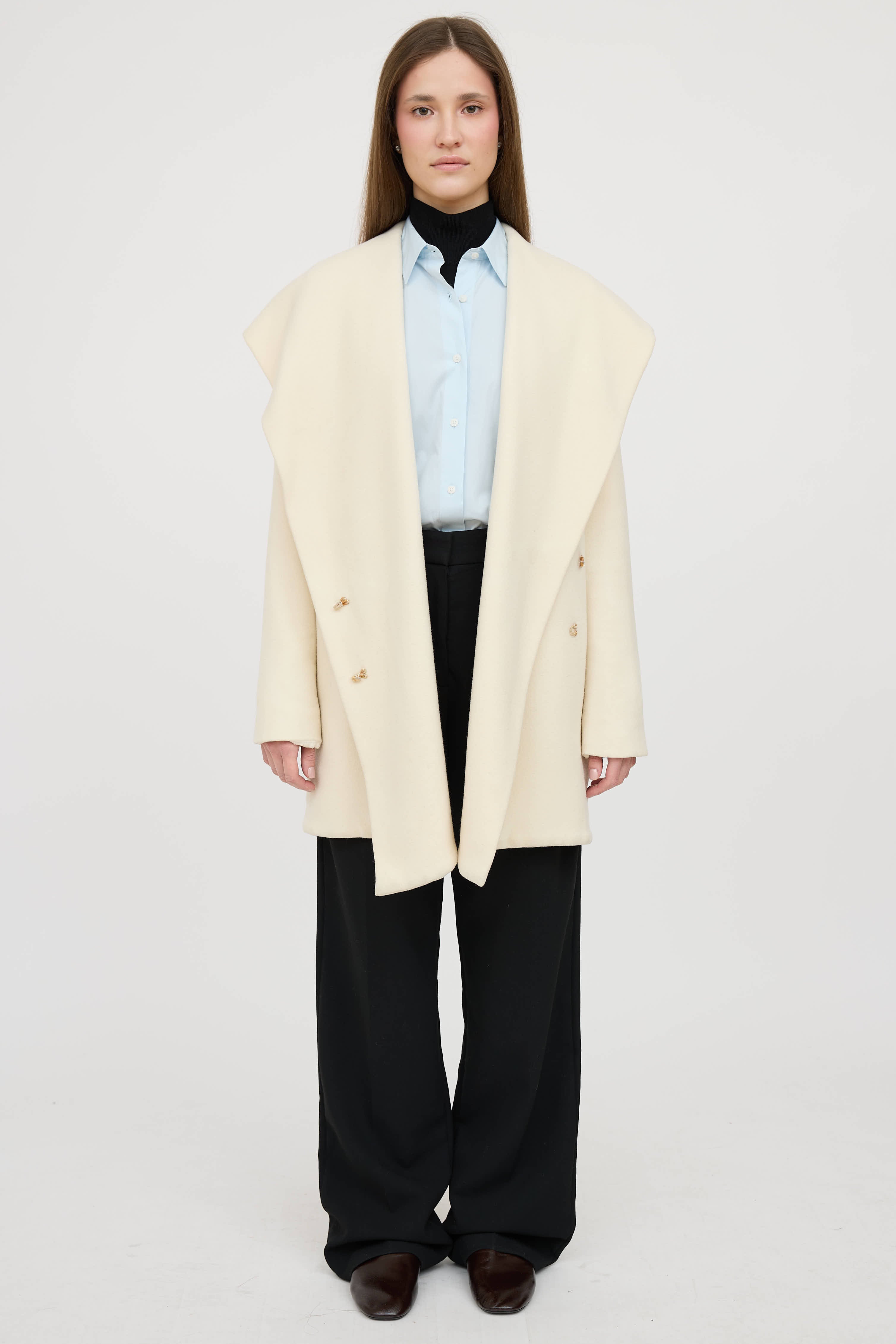 Pre-owned The Row cream hooded wrap coat featuring shawl lapel collar and hook and eye closure.
