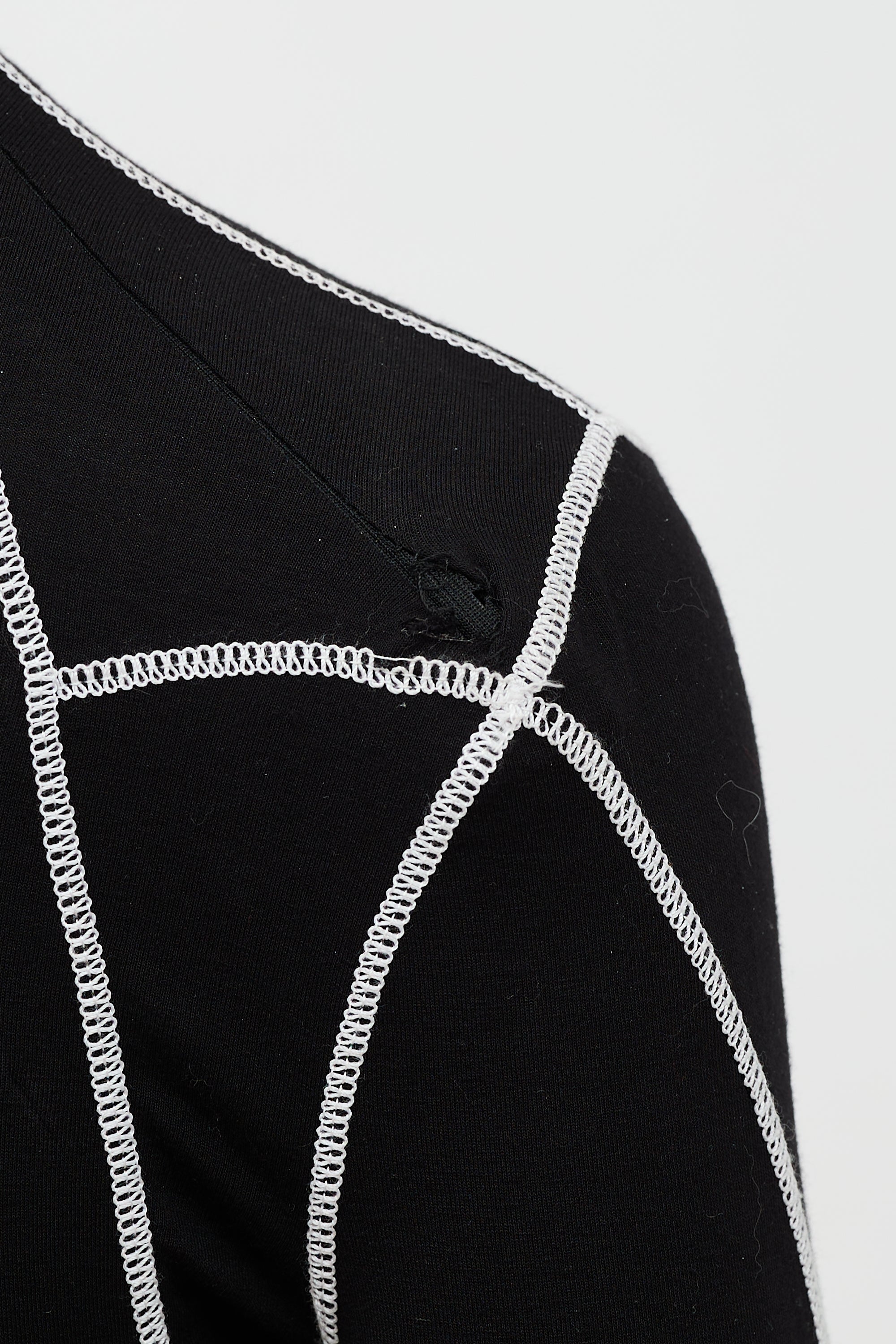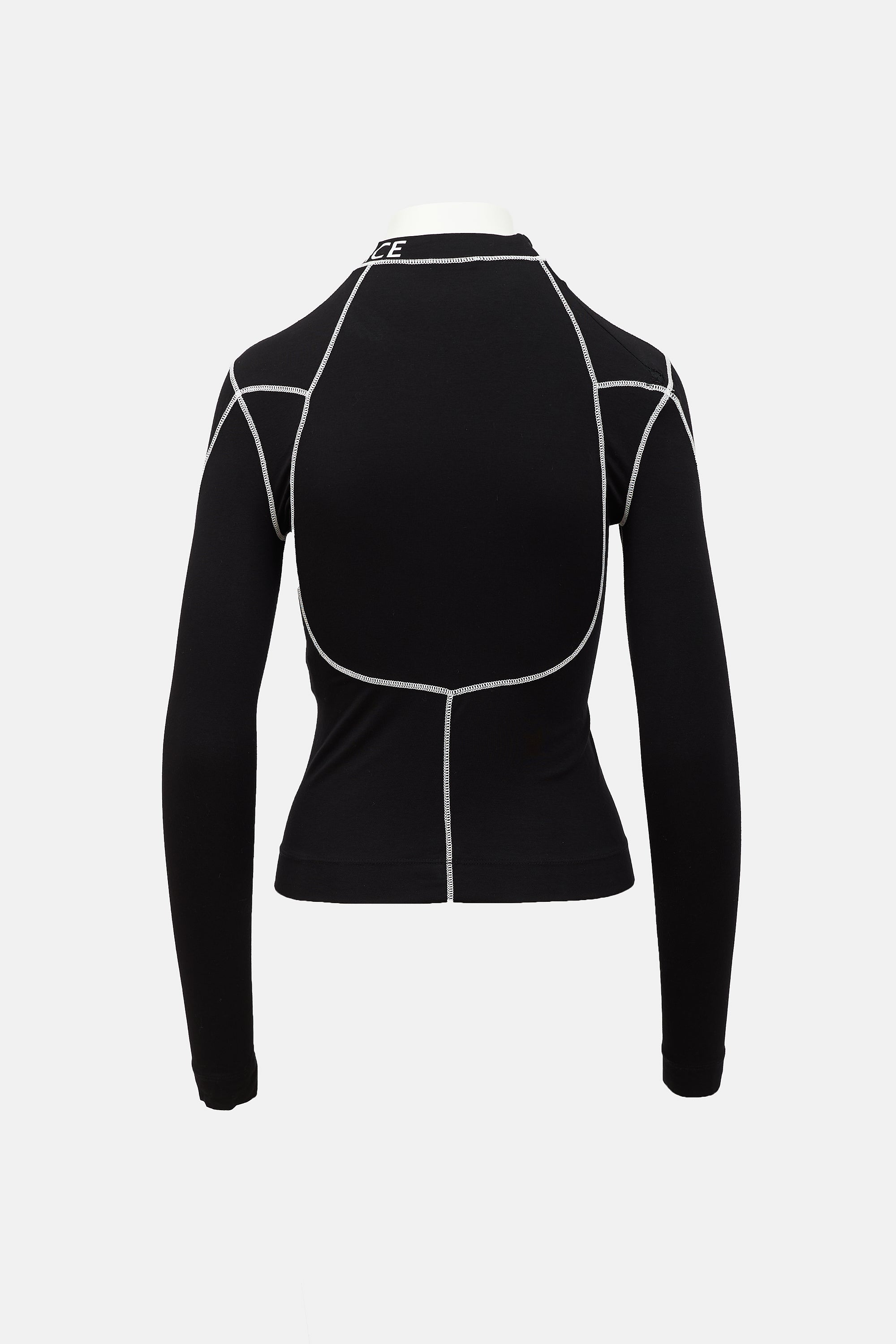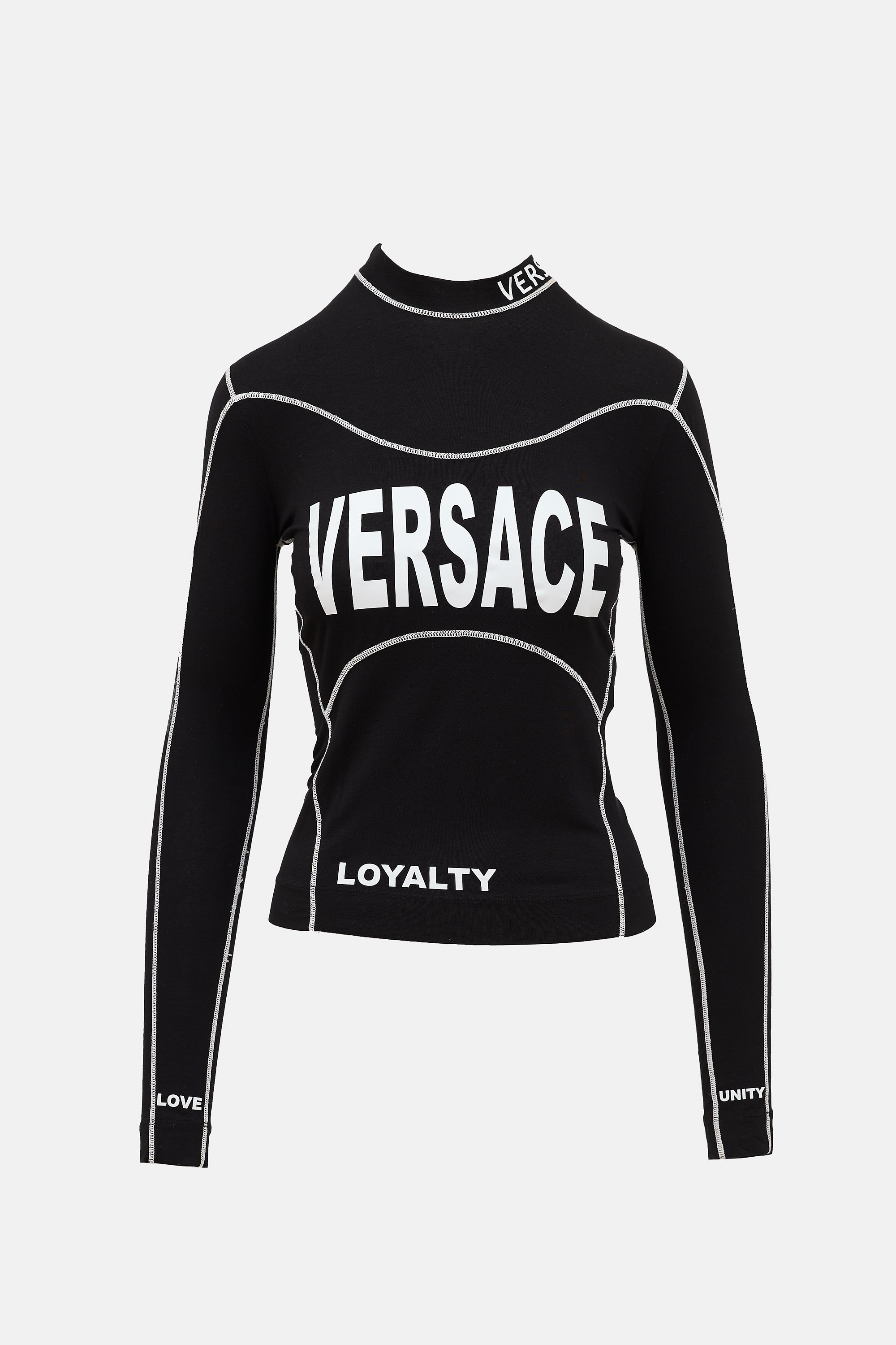Pre-owned Versace black and white top featuring mock neck, zipped right shoulder, printed lettering throughout, and exposed seams.