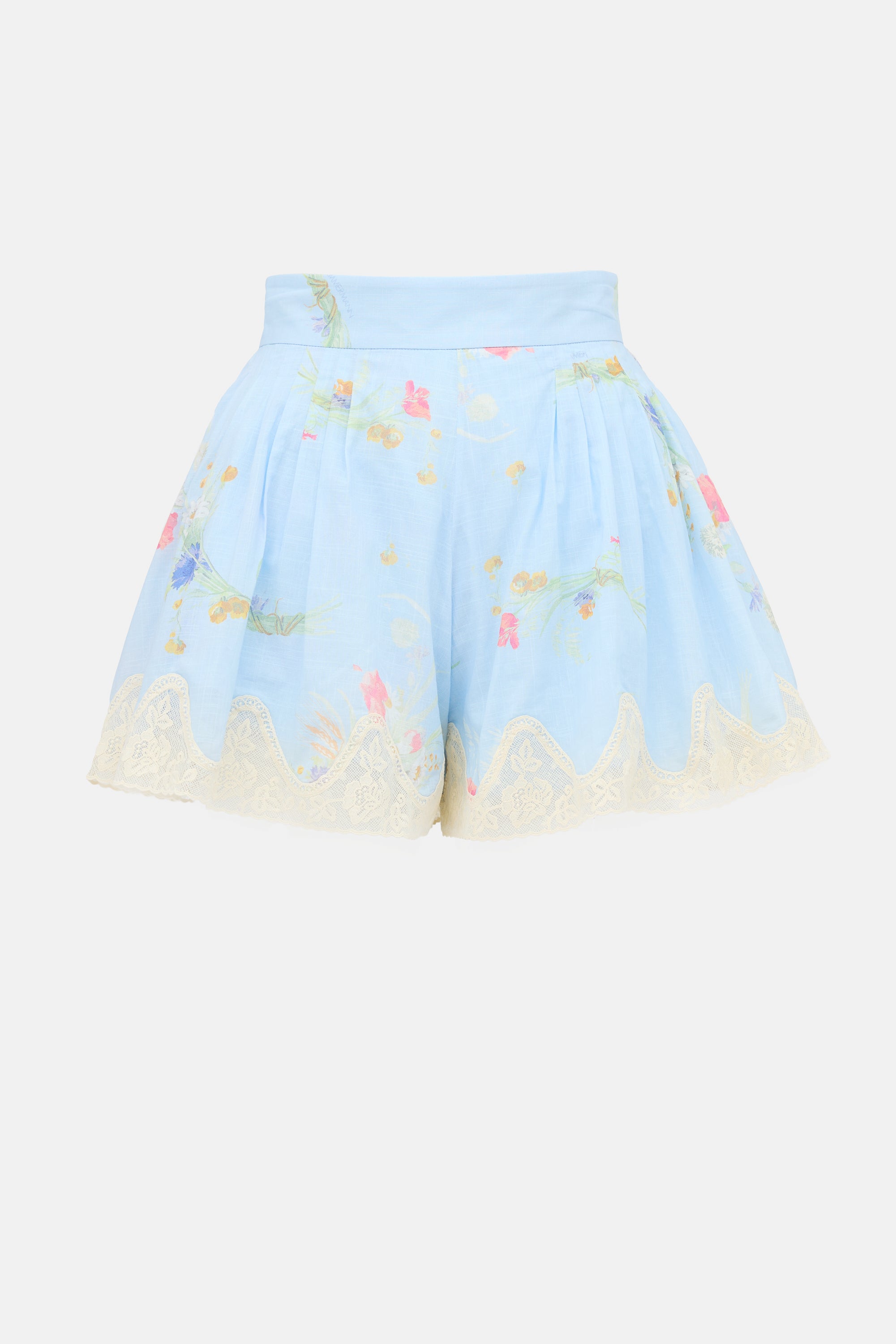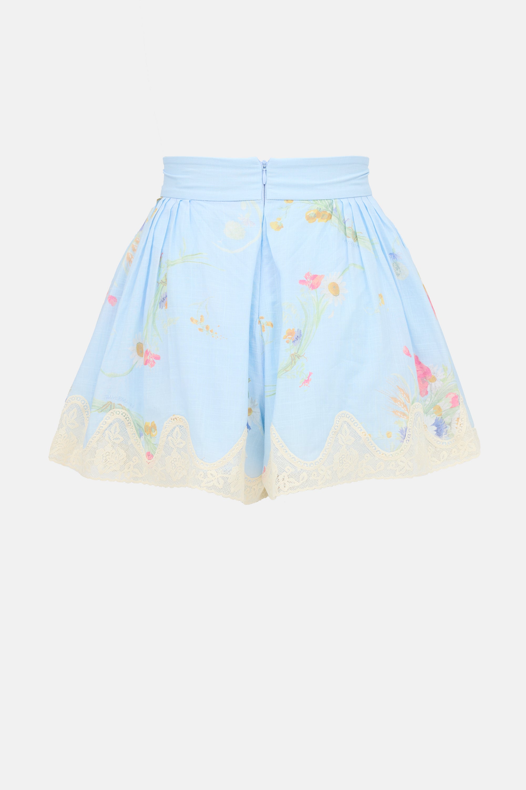Pre-owned Zimmermann blue pleated Lucky shorts featuring a back zip closure, floral motif throughout, two inseam pockets, and a lace hem.