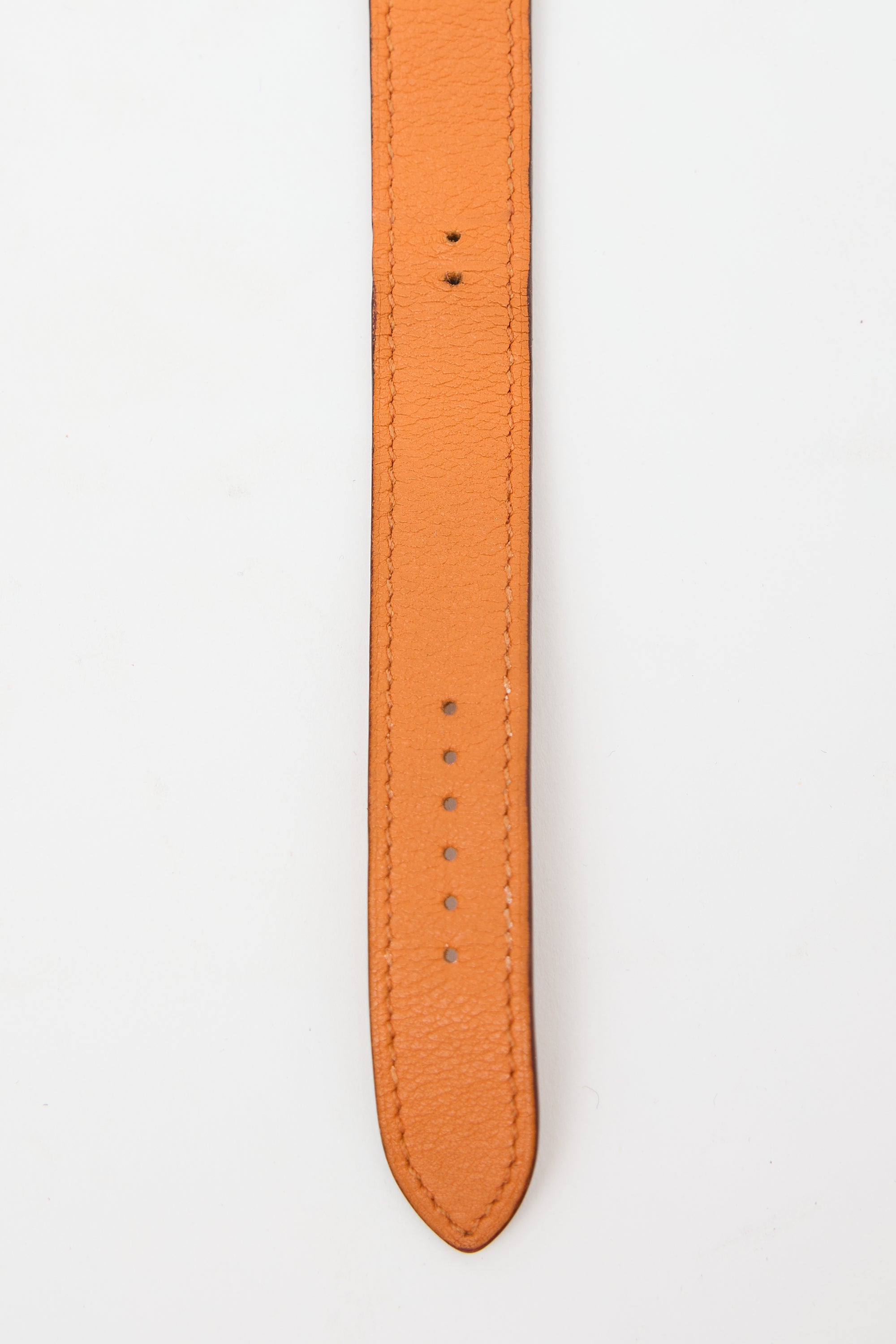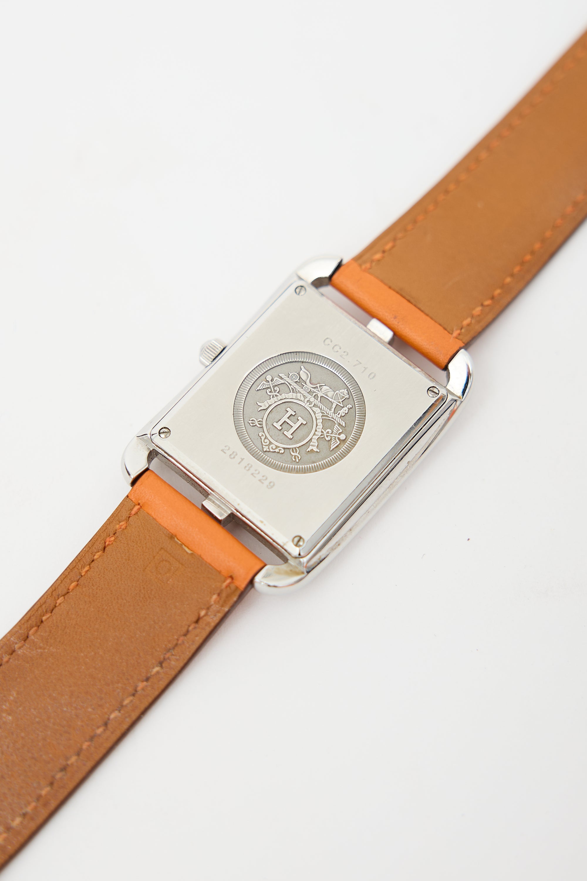 Pre-owned Hermès 2011 Cape Cod Double Tour watch featuring orange Swift leather wraparound band, 28mm stainless steel square case, quartz movement, opaline silvered dial, and stamped logo at reverse. Comes with original case and care guides.