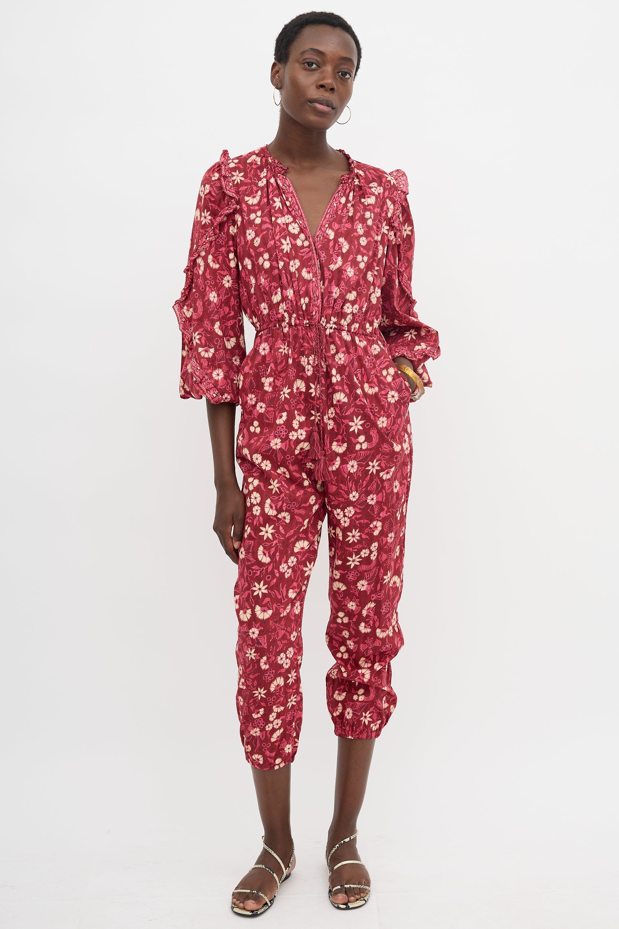 Pre-owned Ulla Johnson burgundy, fuchsia, and cream Delphine jumpsuit featuring floral print, split neckline with tie, concealed button up front, drawstring waist, tassels at tie ends, elasticized hem and cuffs, and ruffle trim.