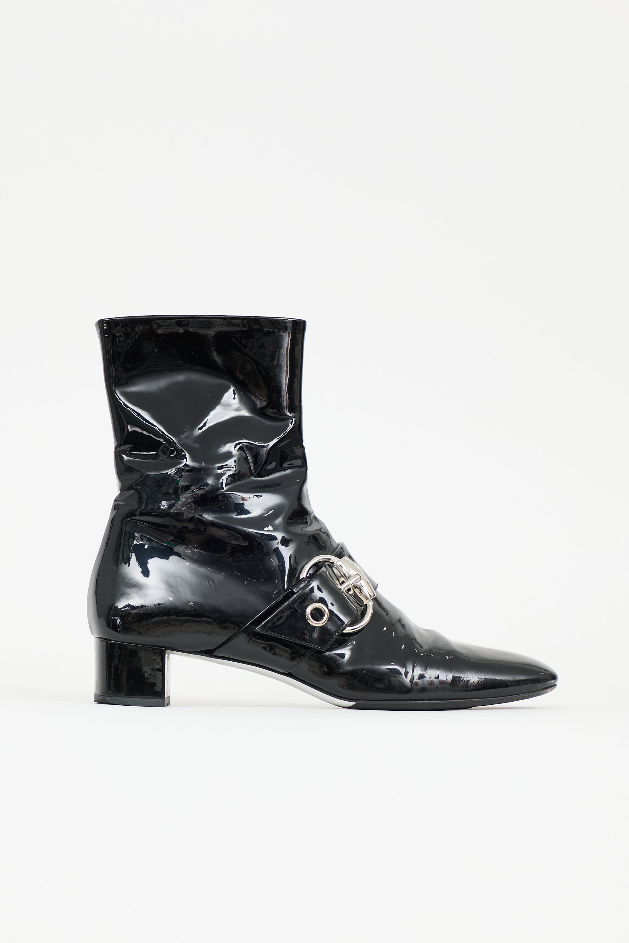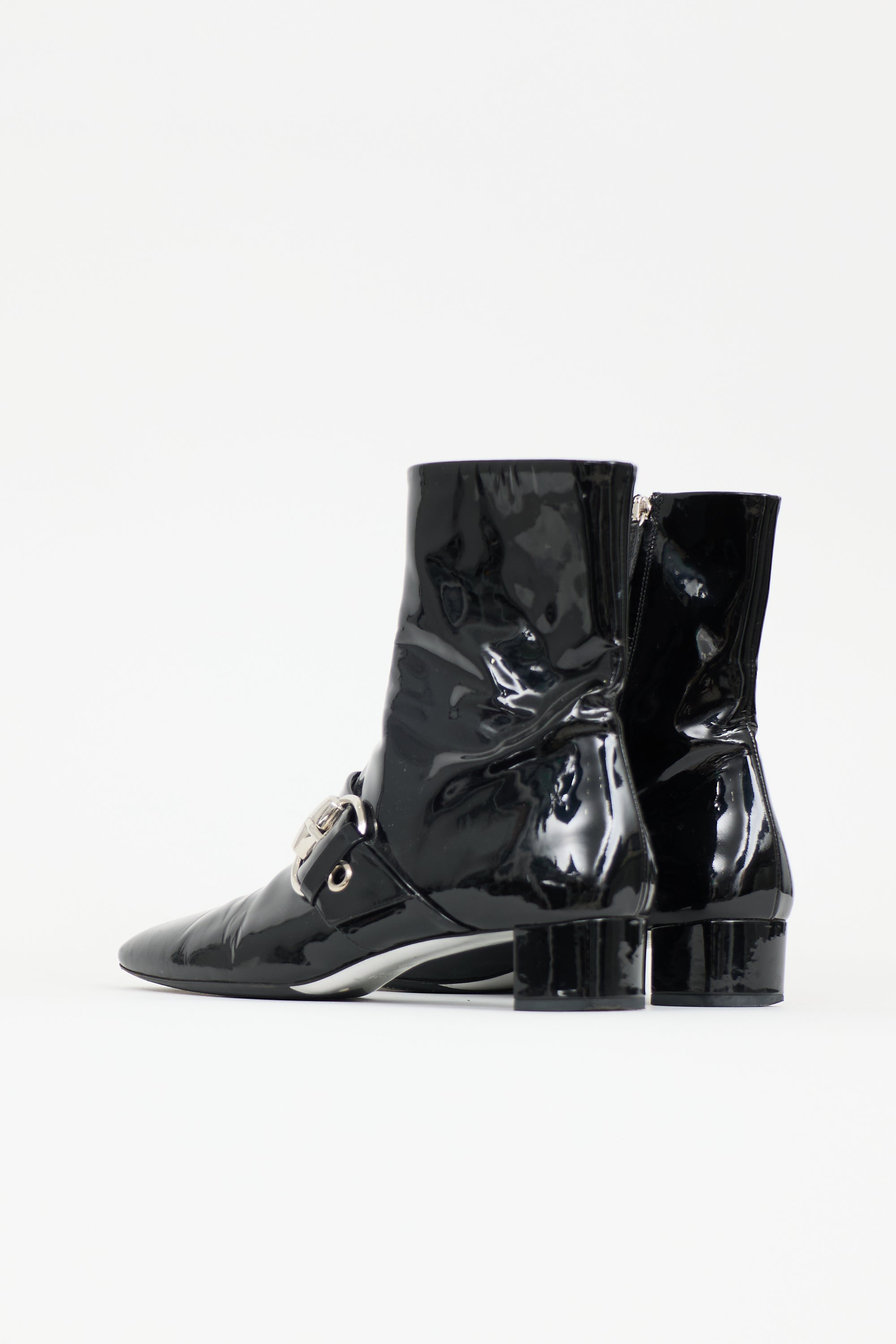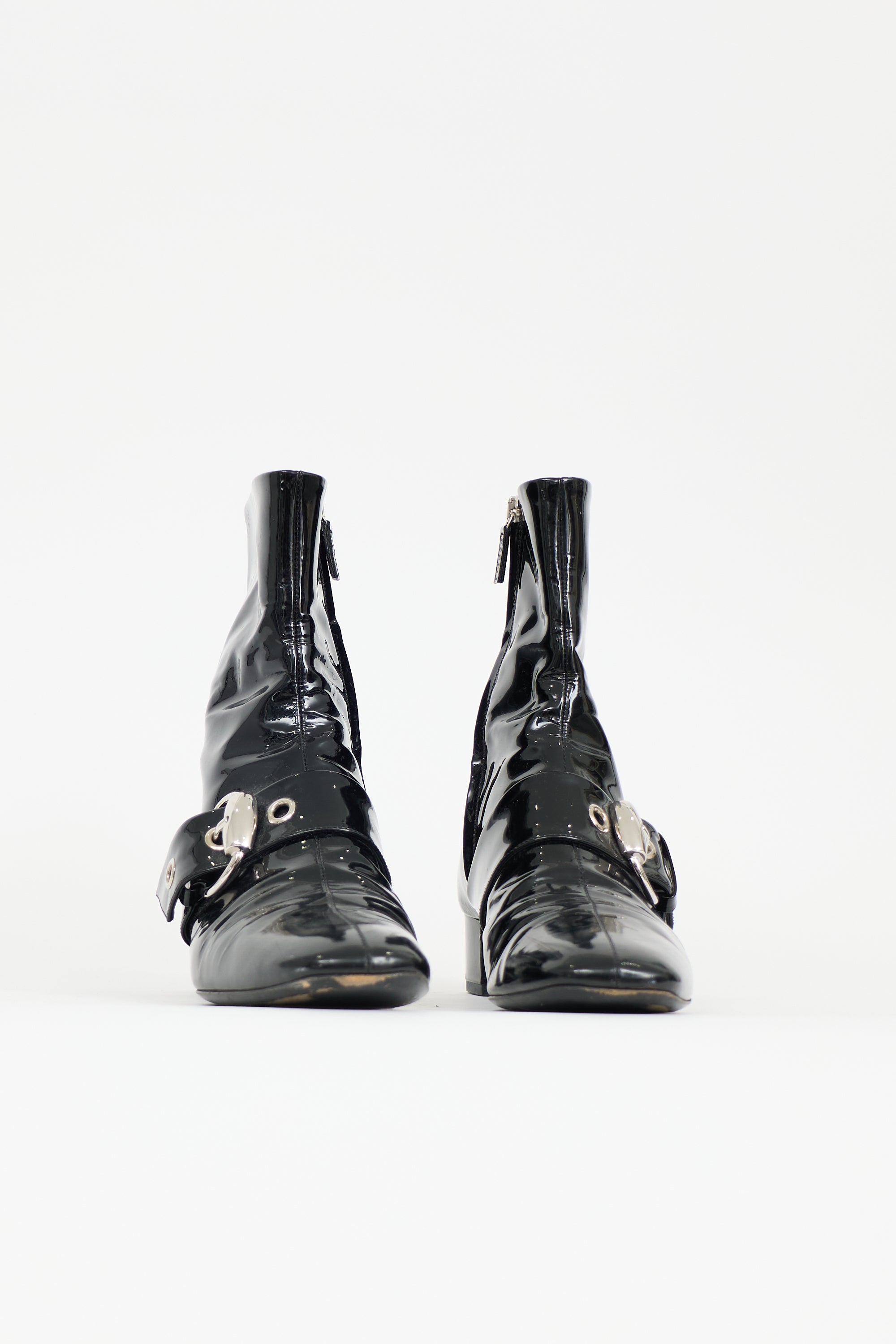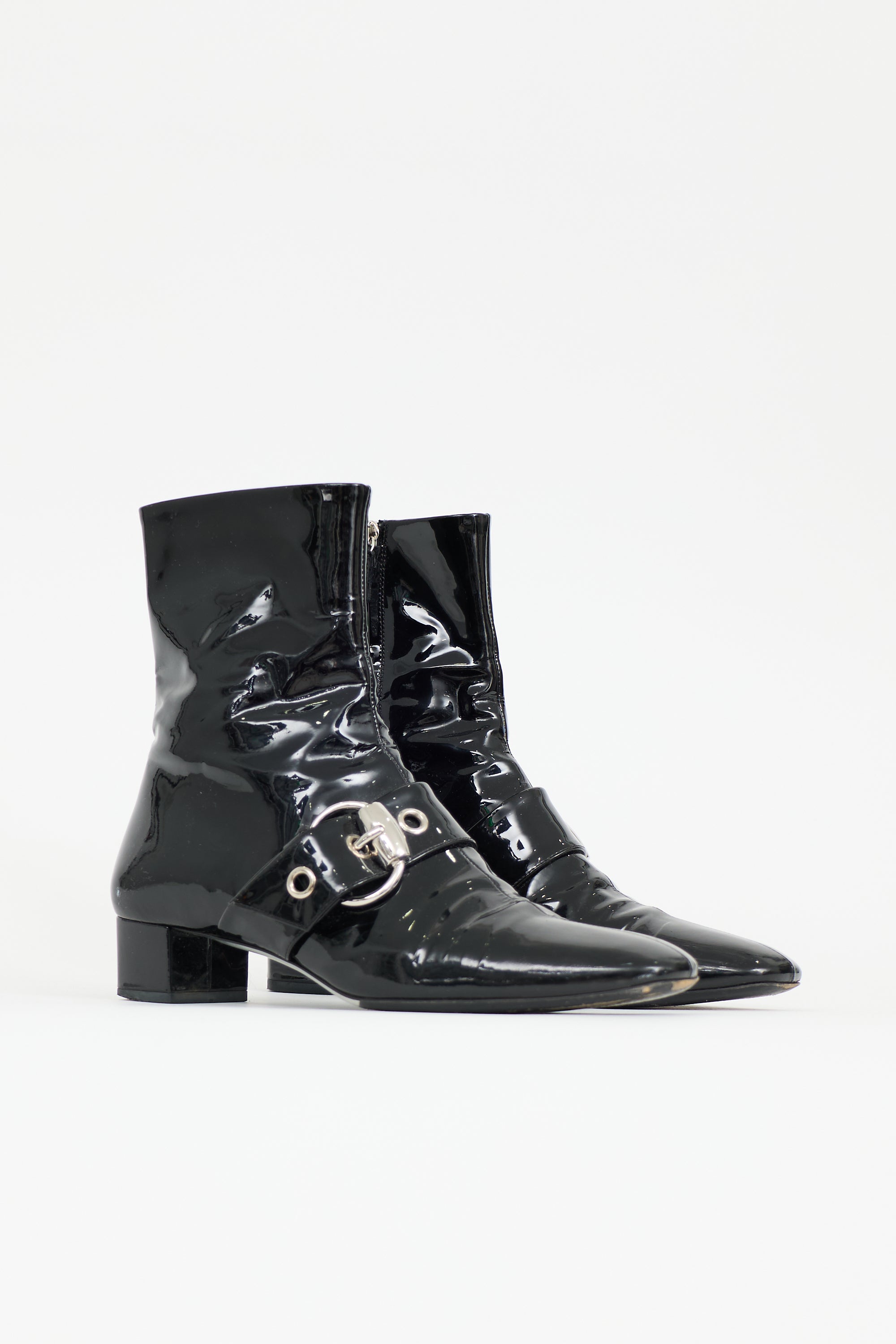 Pre-owned Gucci black patent leather boots featuring tapered square toe, silver tone buckled strap at vamp, zip closure at side, and short block heel.