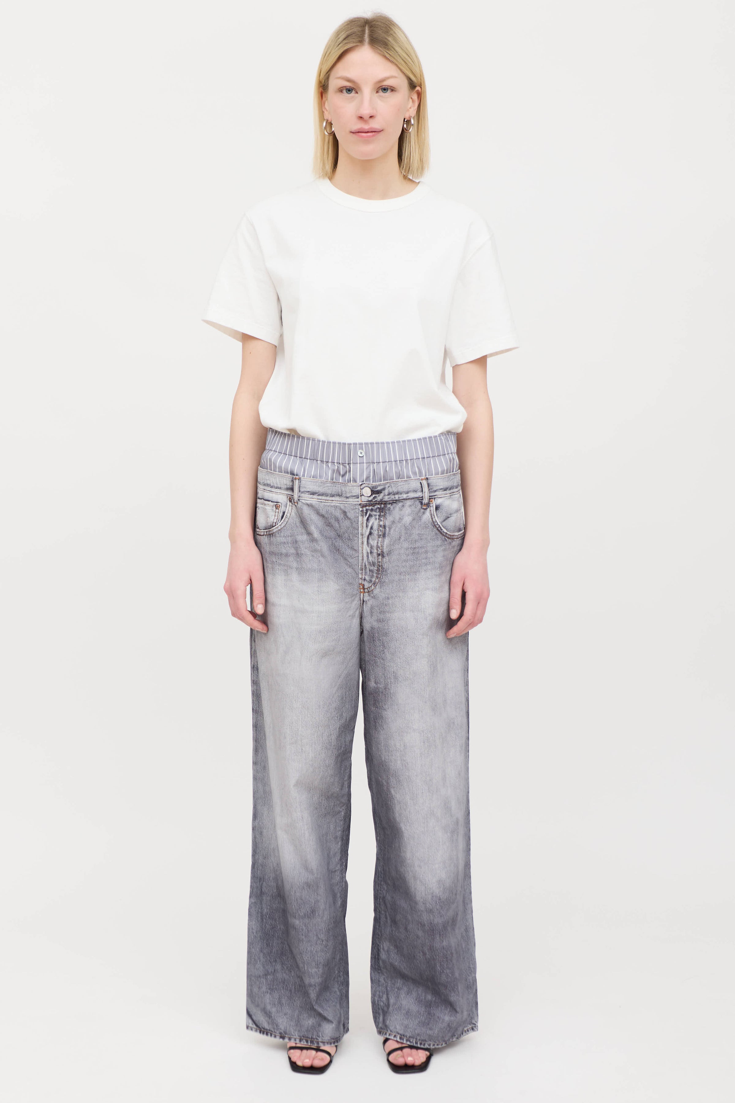 Pre-owned Acne Studios grey trouser featuring a distressed denim trompe l'oeil effect throughout, layered striped boxer at waist, two slip pockets at hip, faux logo patch at back, and wide leg.