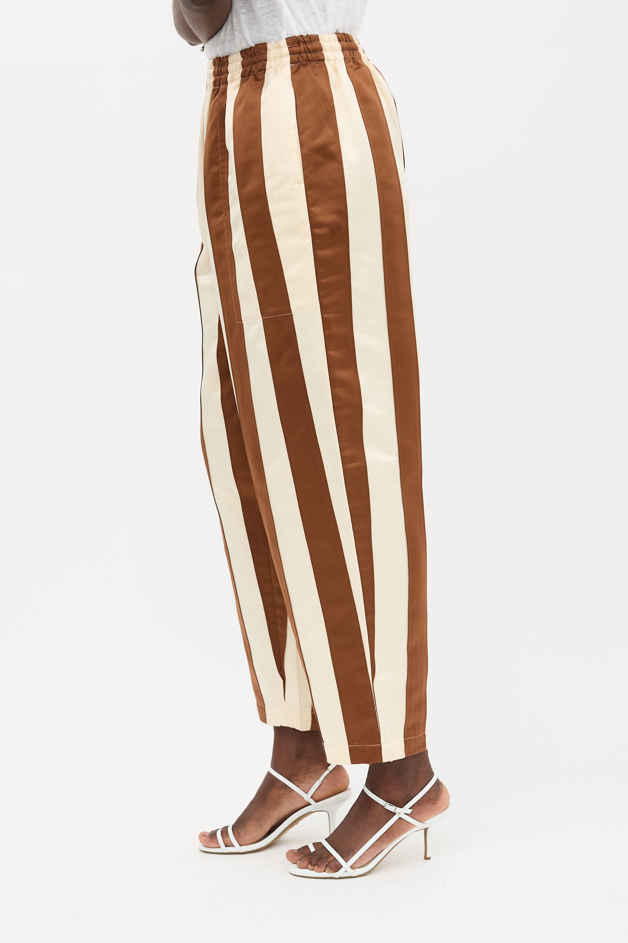 Pre-owned Bode cream and brown satin trousers featuring horizontal stripes, elasticized waistband, interior drawstring, tapered leg, three pocket styling, and zip fly.
