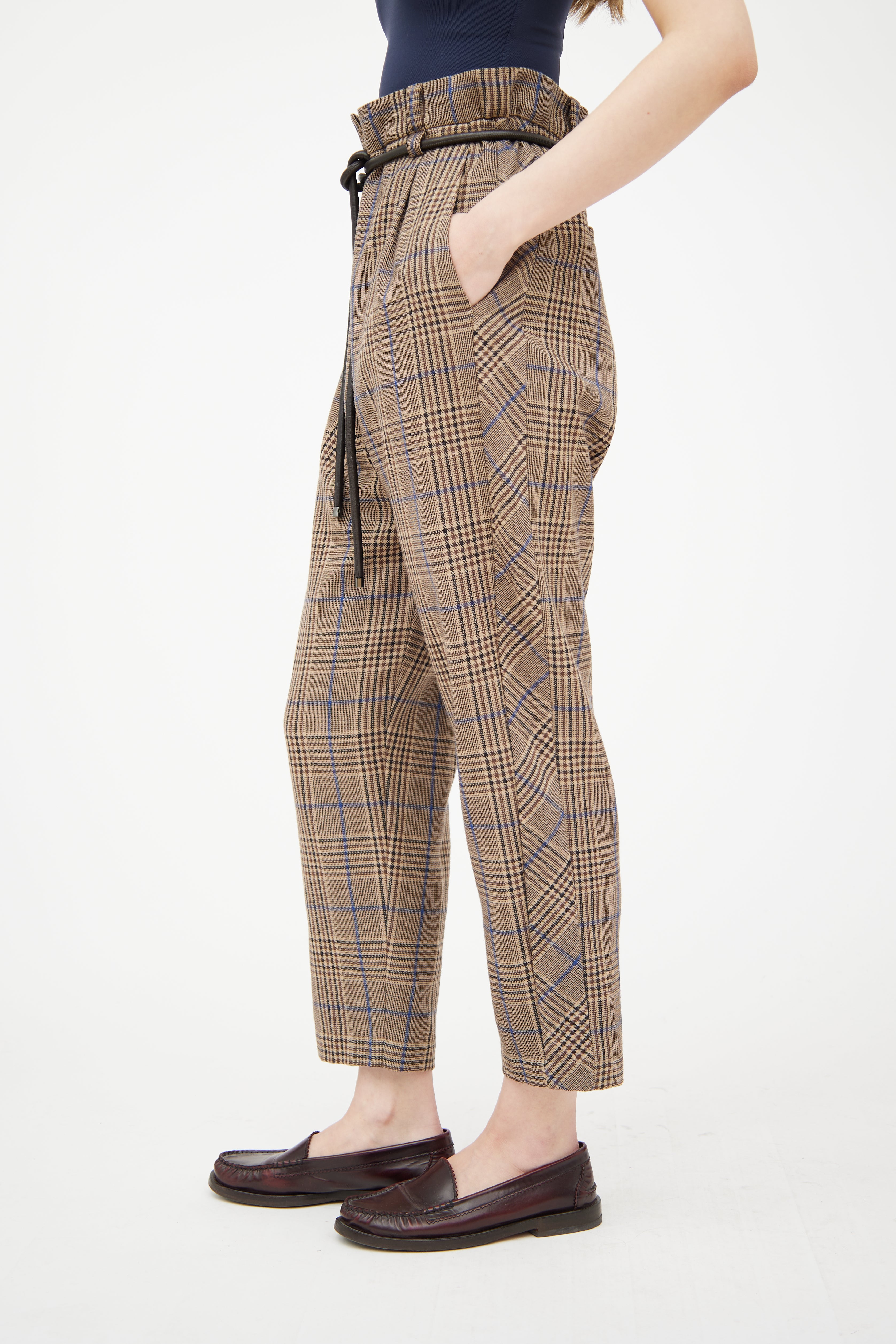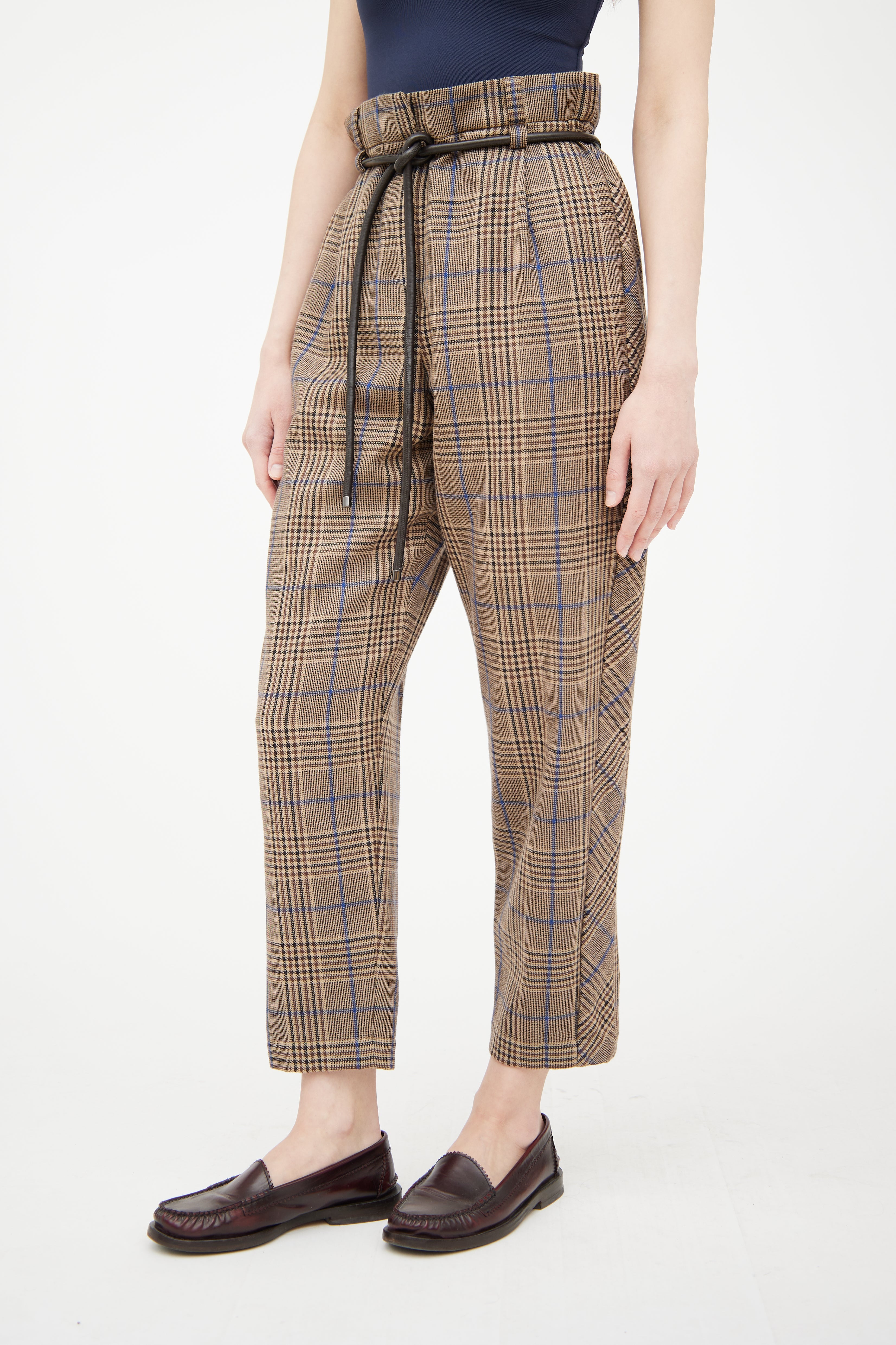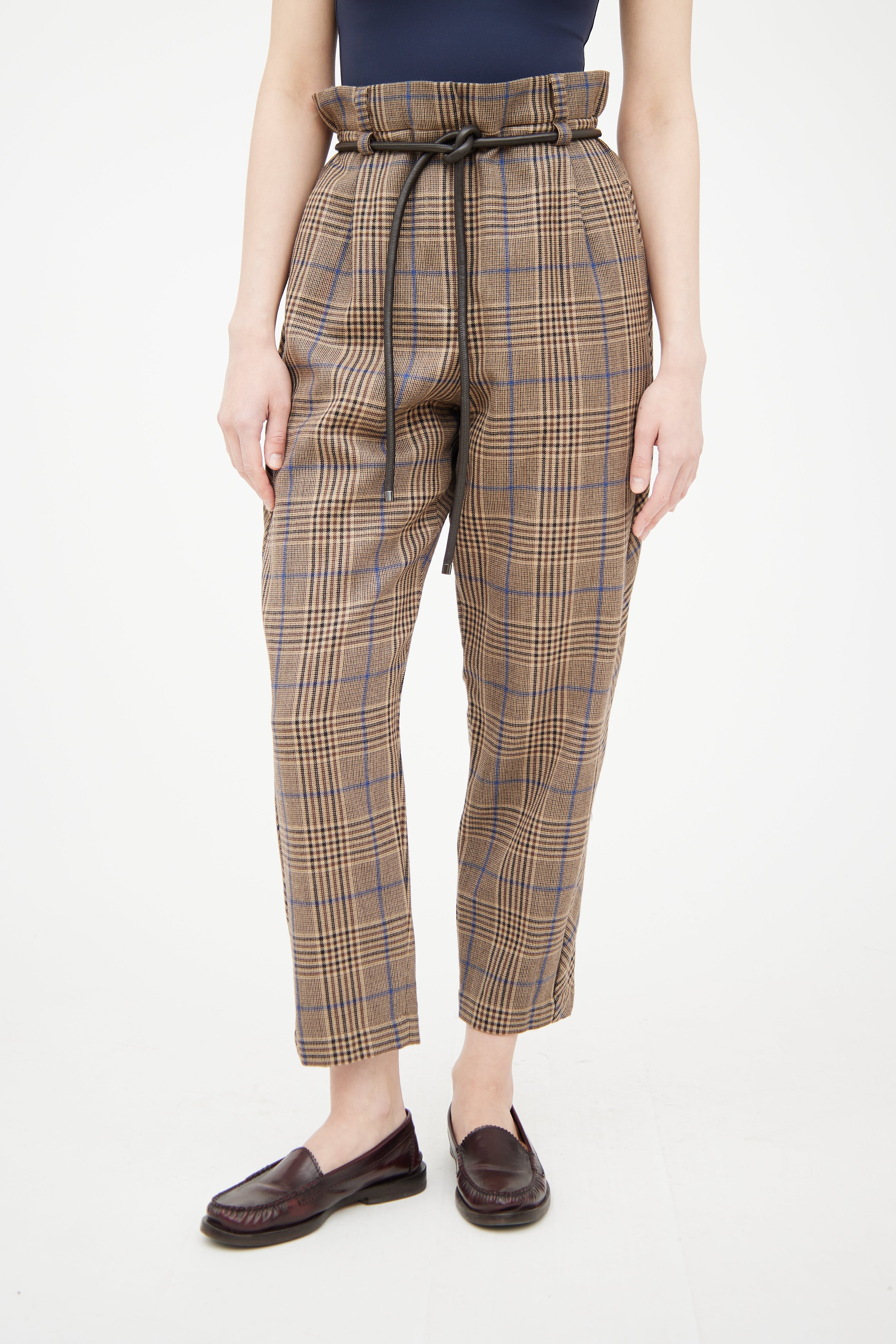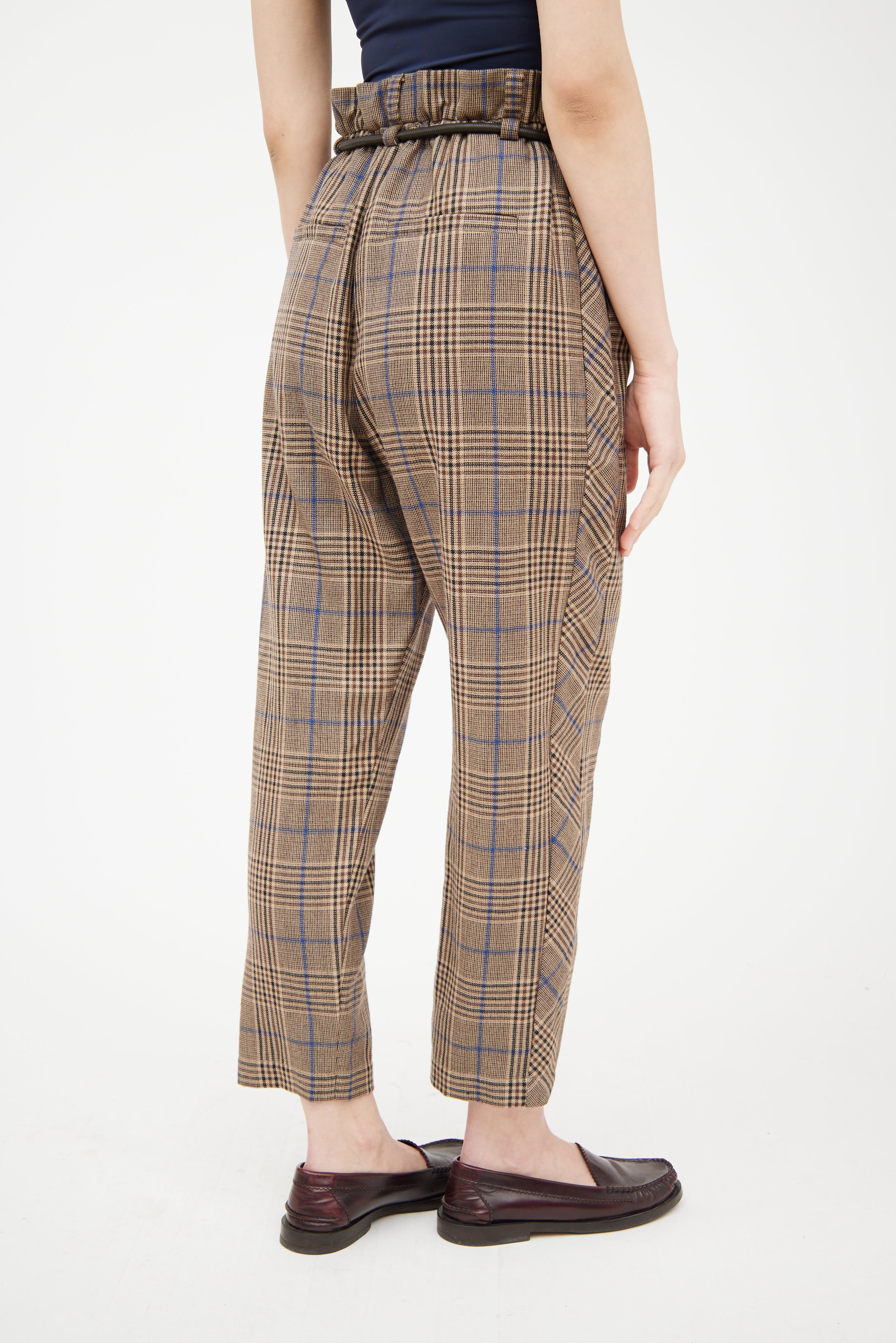 Pre-owned Brunello Cucinelli beige wool trousers featuring a multicolour plaid plaid pattern throughout, two slip pockets at hip, elastic waist with leather tie belt, tapered leg, centre pleat, and zip fly with snap closure.
