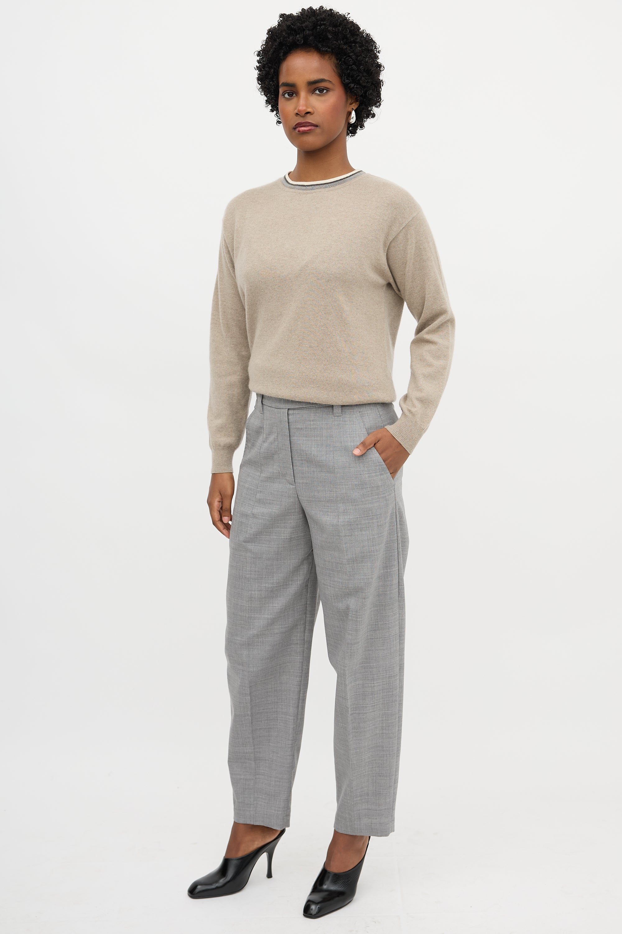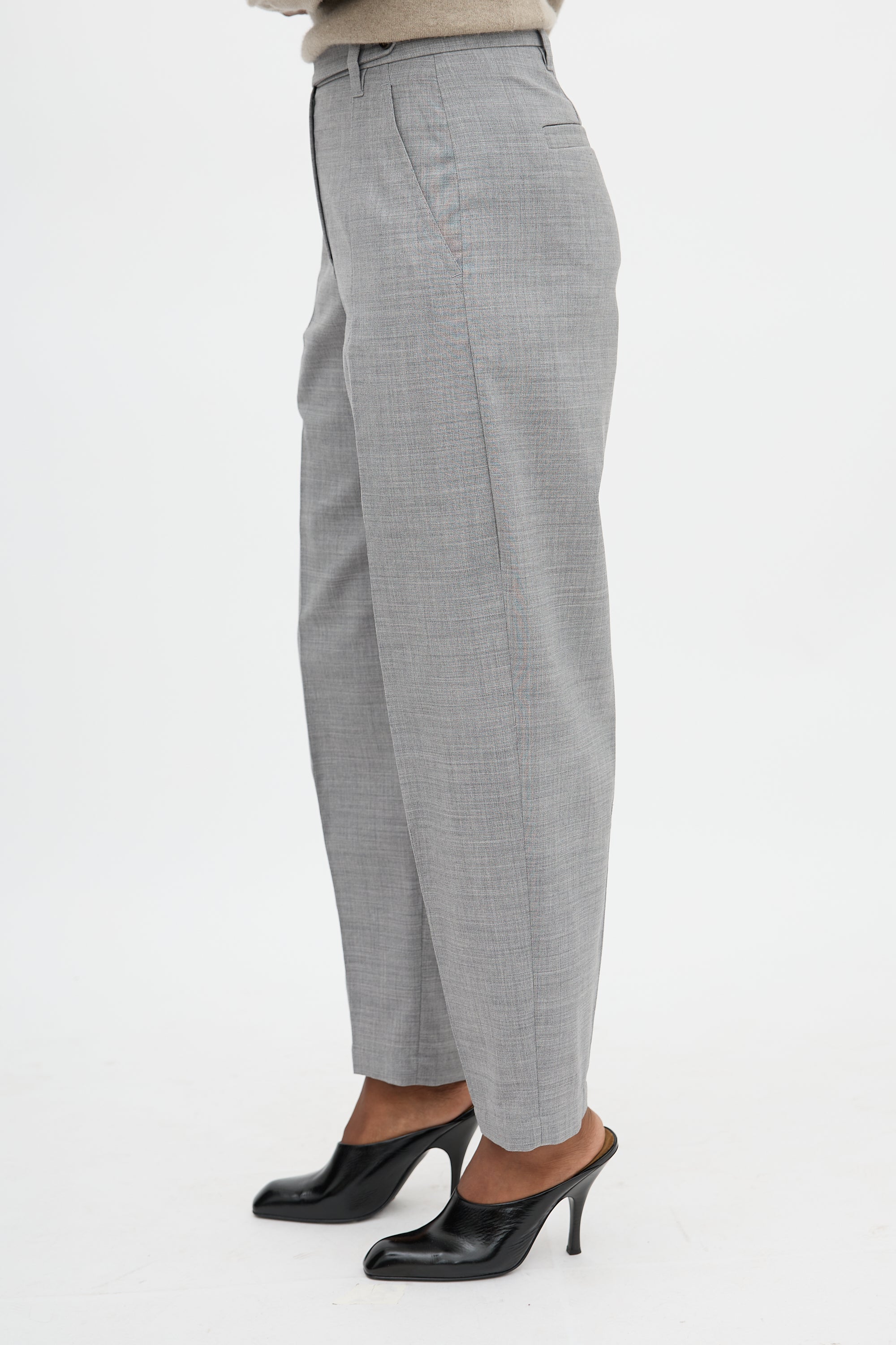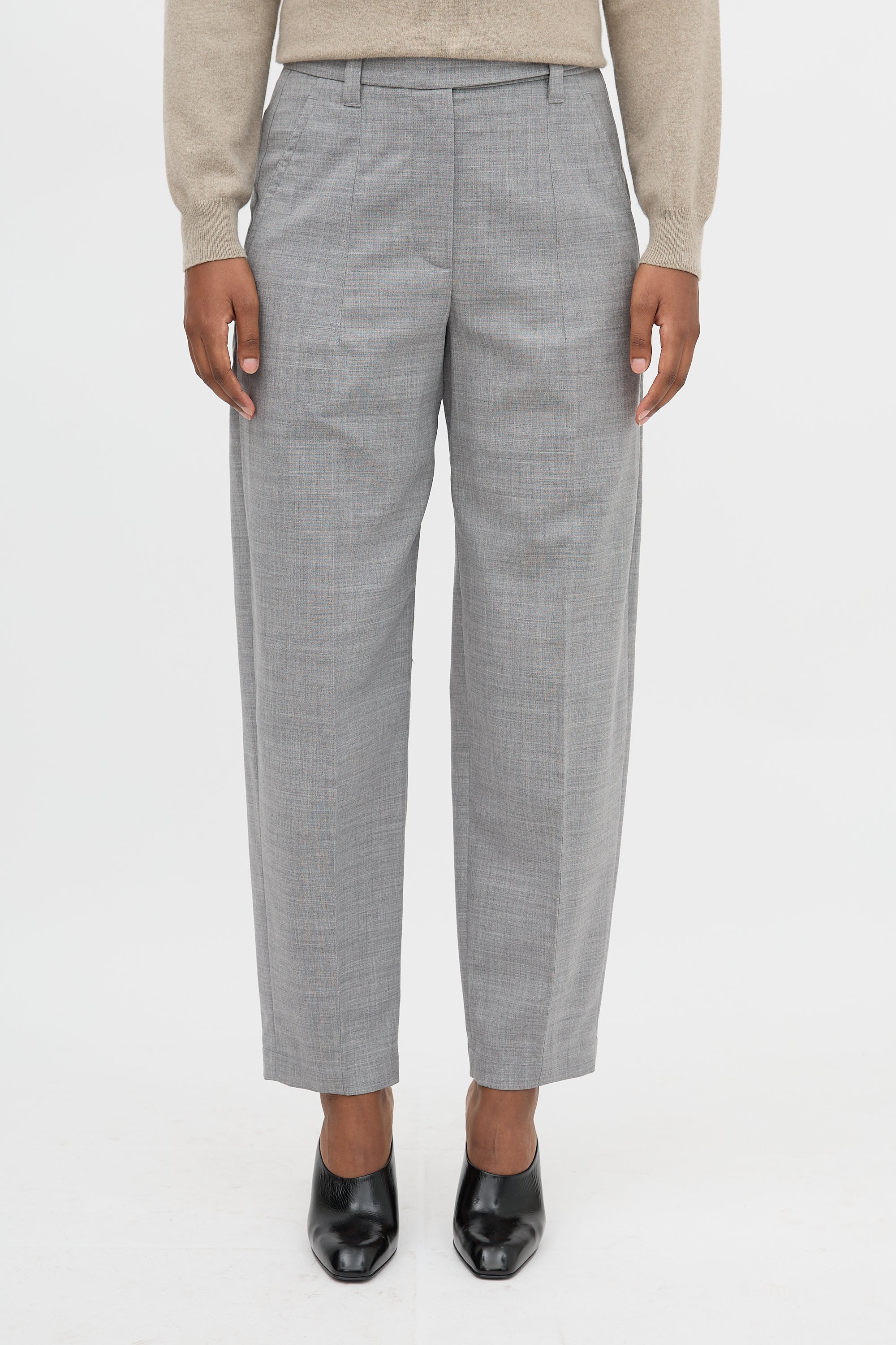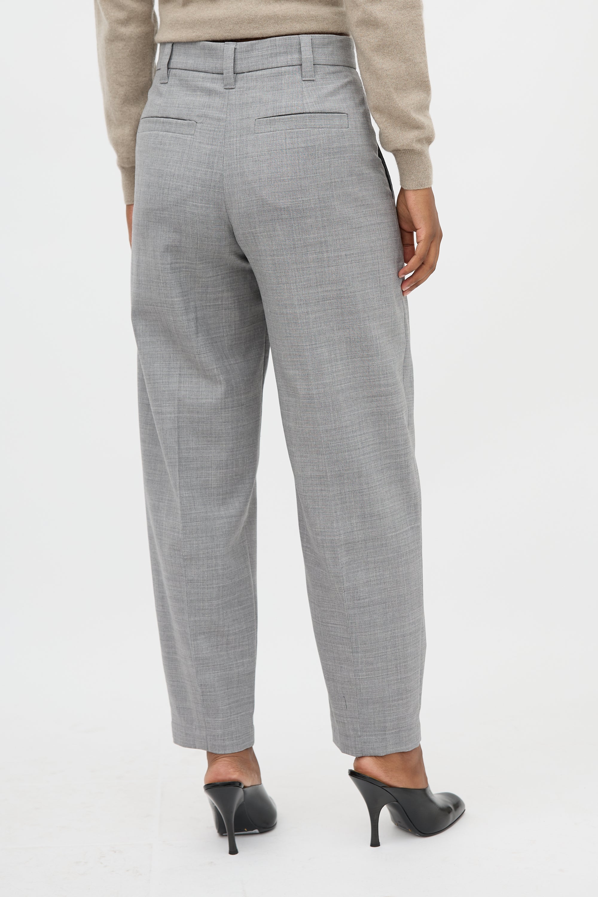 Pre-owned Brunello Cucinelli grey wool blend trousers featuring high waist, tapered leg with creases, four pocket styling, and zip fly.