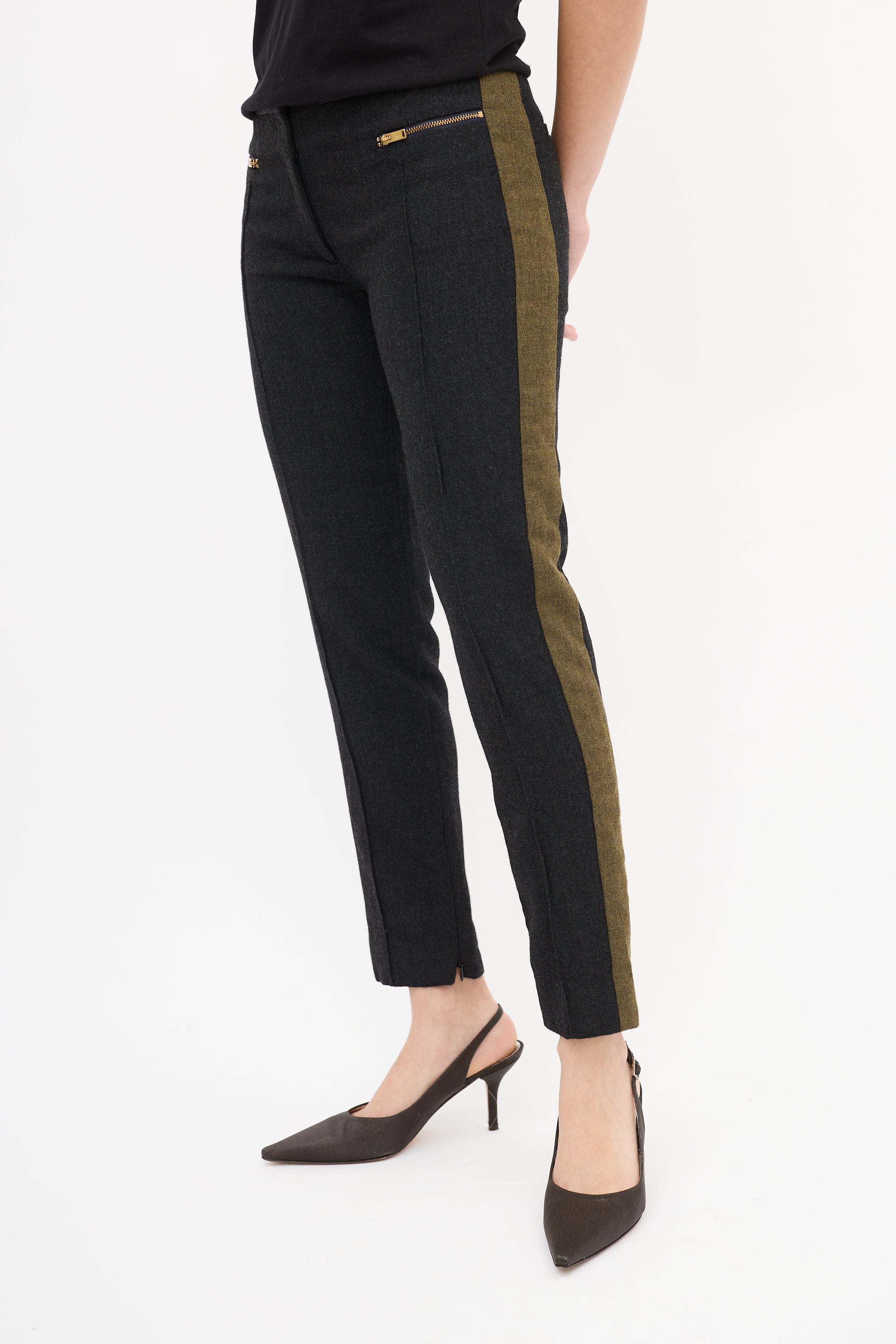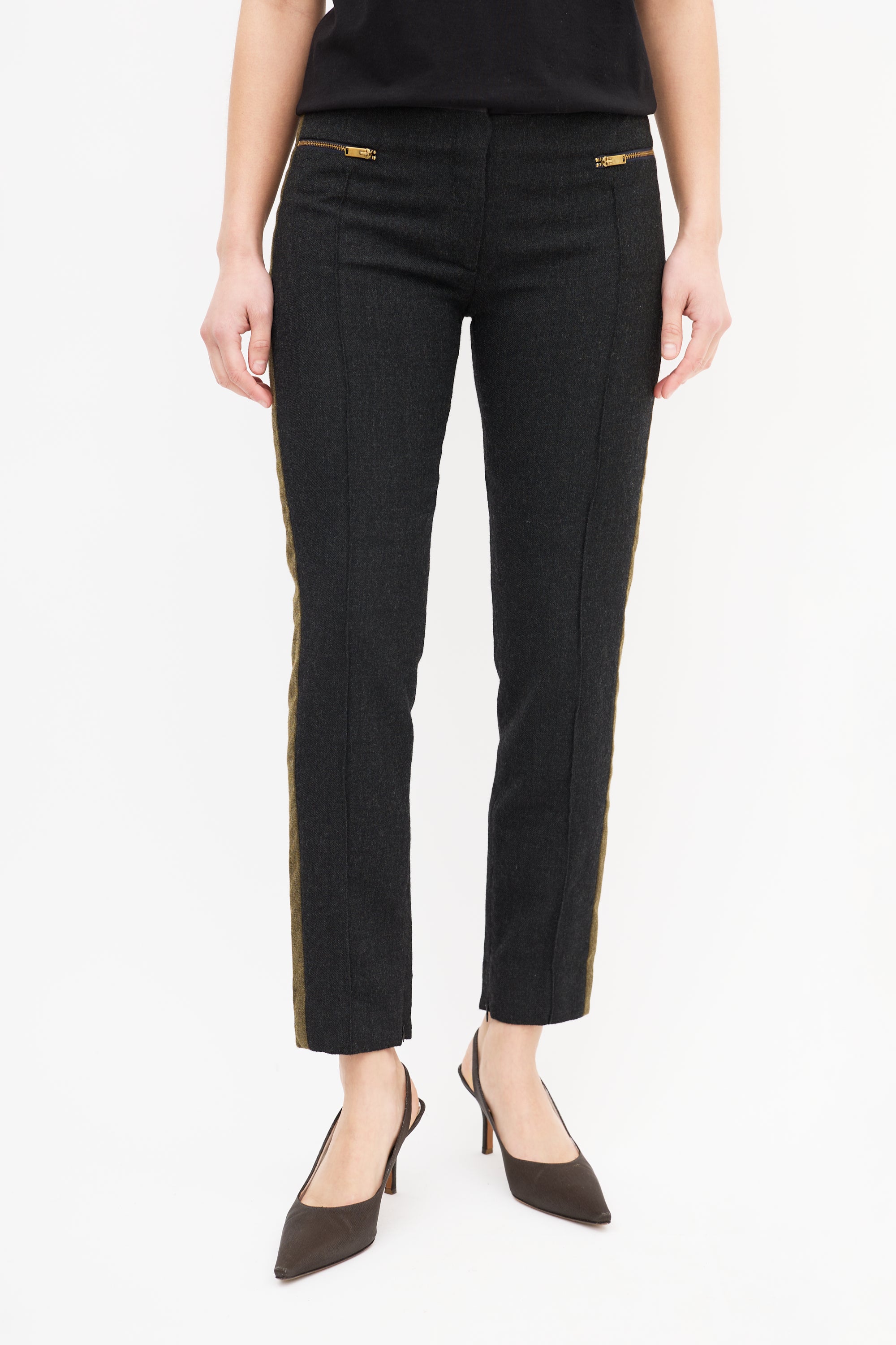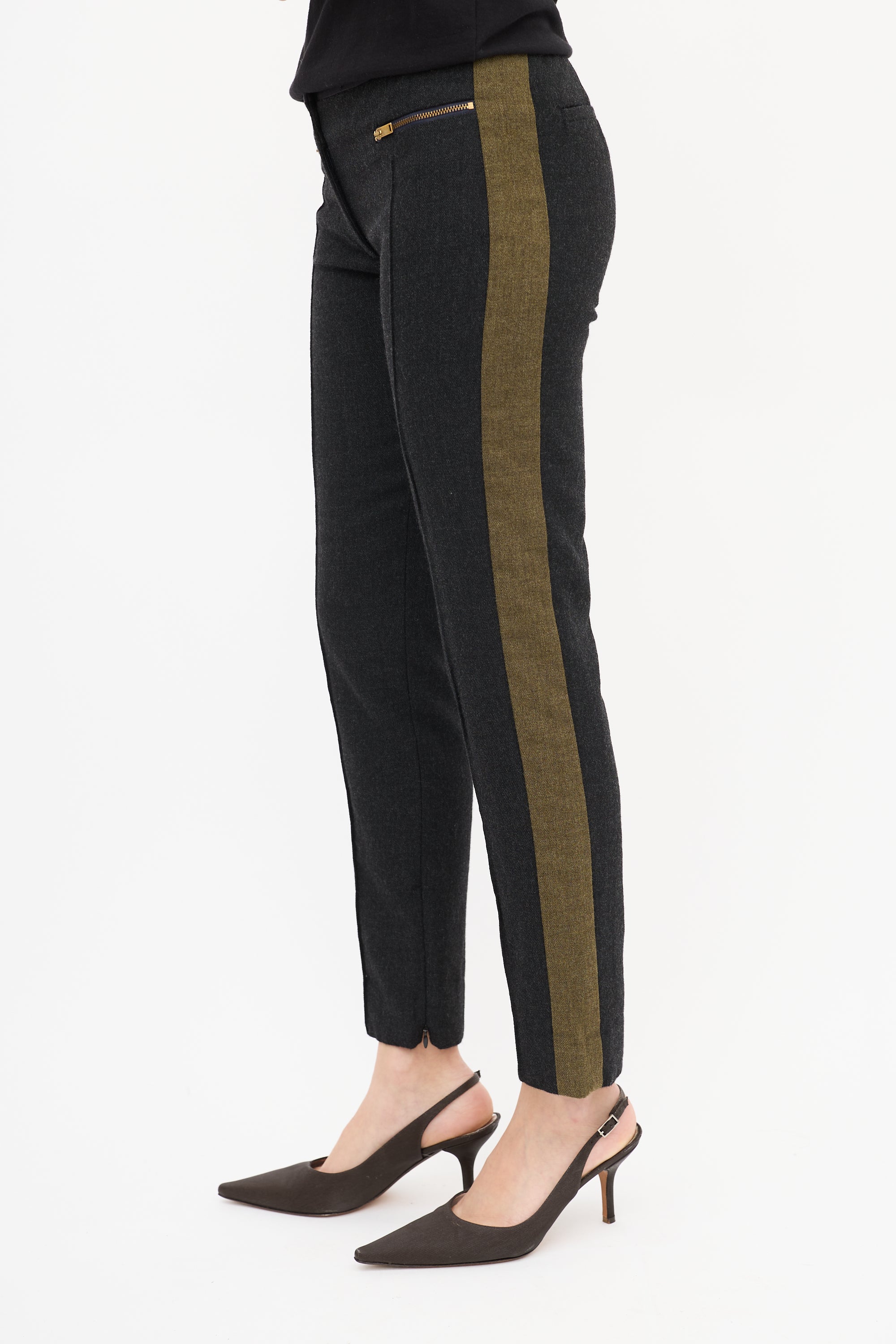 Pre-owned Celine dark grey wool blend trousers featuring a low rise, tapered leg with front pintucks and inner side zipped ankles, green side stripes, two gold tone zip pockets at front waist, two welt pockets at back waist, and zip fly.