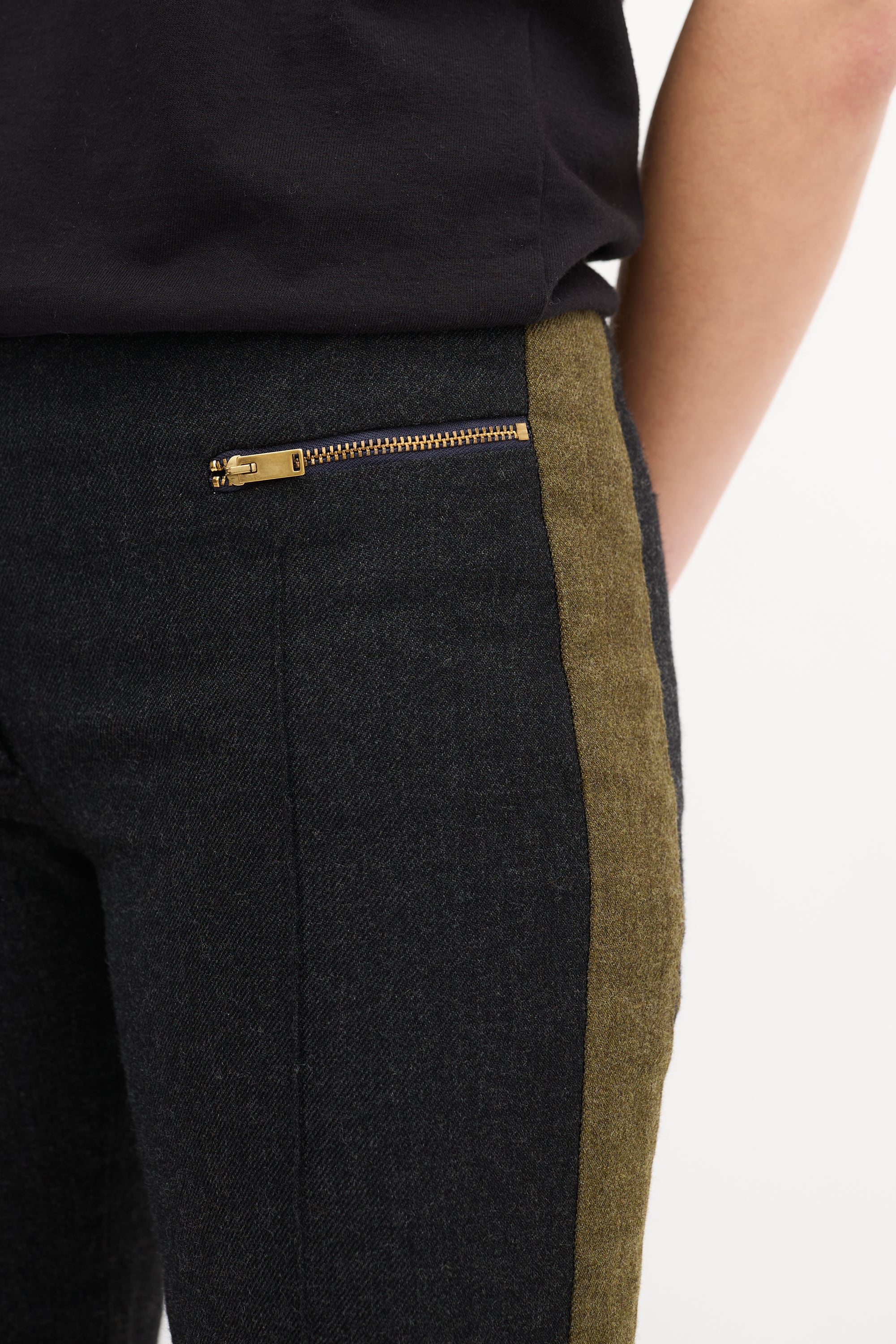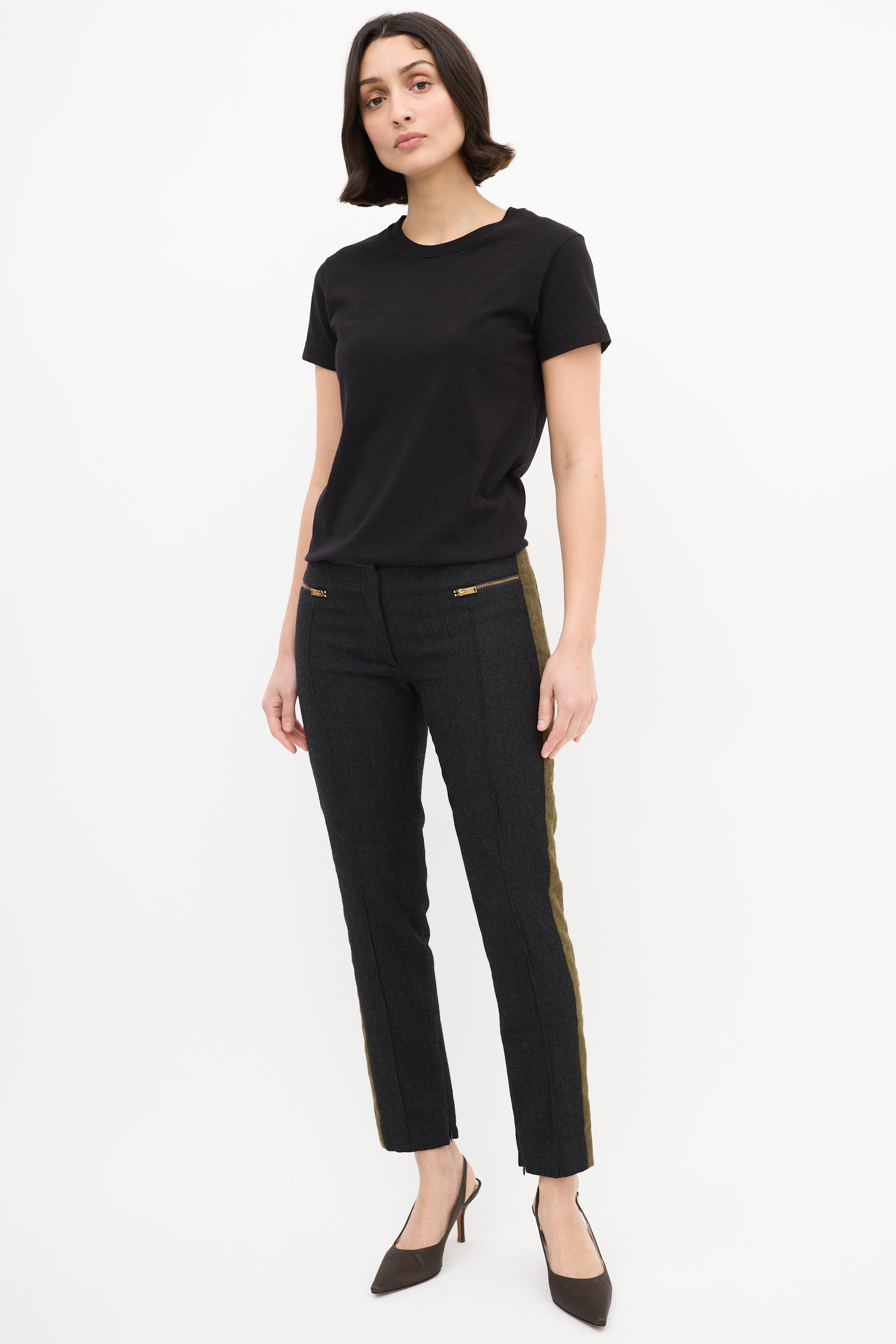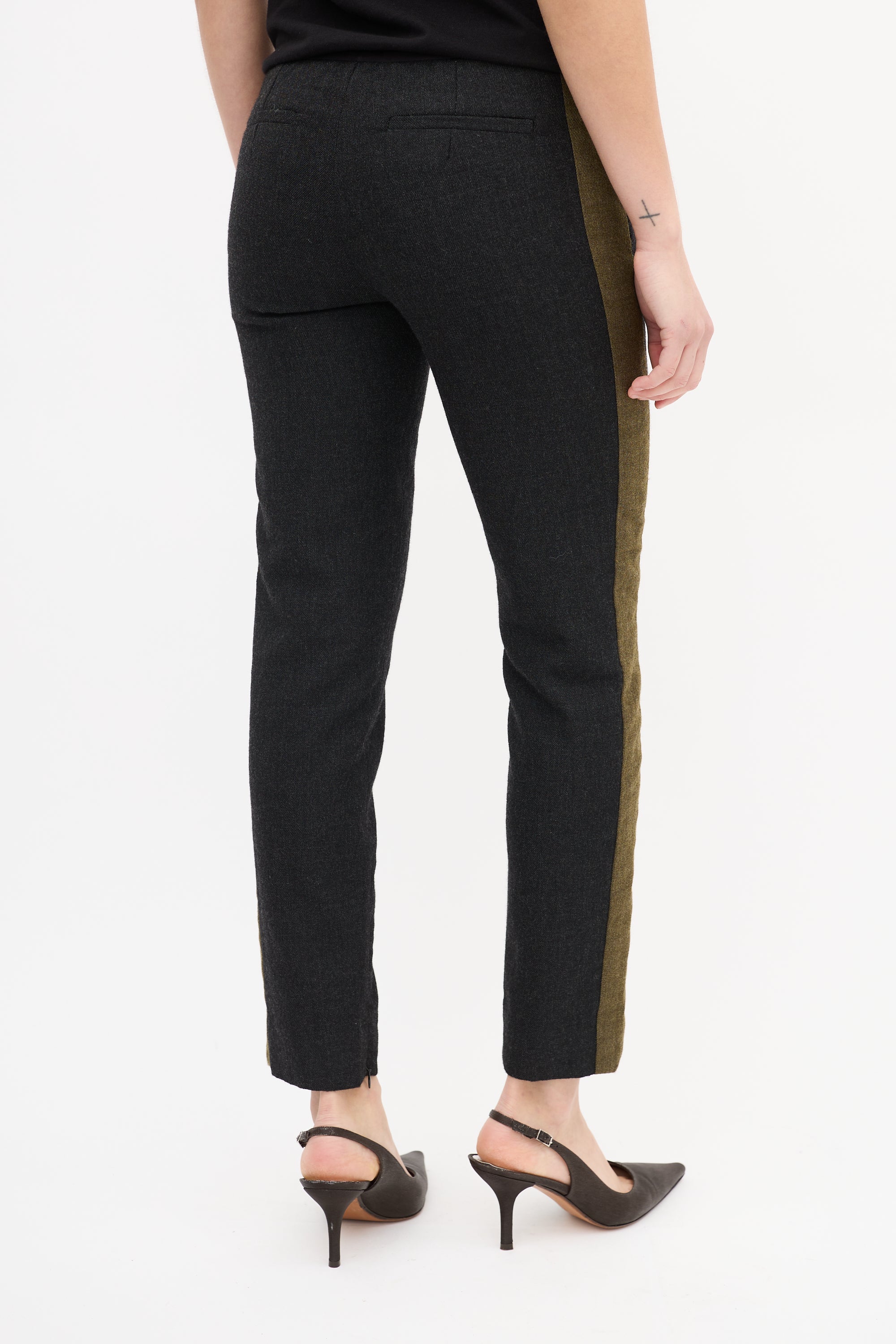 Pre-owned Celine dark grey wool blend trousers featuring a low rise, tapered leg with front pintucks and inner side zipped ankles, green side stripes, two gold tone zip pockets at front waist, two welt pockets at back waist, and zip fly.