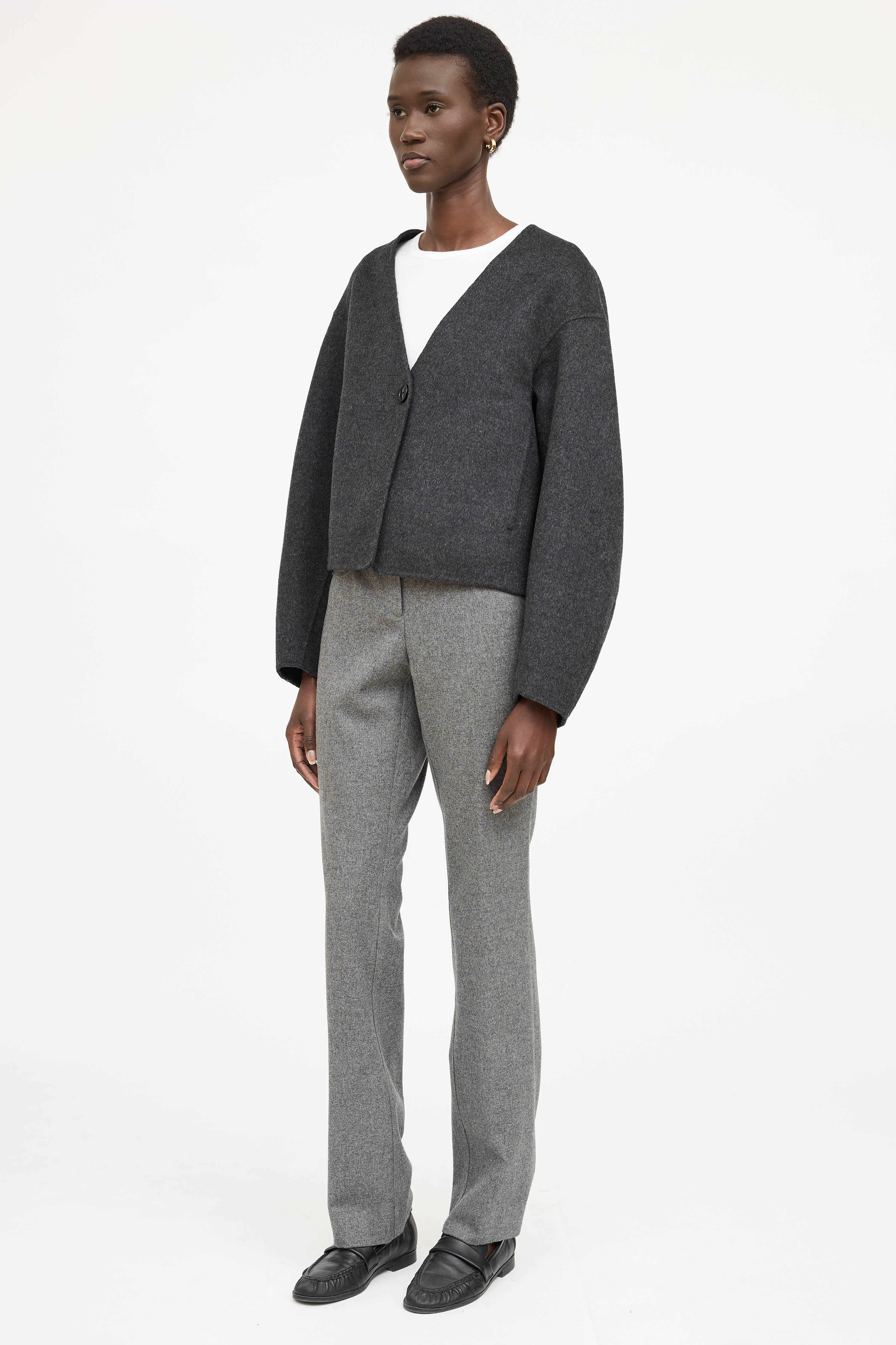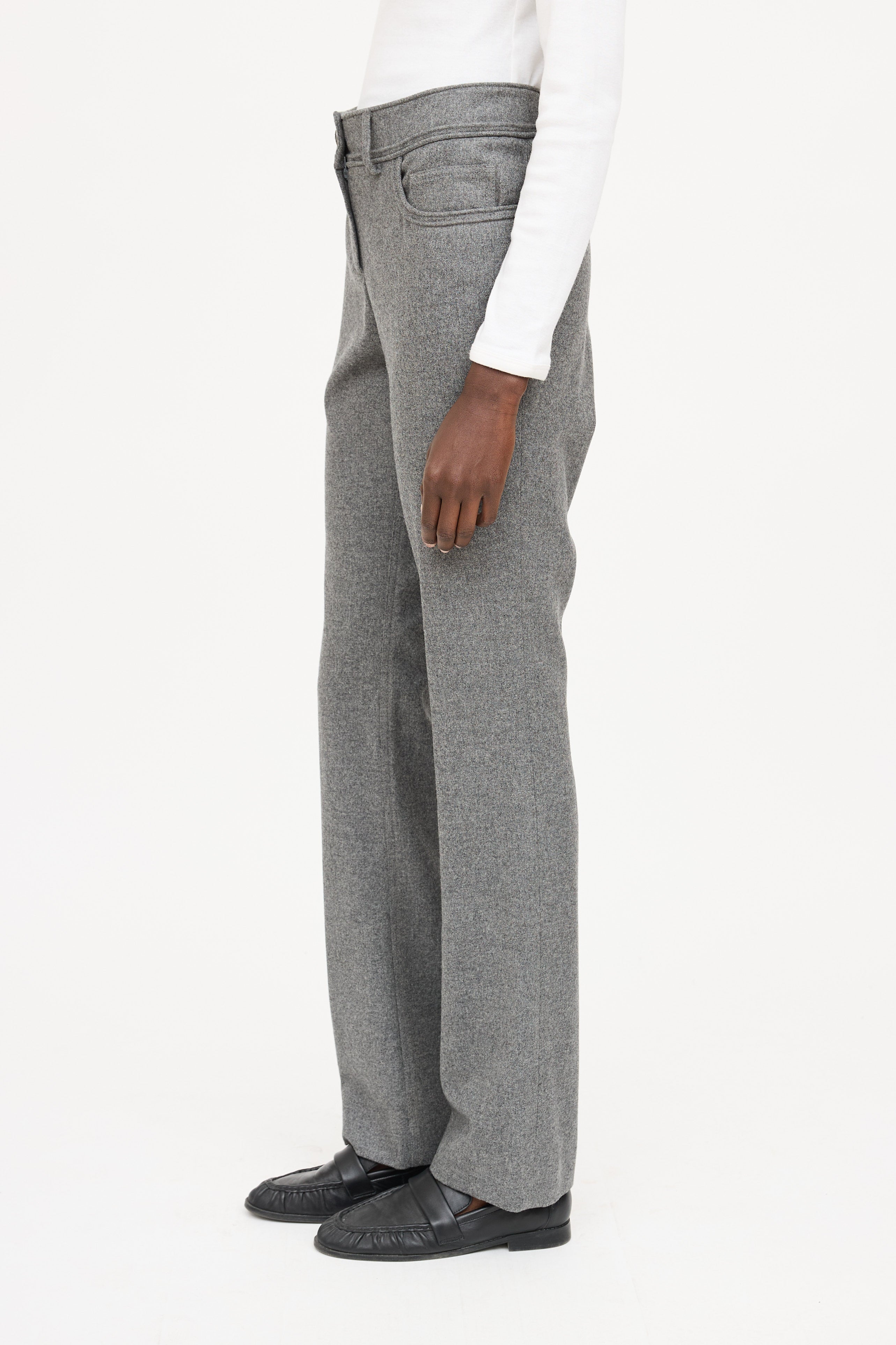 Pre-owned Chanel grey 2007 Wool pants featuring four pocket styling at front, zip fly closure, and silver tone star embellished CC button. From the 2007 Fall Collection by Karl Lagerfeld.