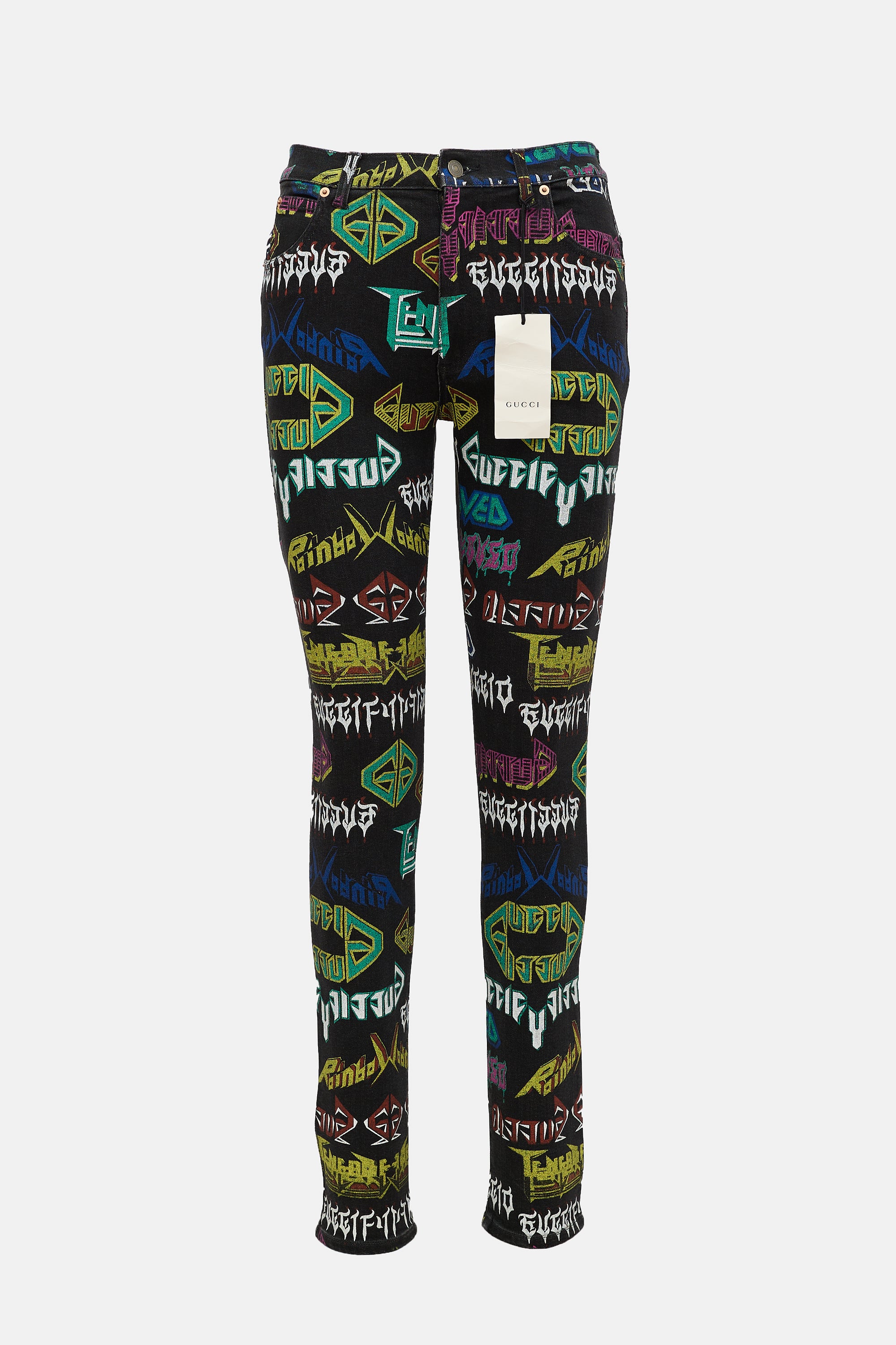 Pre-owned Gucci black Metal Mix jeans featuring a mixed multicolour script print, mid rise, zip fly with button fastening, five pocket styling, and slim leg.
