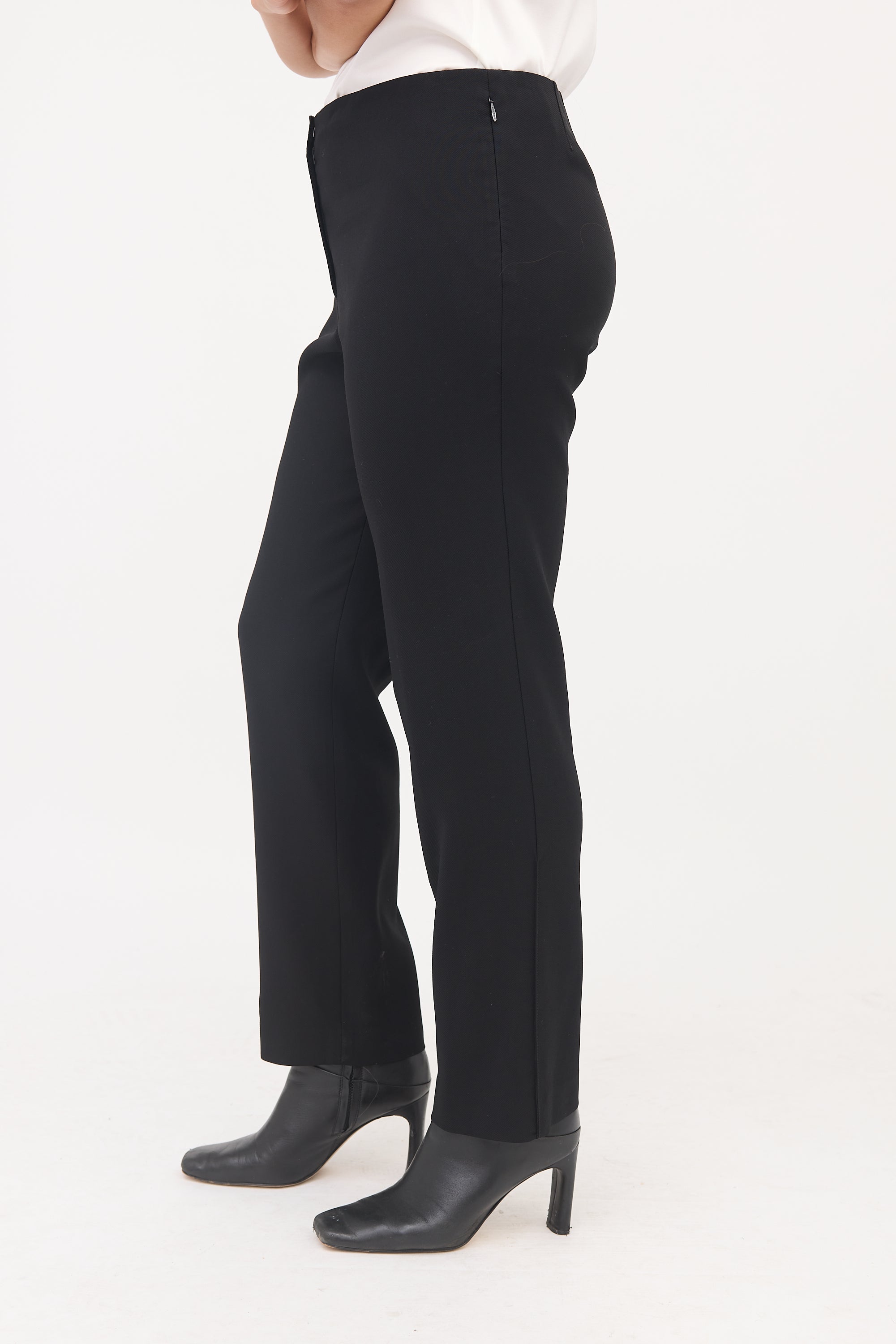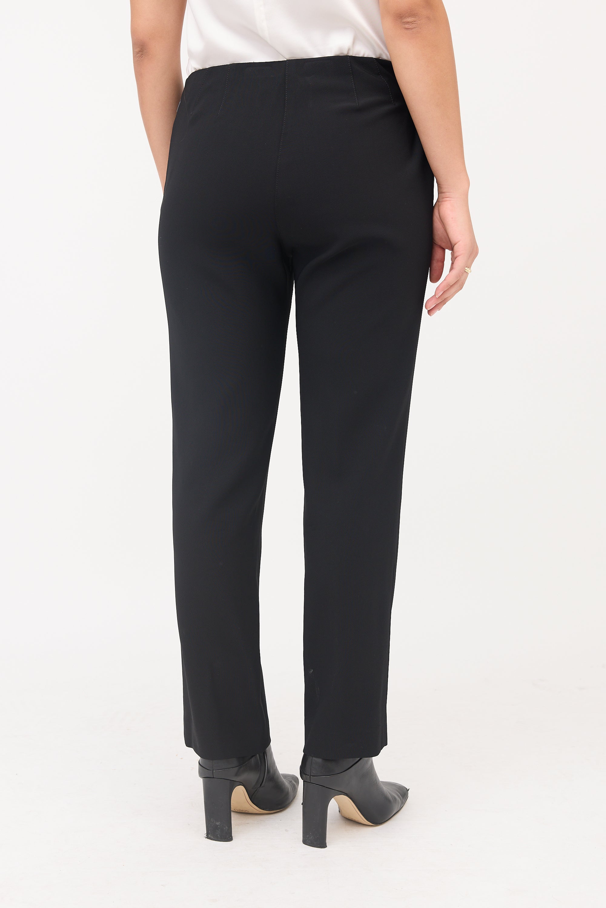 Pre-owned The Row black slim leg trouser featuring a zip fly, darted back waist, and two zip pockets at hip. Clipped to fit model.