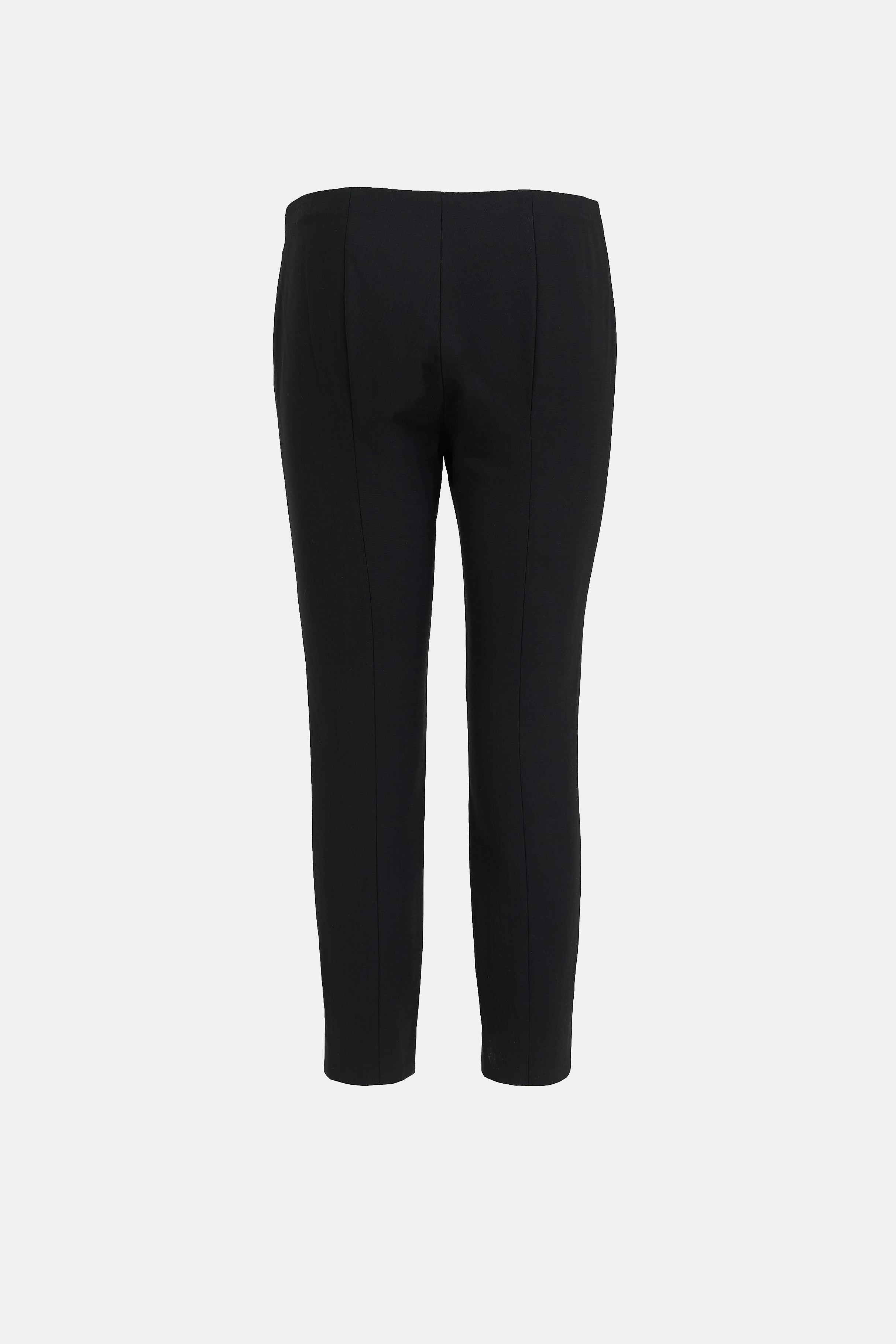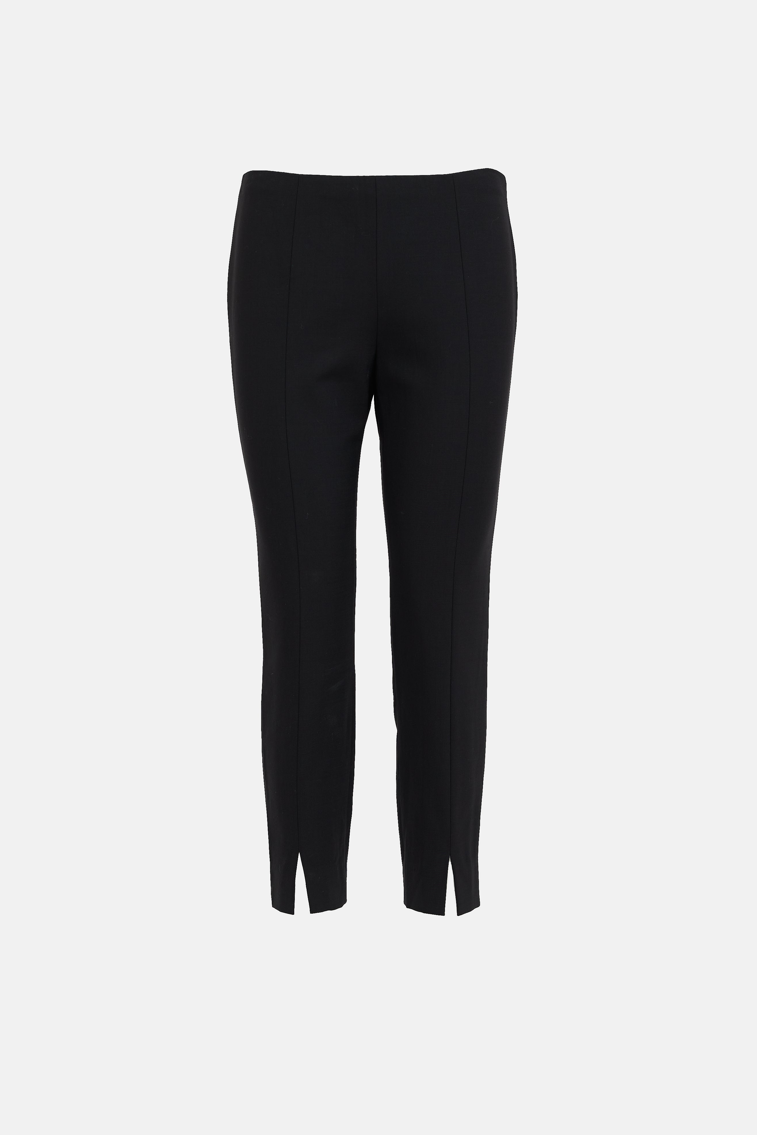 Pre-owned The Row black Thilde trousers featuring an elastic waist, centre seam, slim leg, split hem, and zip closure at side.