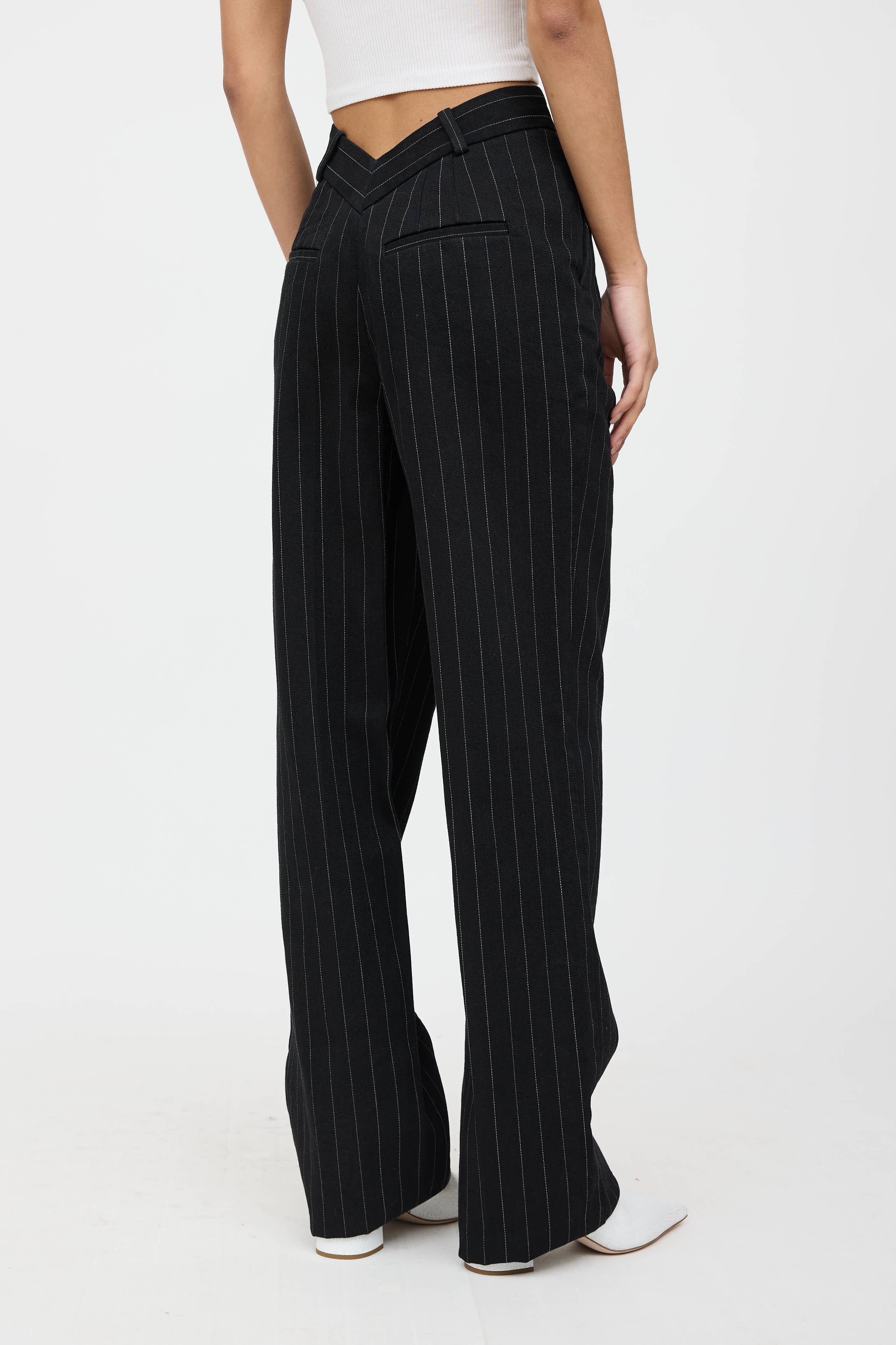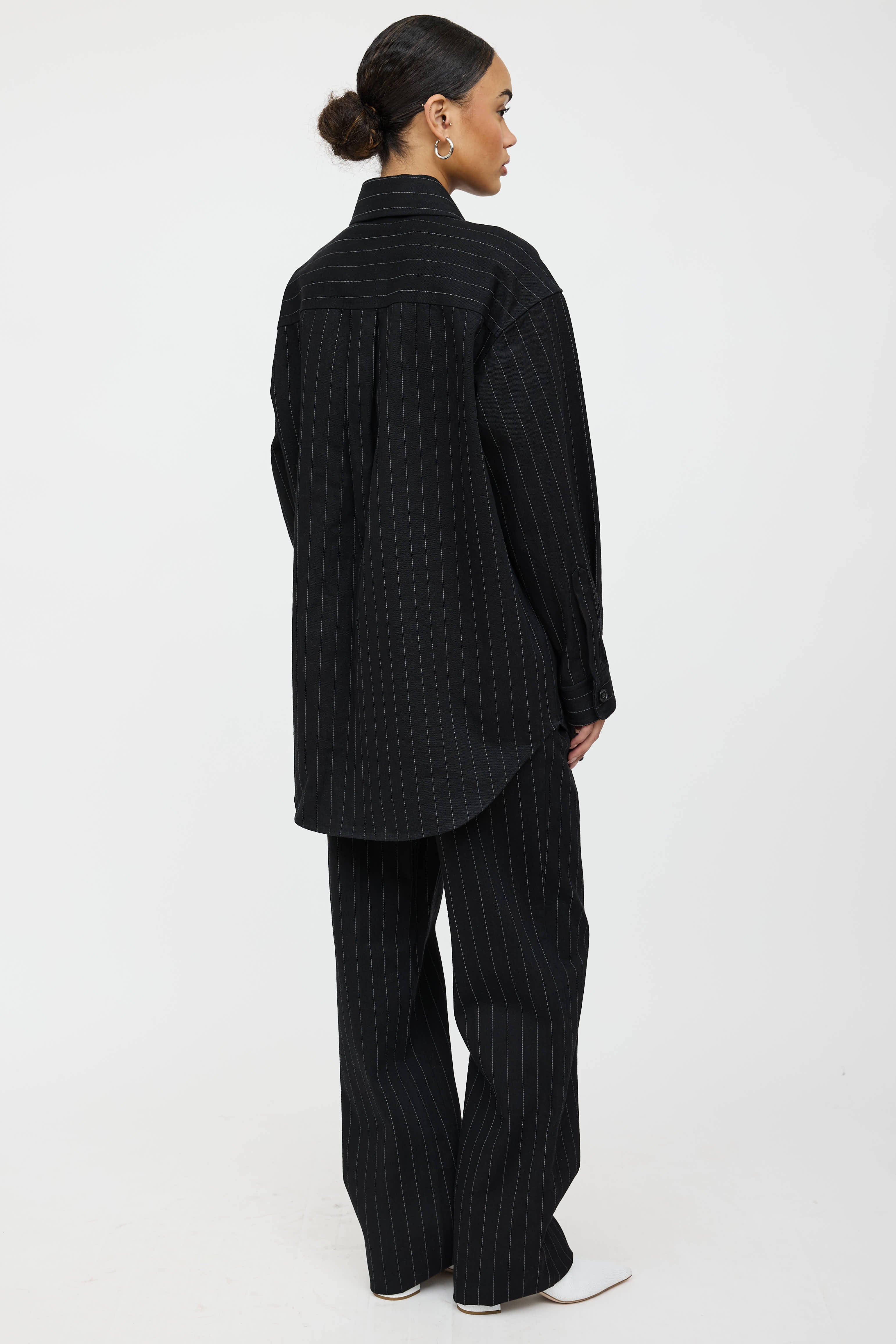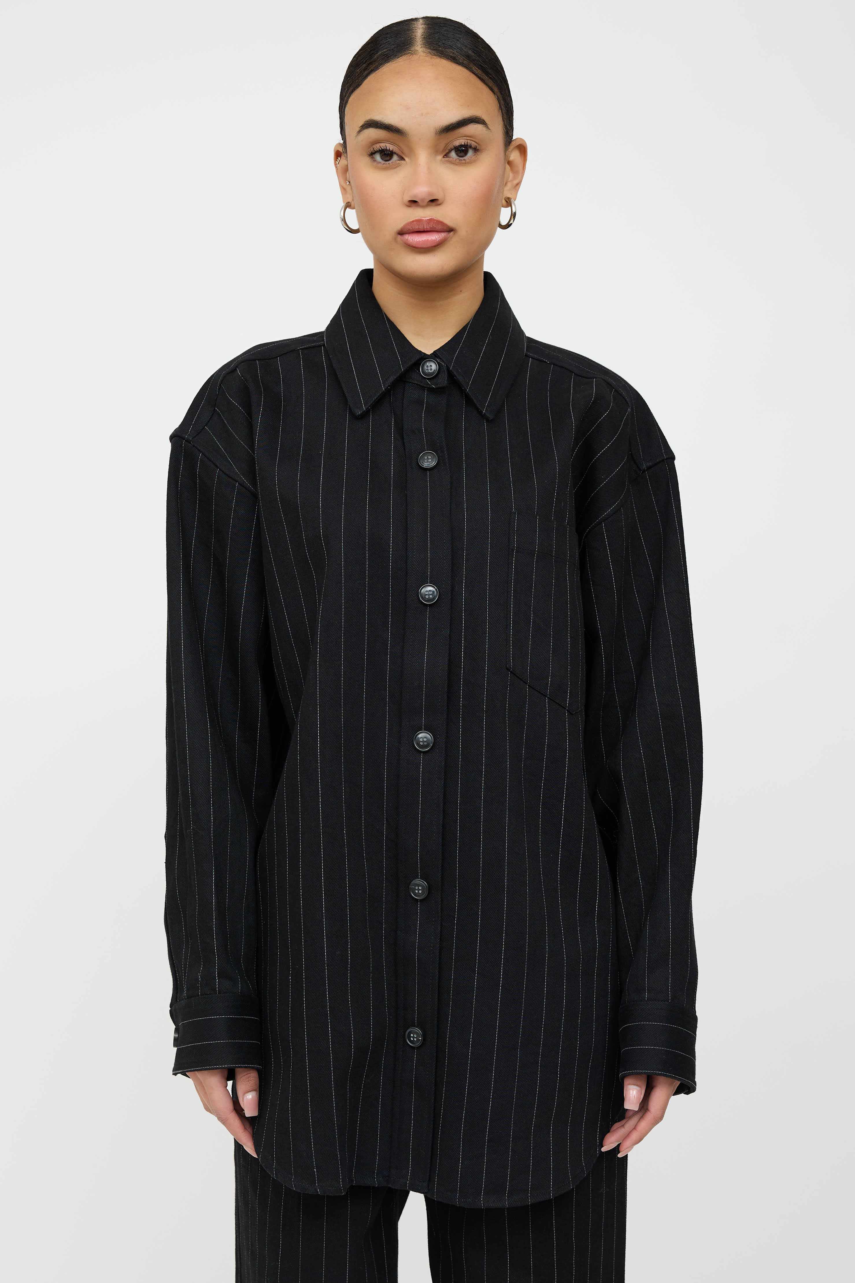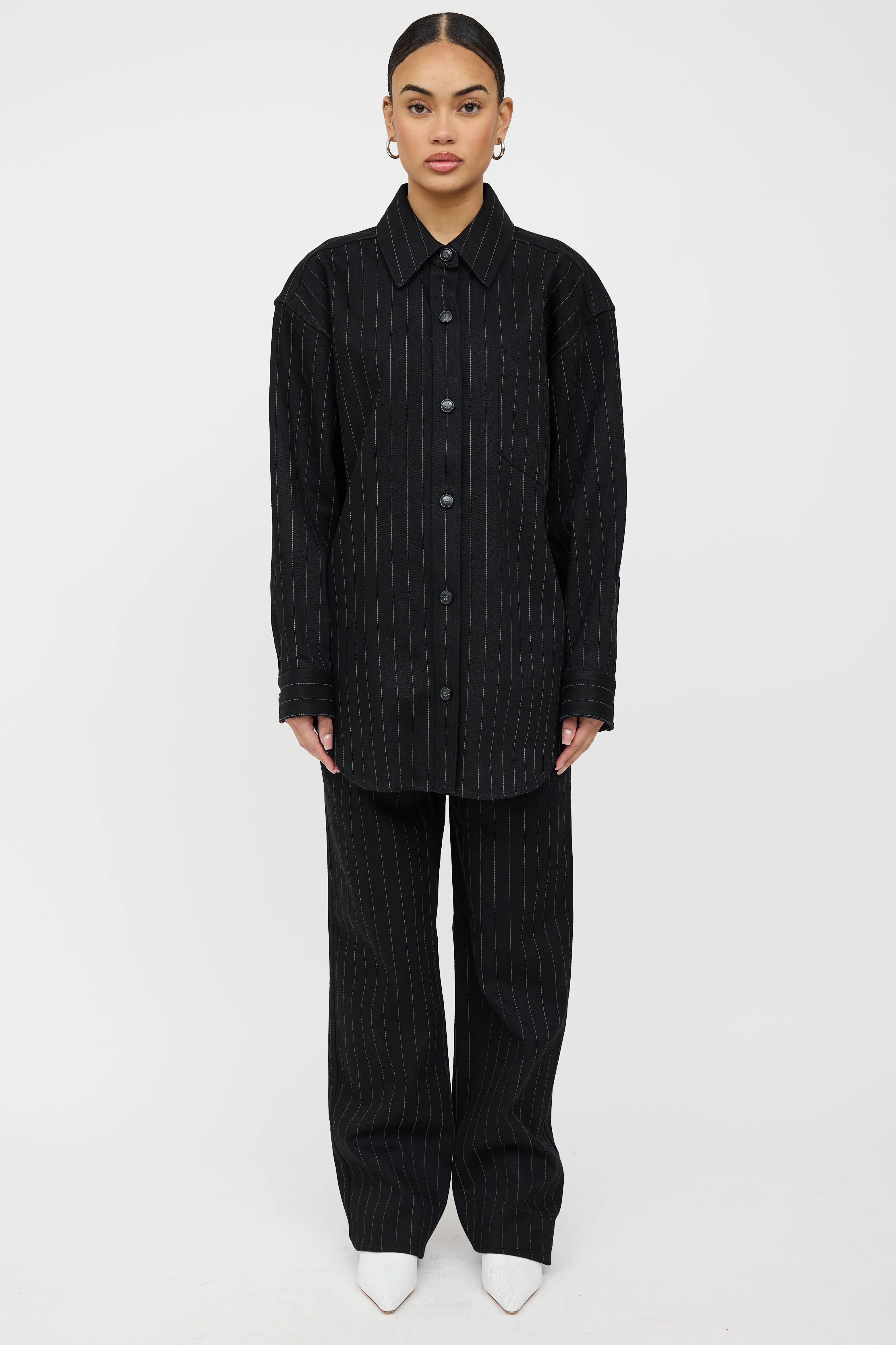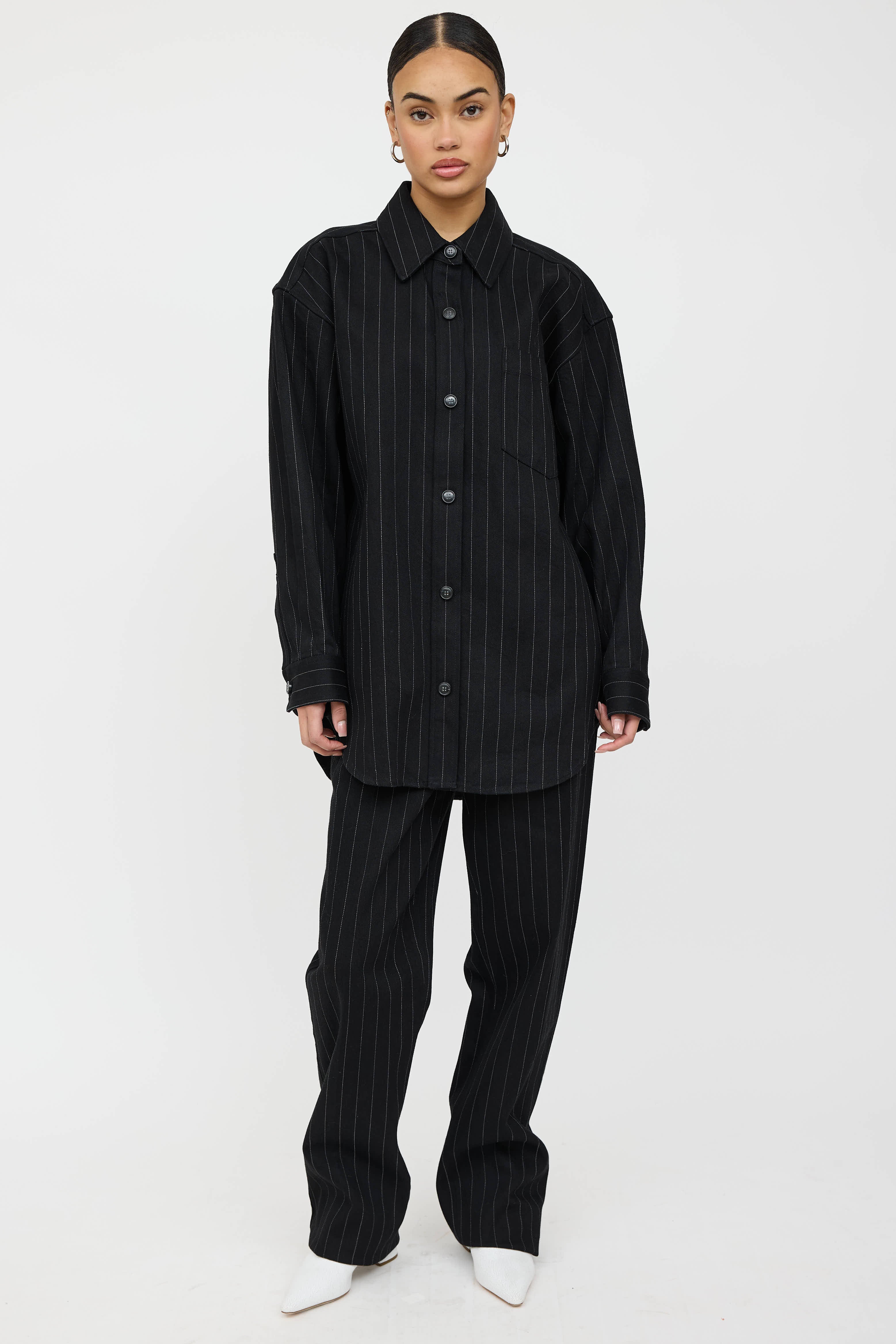 Pre-owned Alexander Wang black shirt jacket featuring a white striped pattern throughout, pointed collar, long sleeves, one patch pocket at chest with logo tab, and snap button up closure. Matching trousers feature a white striped pattern throughout, two slip pockets at hip, centre pleat, two faux welt pockets at back, curved waist, and zip fly with hook and eye closure.
