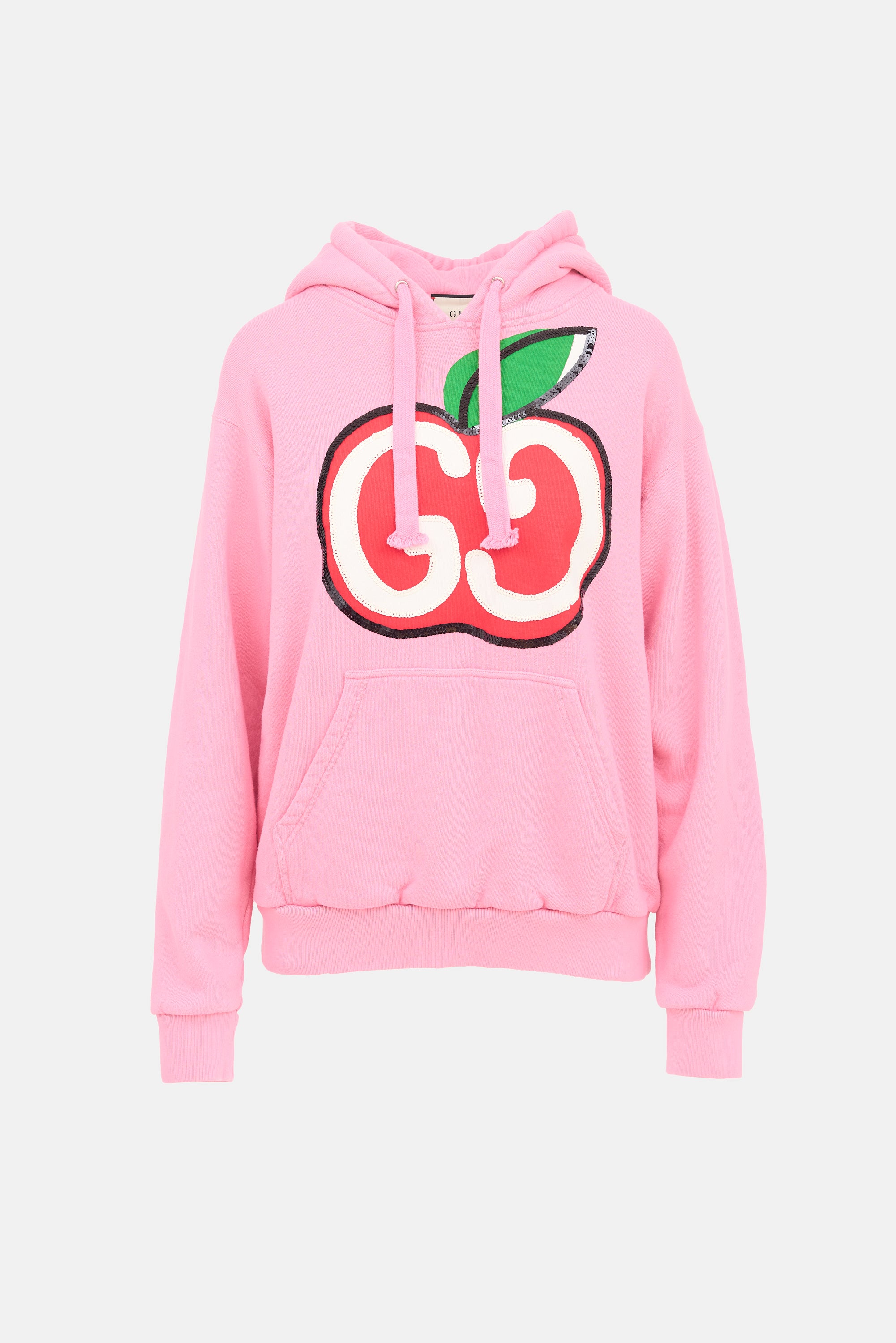 Pre-owned Gucci pink hoodie featuring a drawstring hood, apple print at front with sequin embellishments and GG logo, logo at back collar, kangaroo pocket, and a ribbed hem and cuffs.