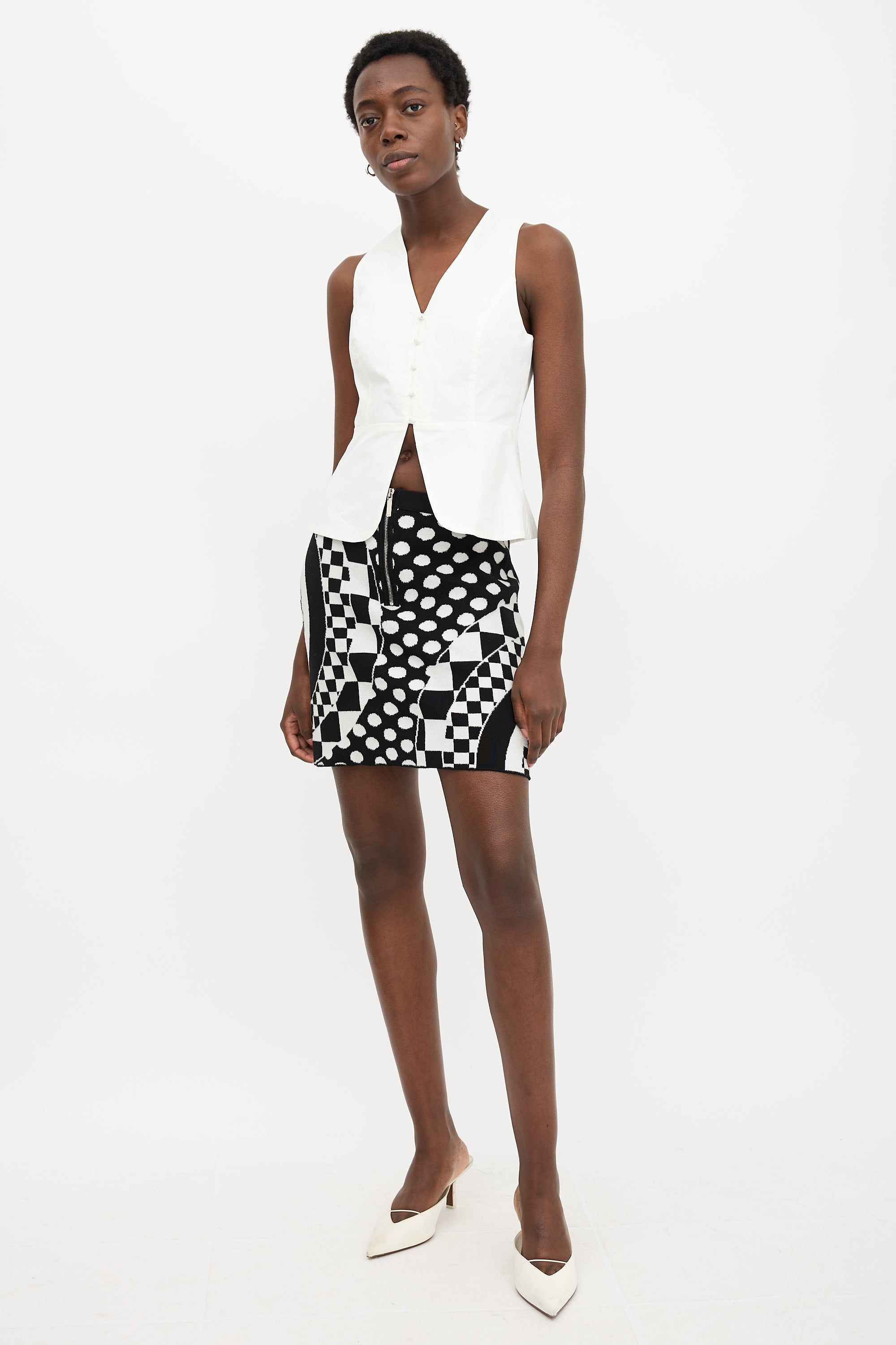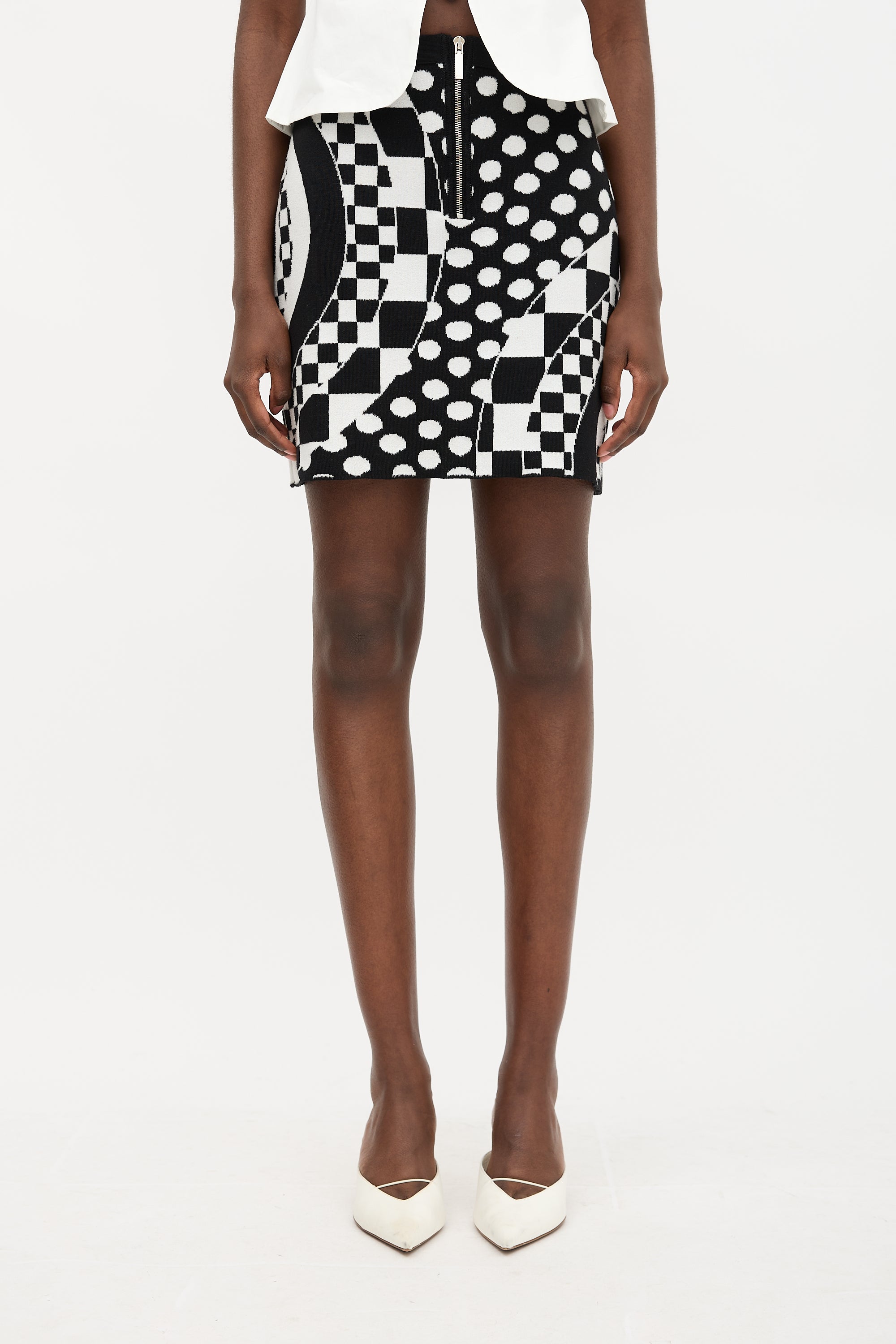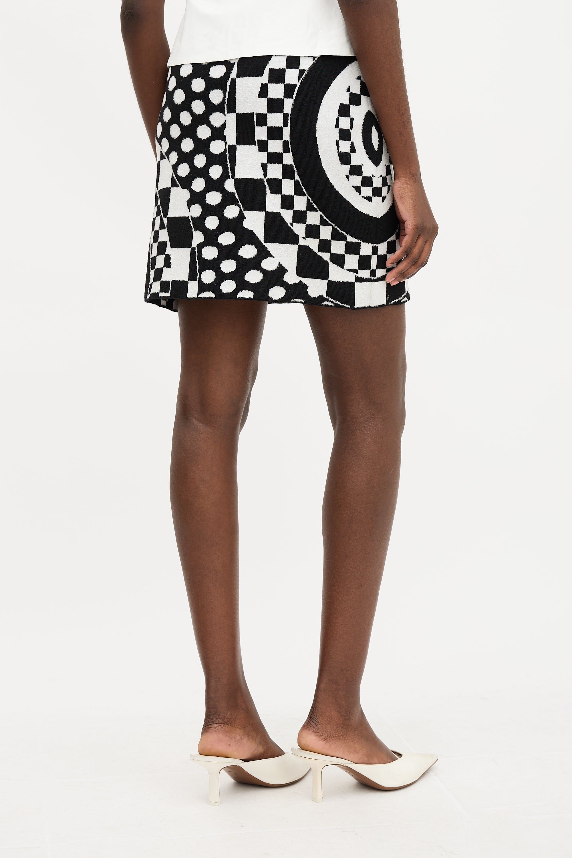 Pre-owned Emilio Pucci black and white abstract intarsia skirt featuring an elasticized waist and a front zip closure.