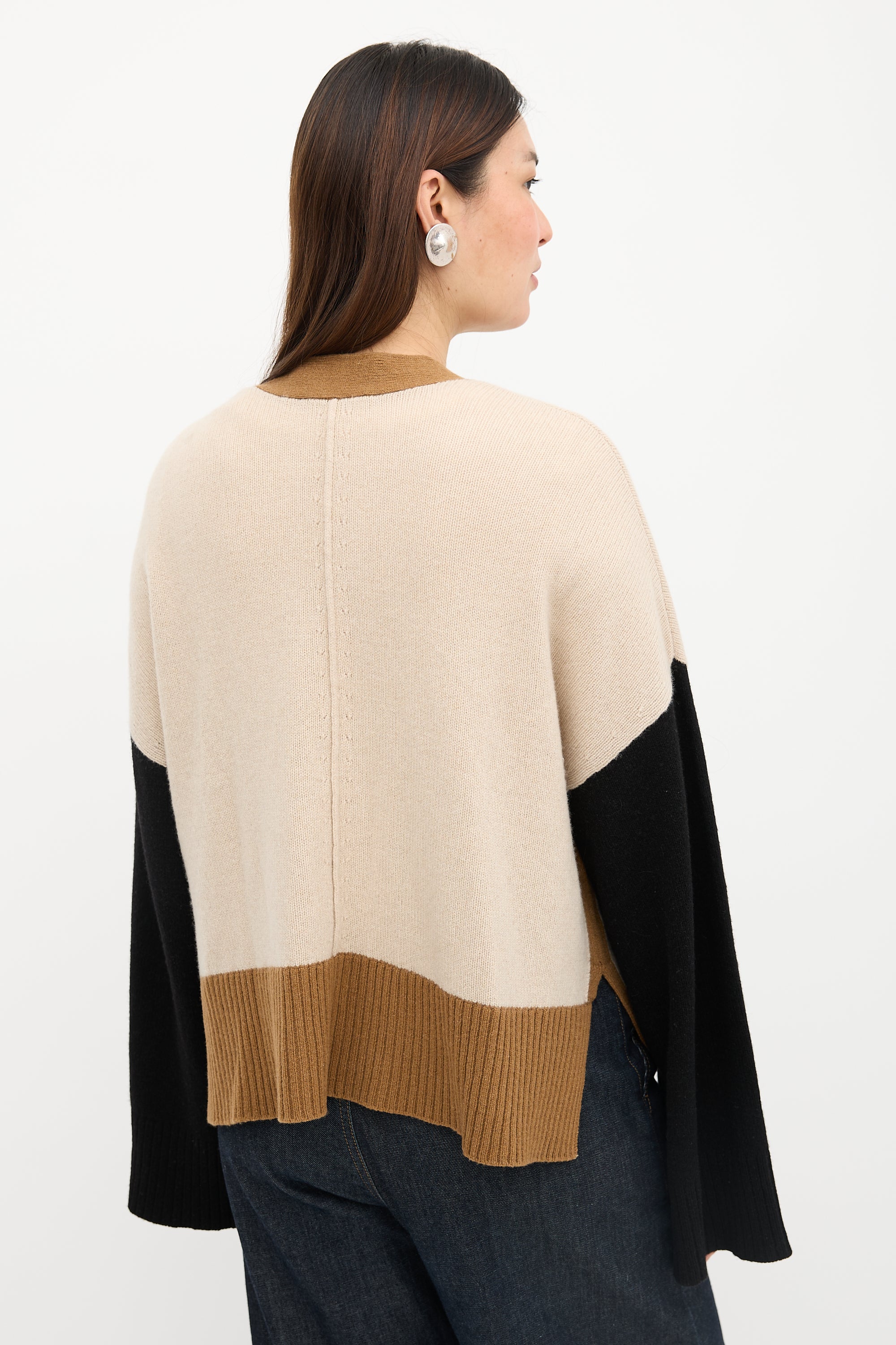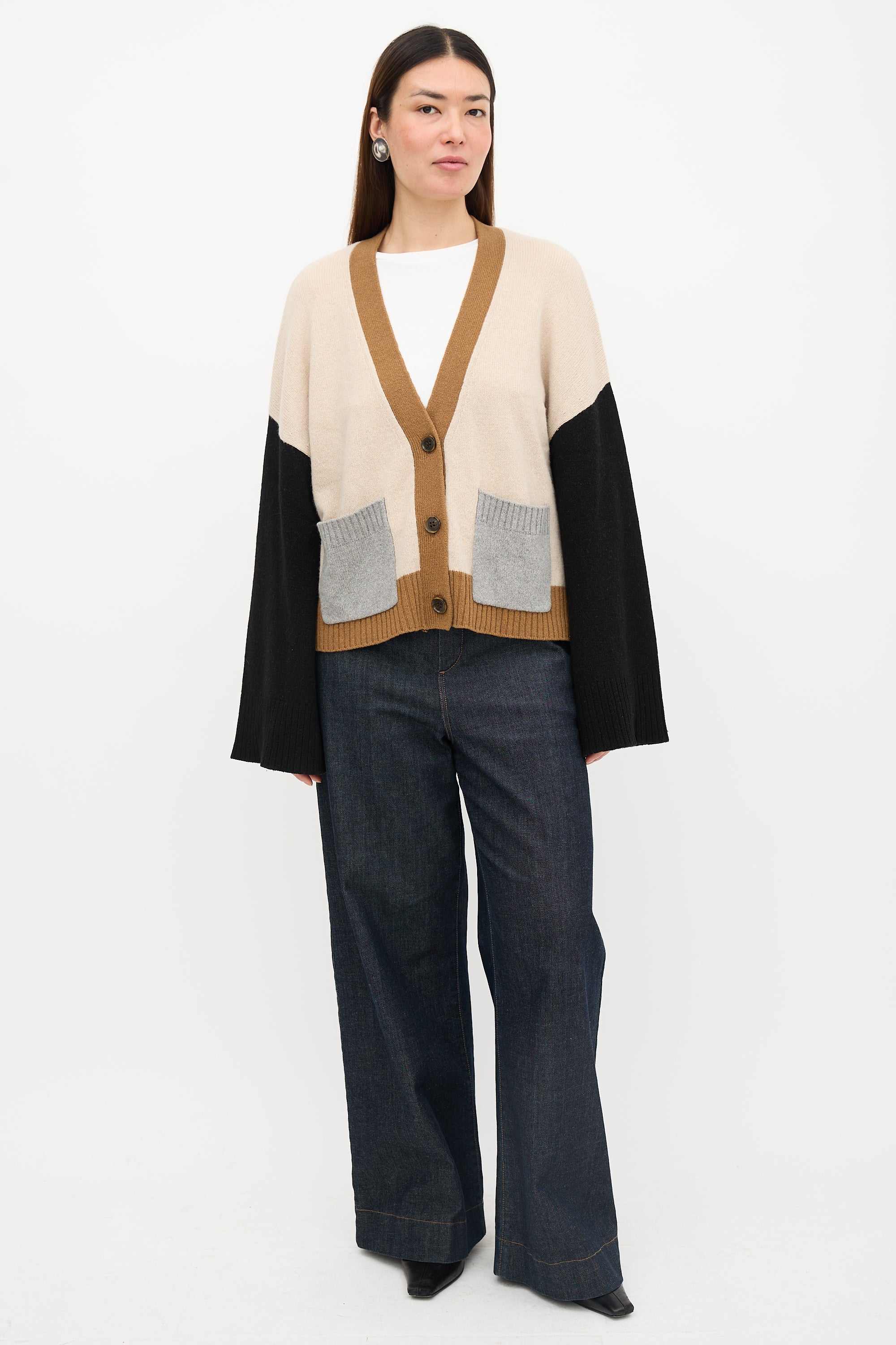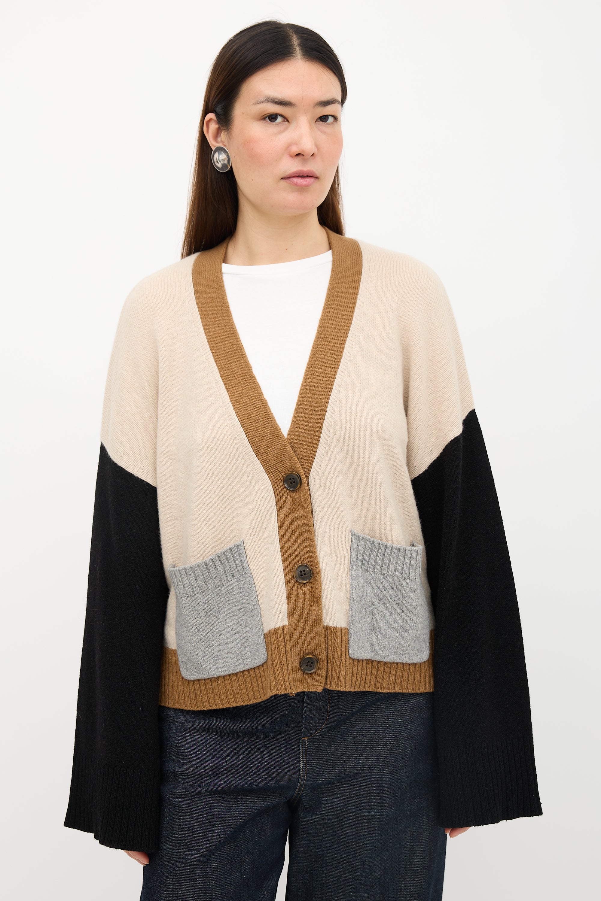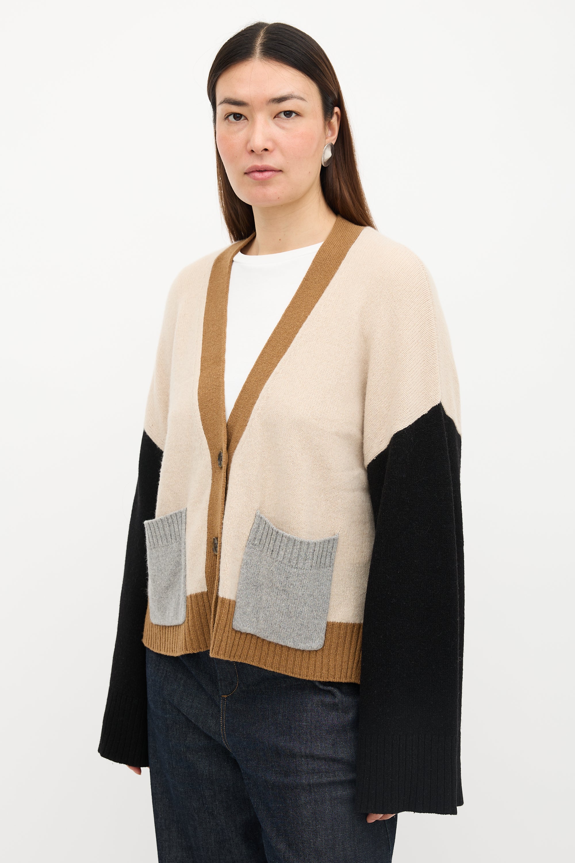 Pre-owned Frame beige, black, and brown cashmere Vicuna colourblock cardigan featuring a V-neckline, button front, dropped shoulder, two grey patch pockets at front, wide sleeves with ribbed cuffs, and a ribbed hem.