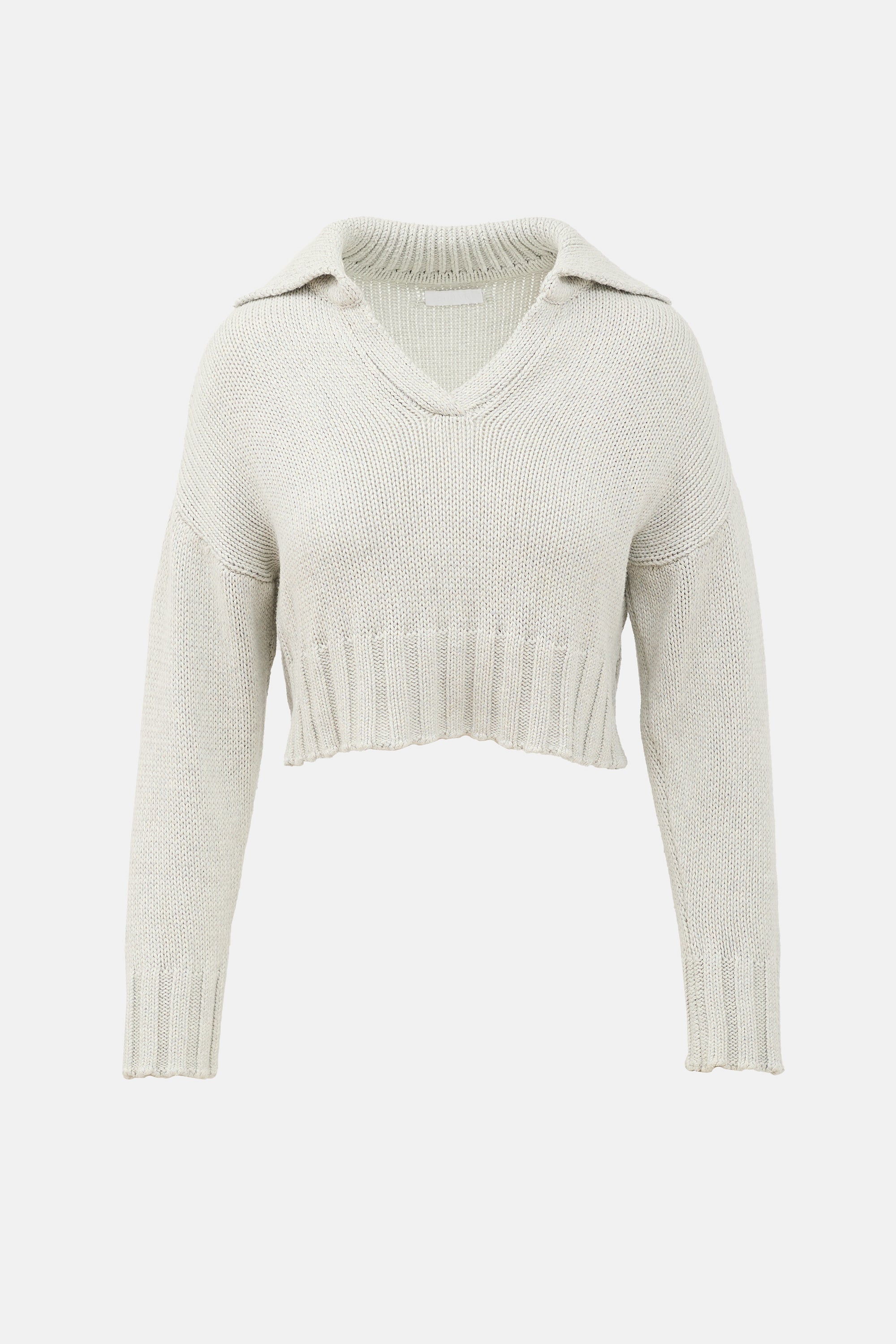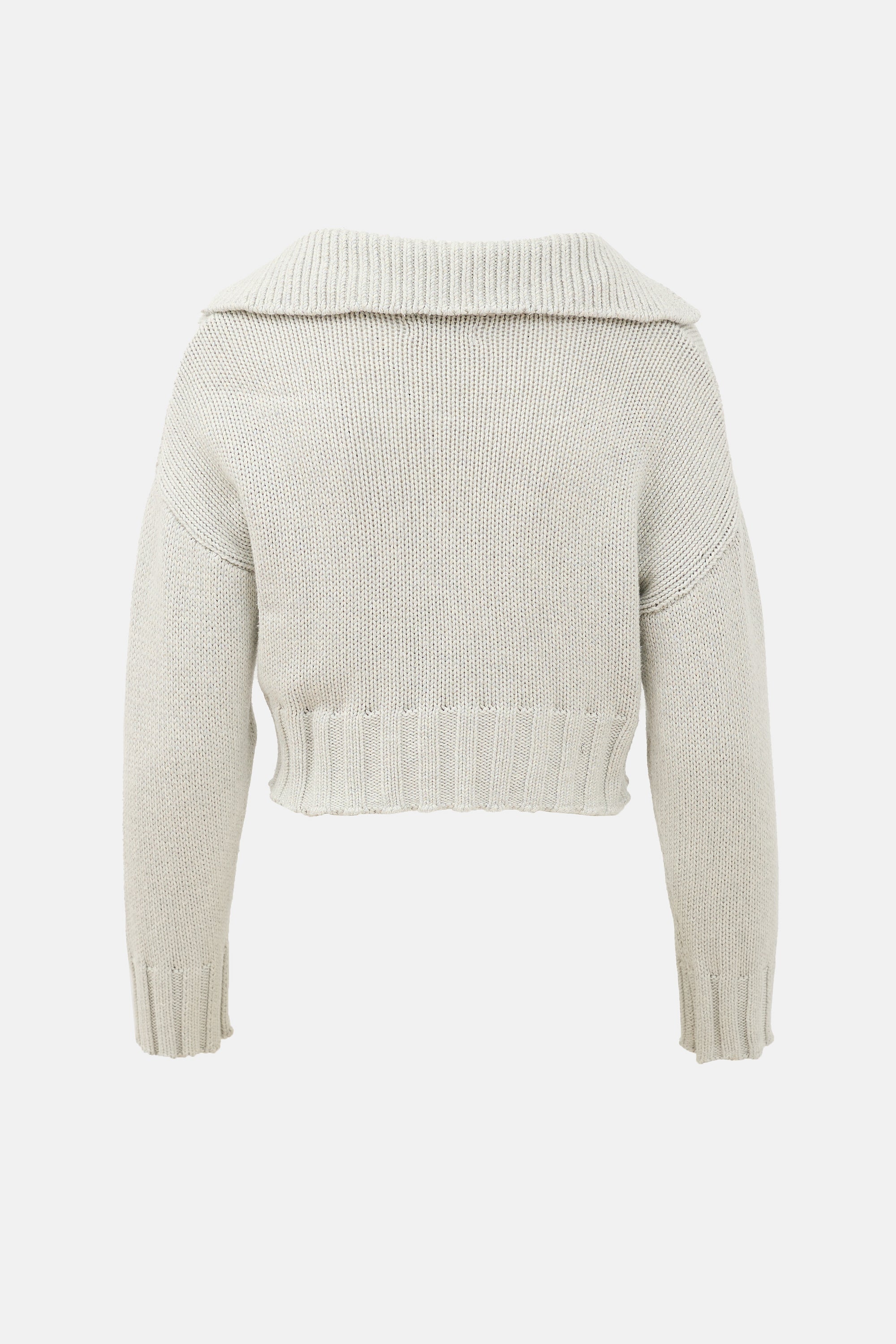 Pre-owned Sablyn grey cotton Julie cropped sweater featuring a V-neckline, spread collar, dropped shoulders, and a ribbed hem and cuffs.