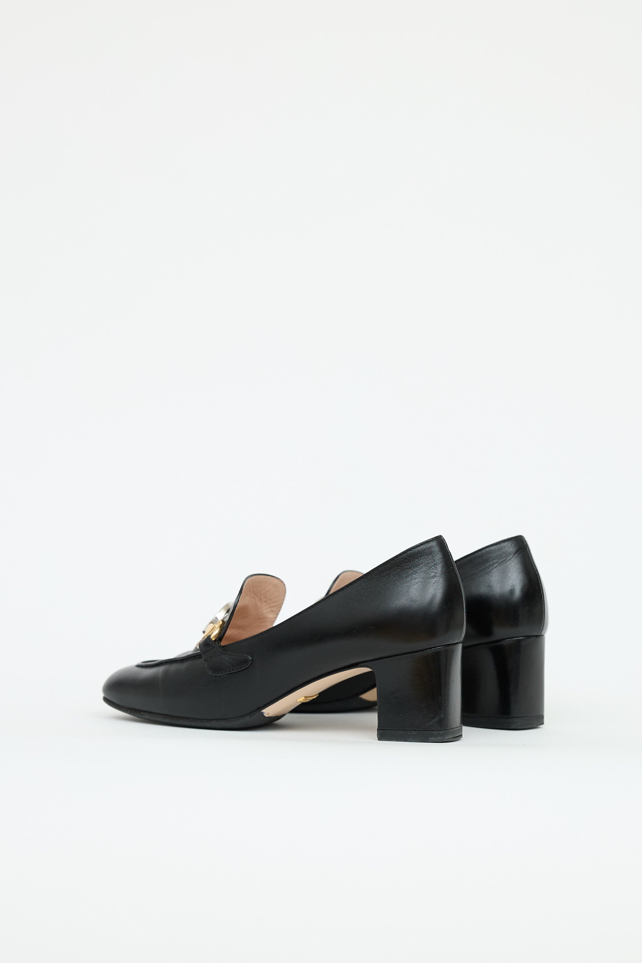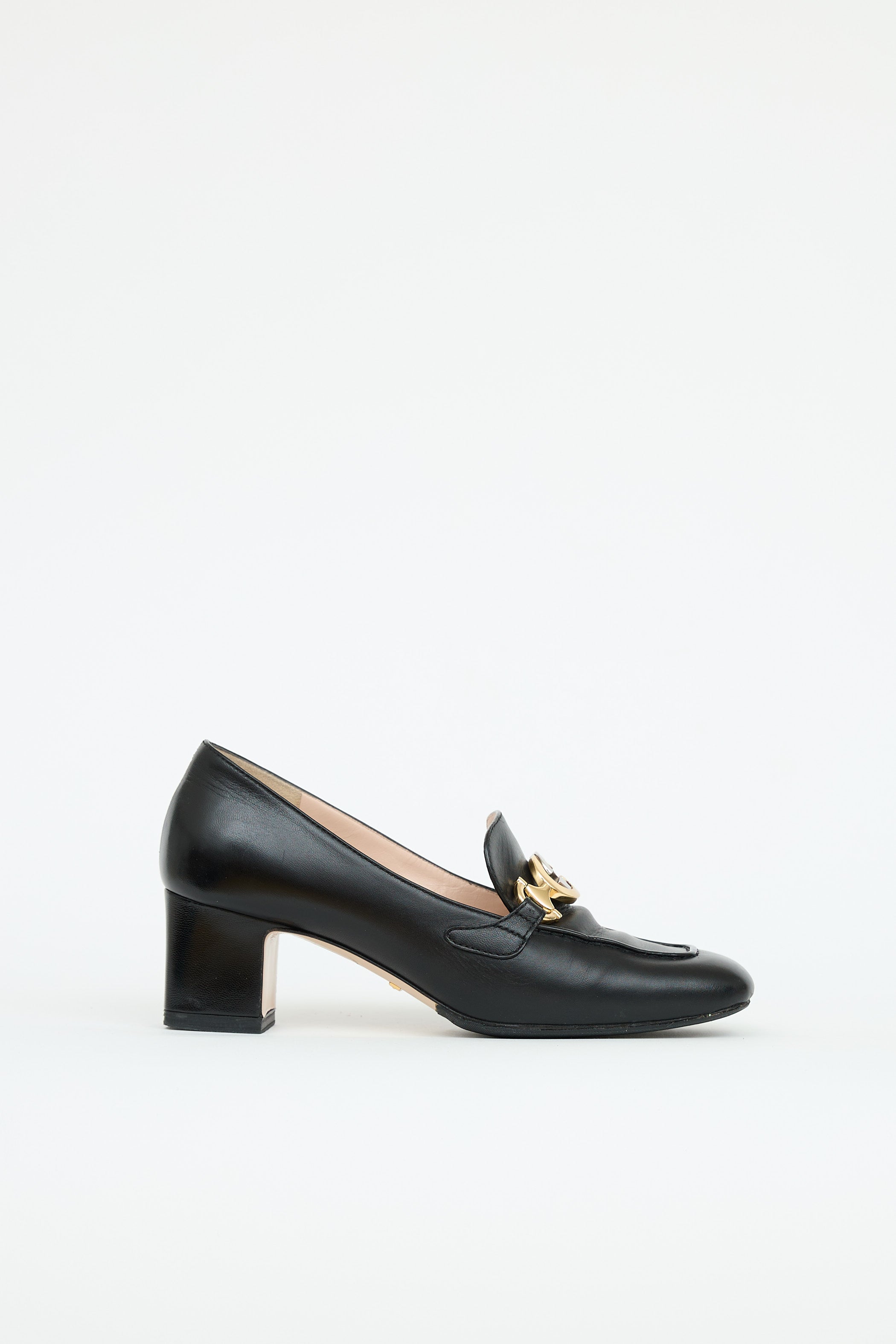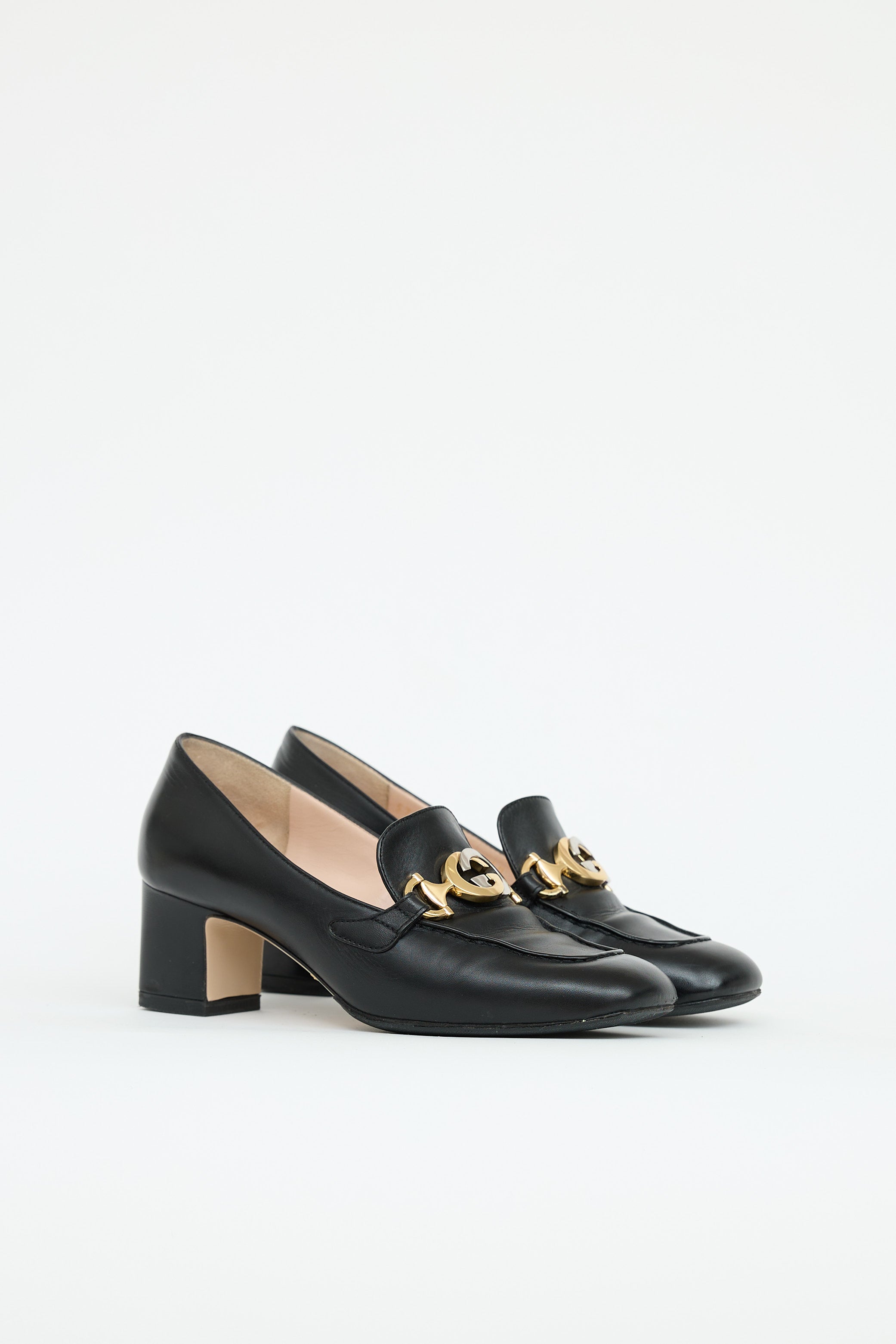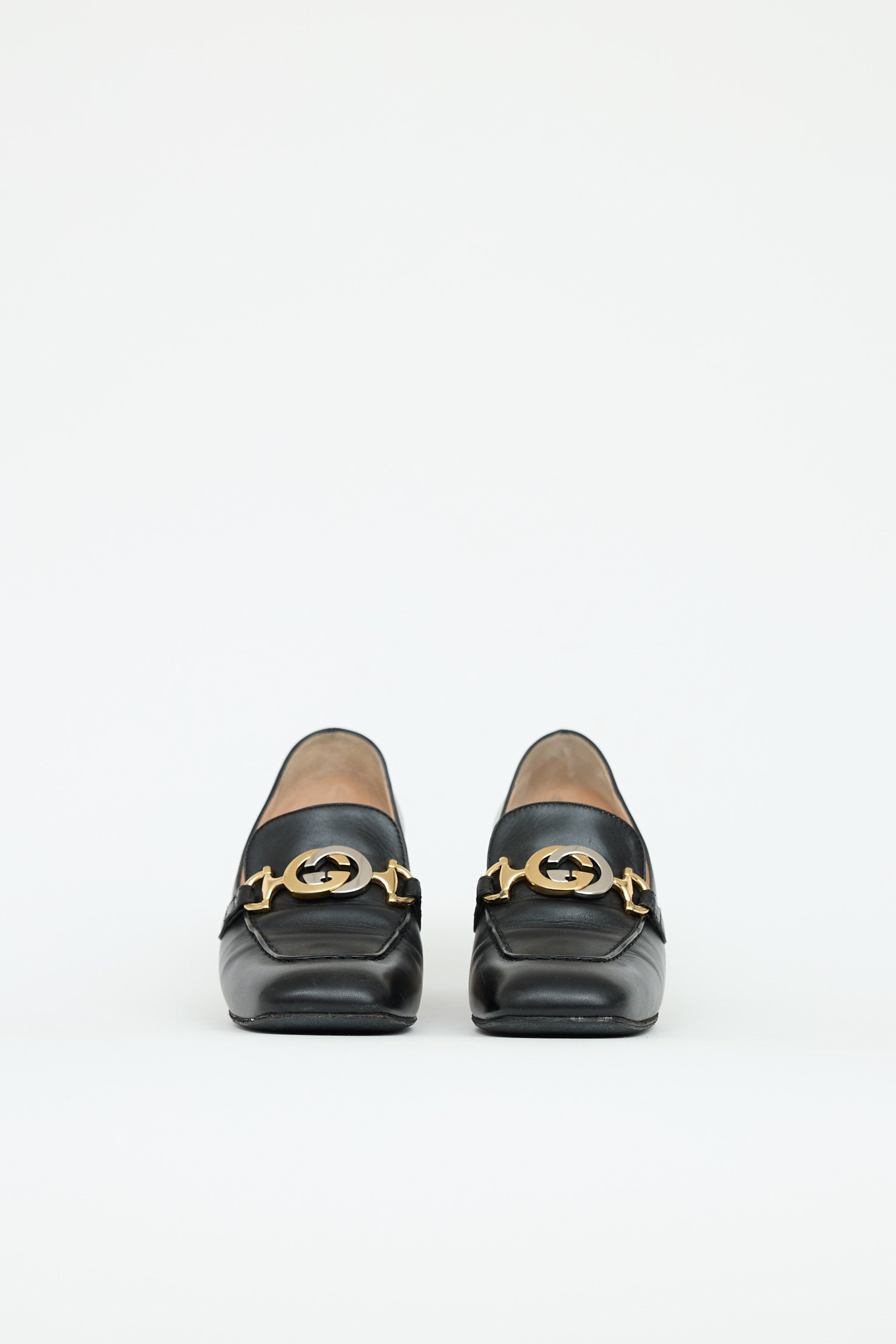 Pre-owned Gucci black Zumi block heel loafers featuring a square toe, gold and silver tone horsebit GG buckle across vamp, slip on entry, wrapped block heel, and leather outsole.