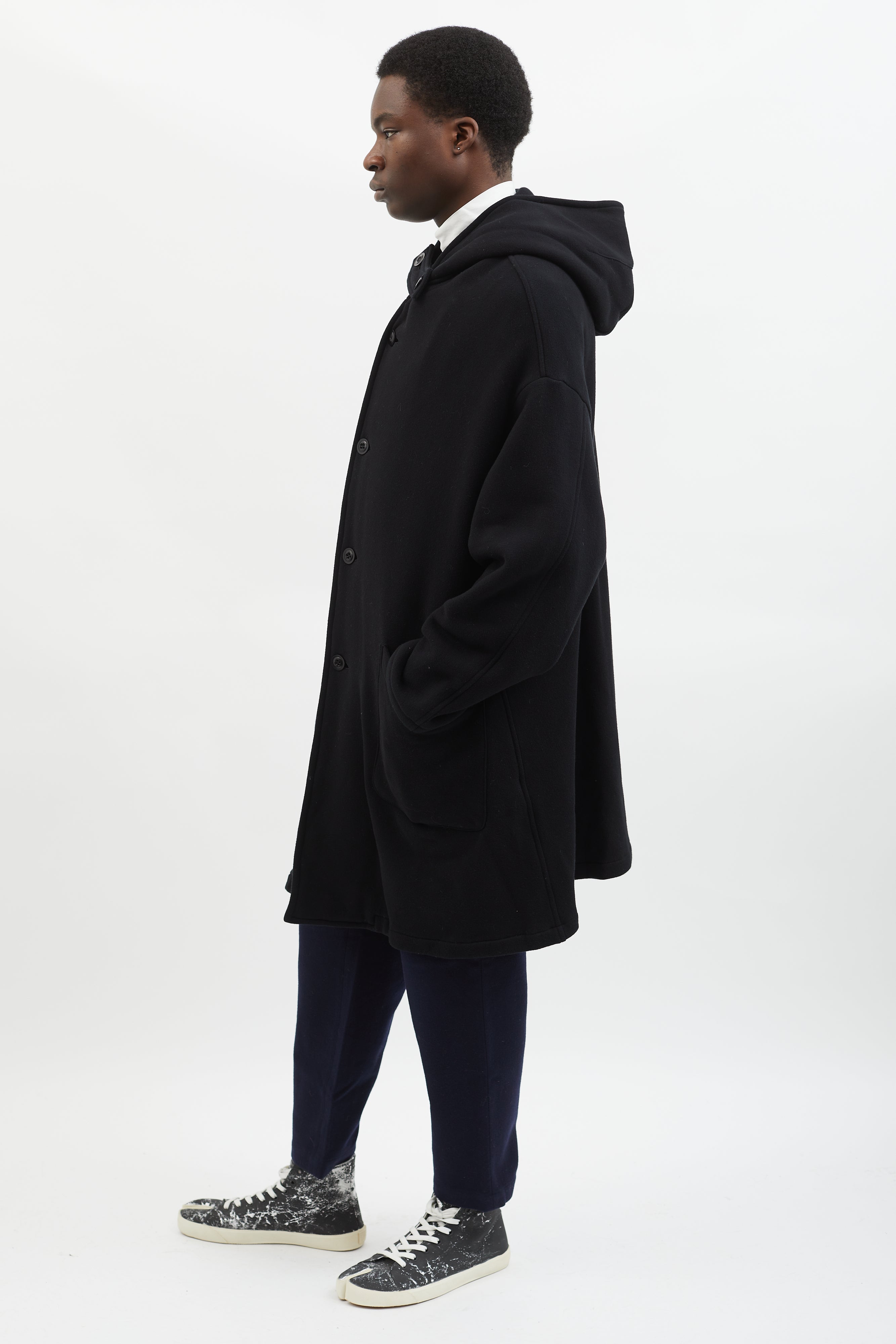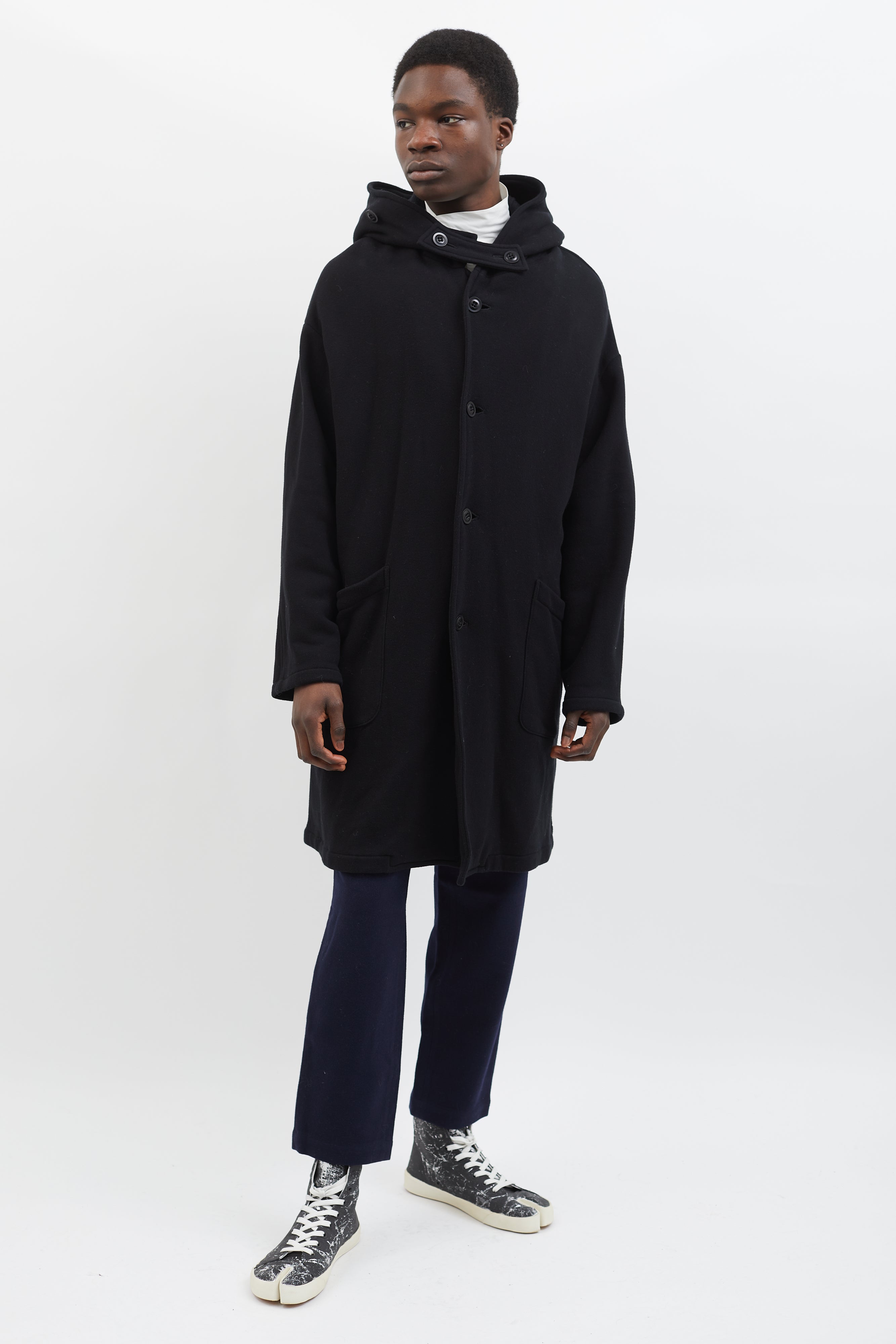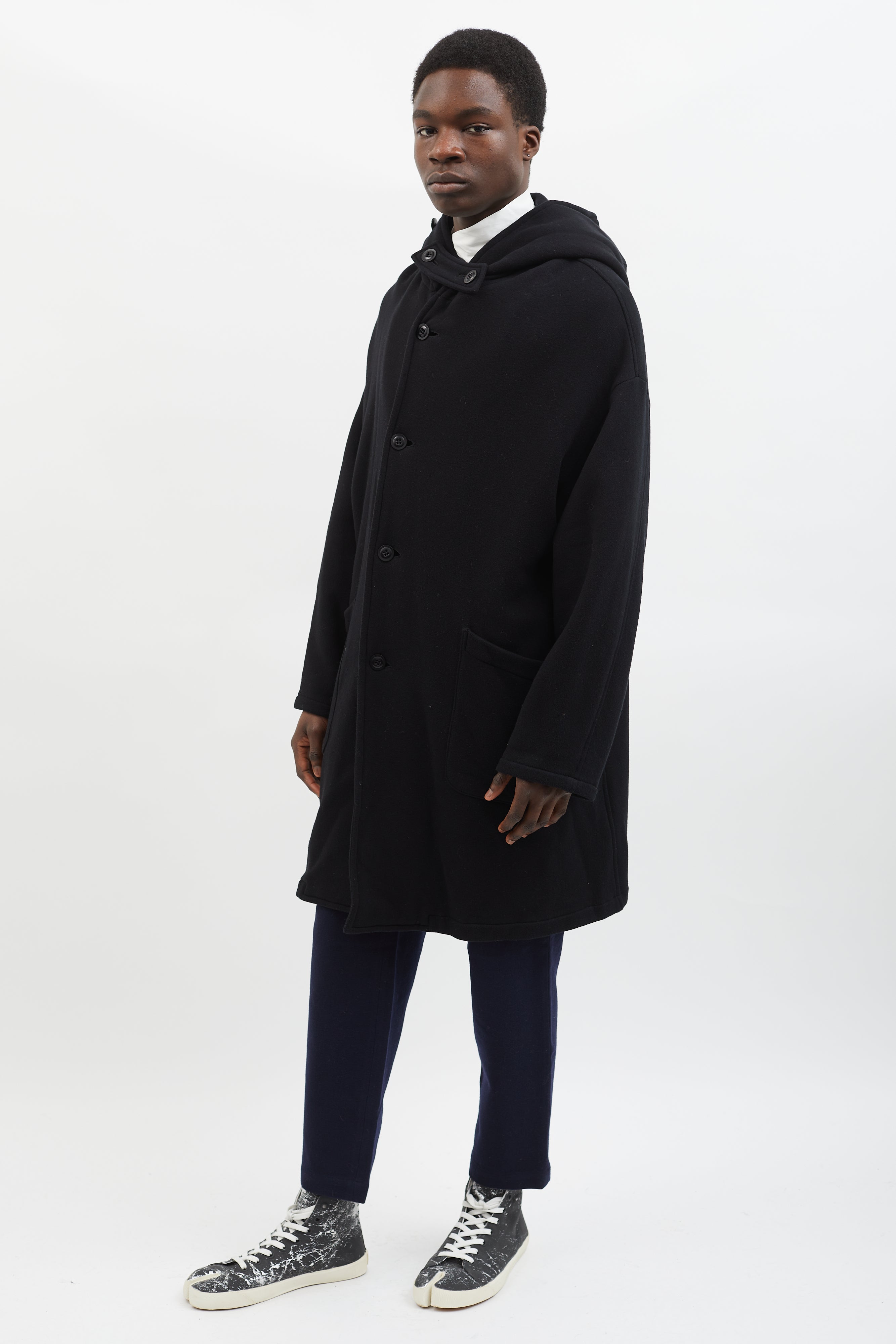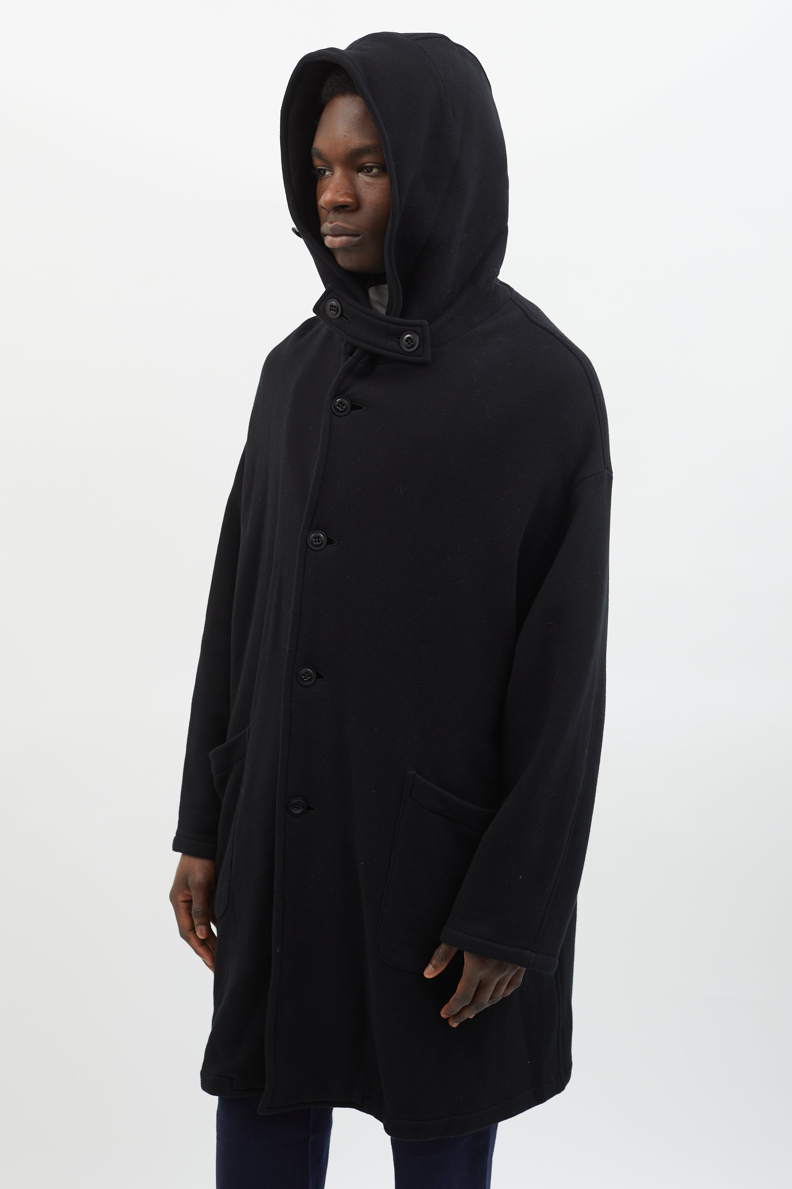 Pre-owned Y's Yohji Yamamoto fleece raise coat in black featuring attached hood with button fastener, two pocket styling, boxy fit, and button closure at front.