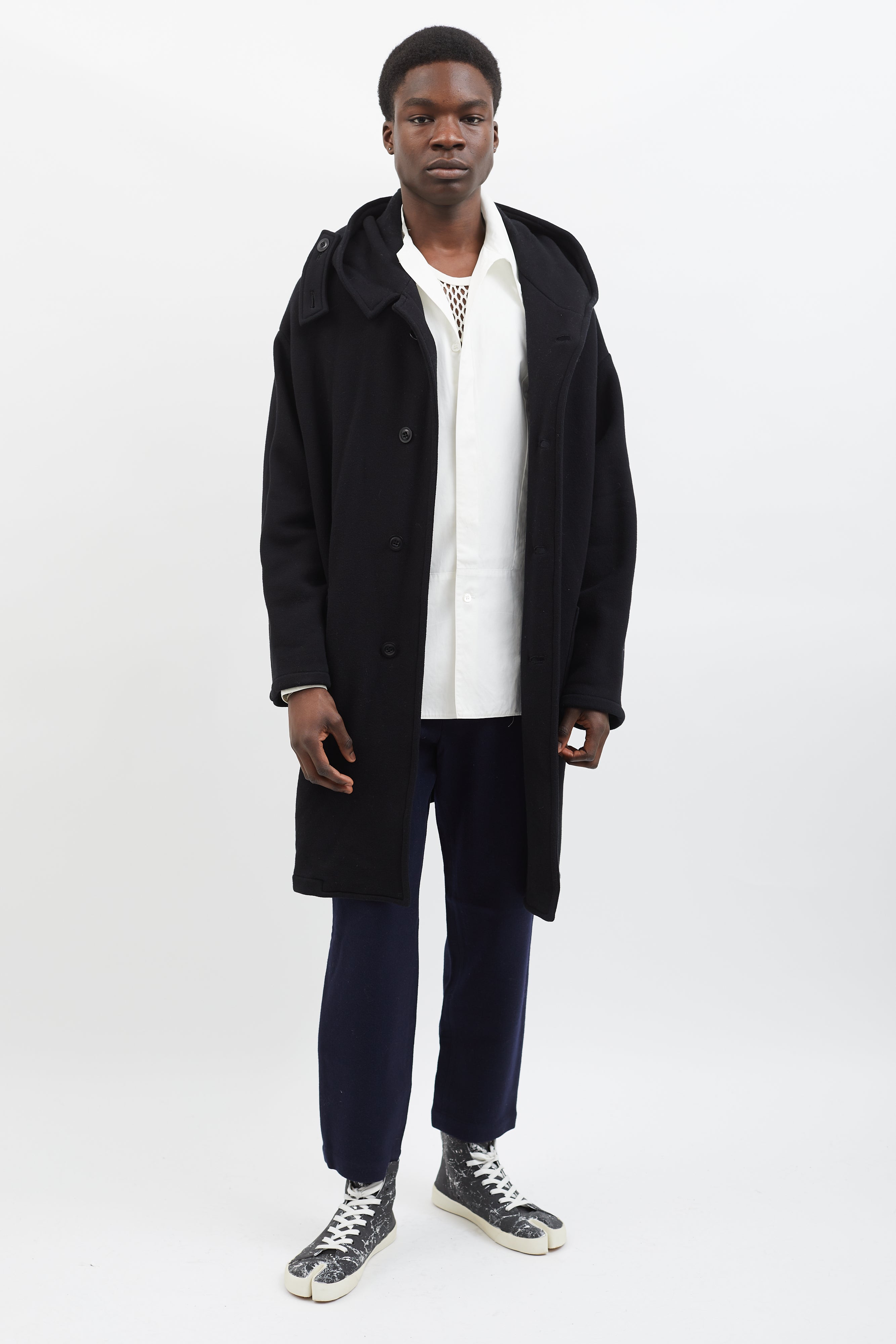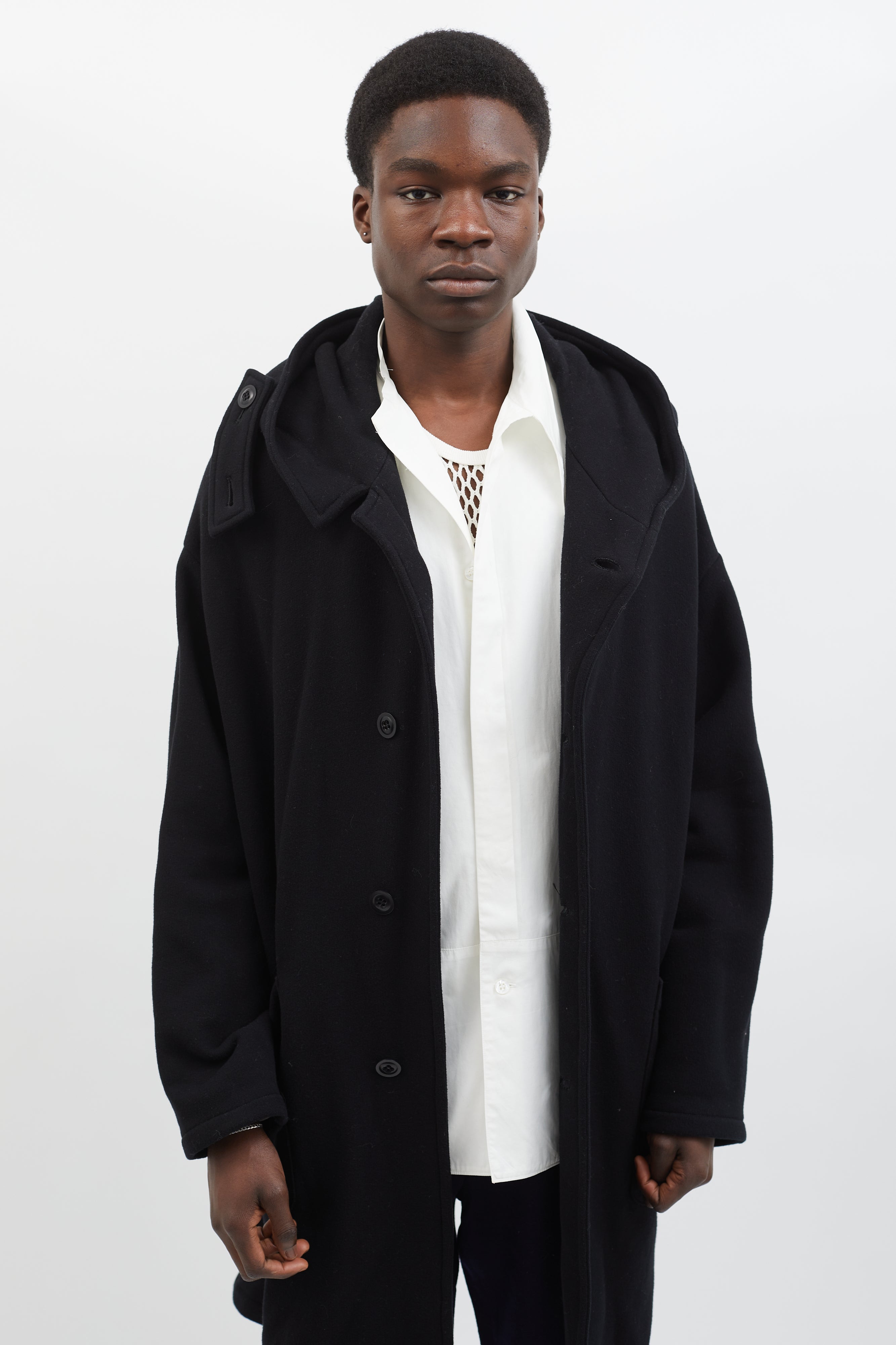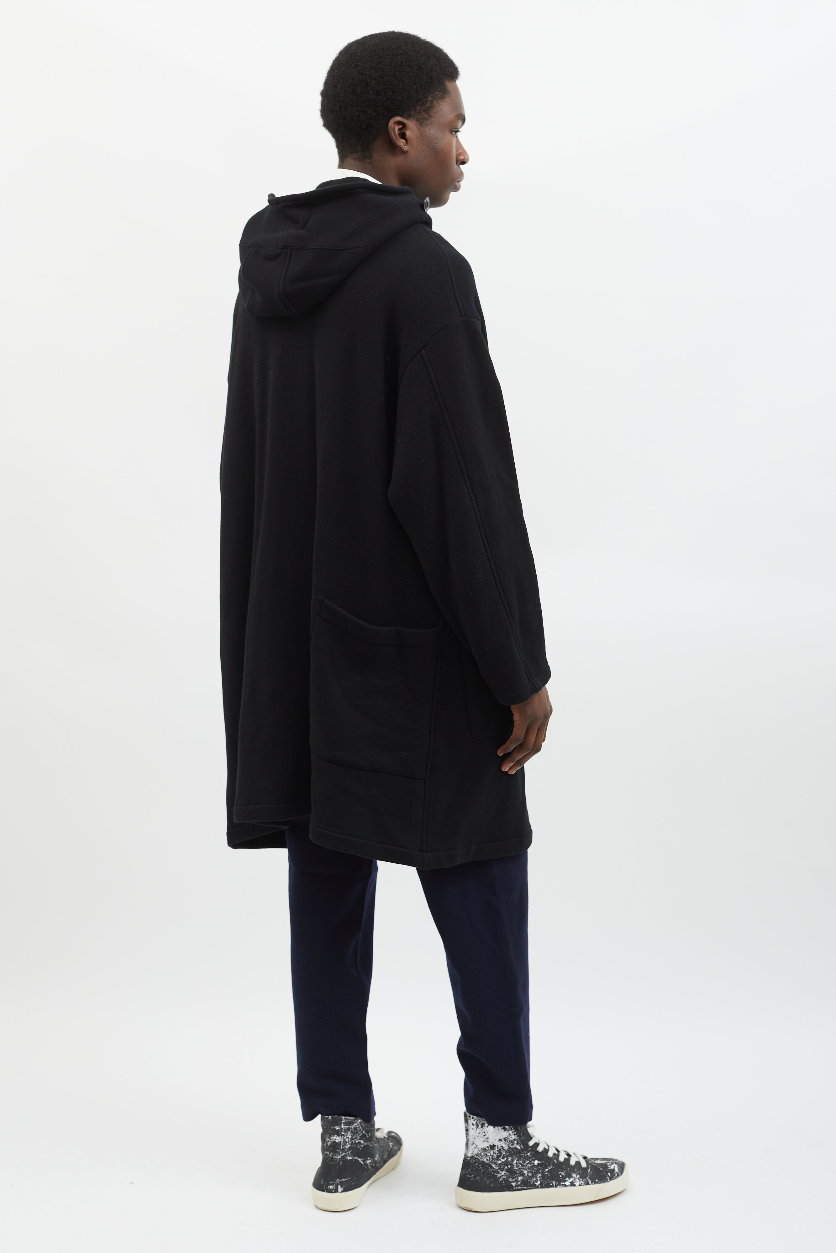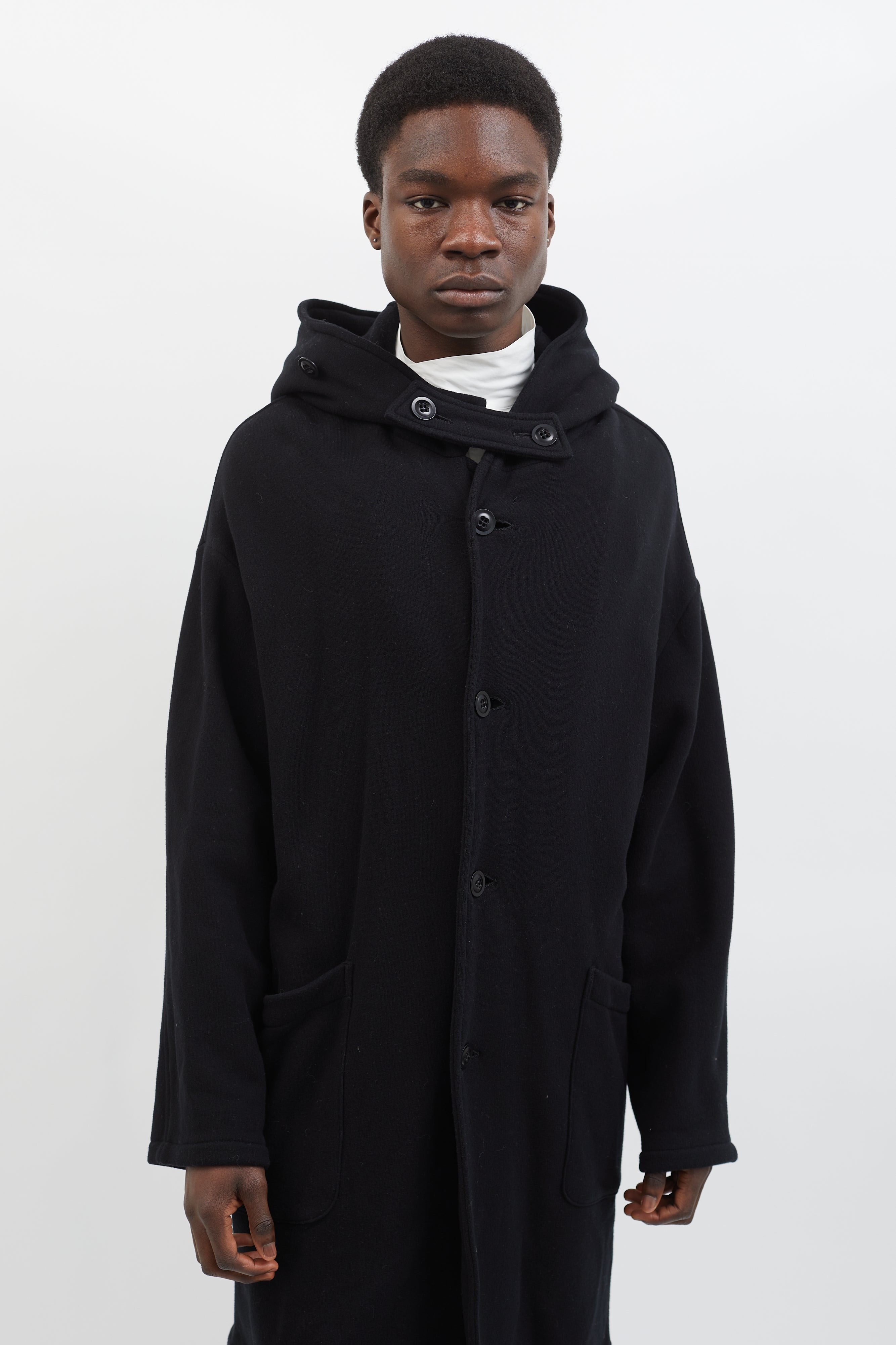 Pre-owned Y's Yohji Yamamoto fleece raise coat in black featuring attached hood with button fastener, two pocket styling, boxy fit, and button closure at front.