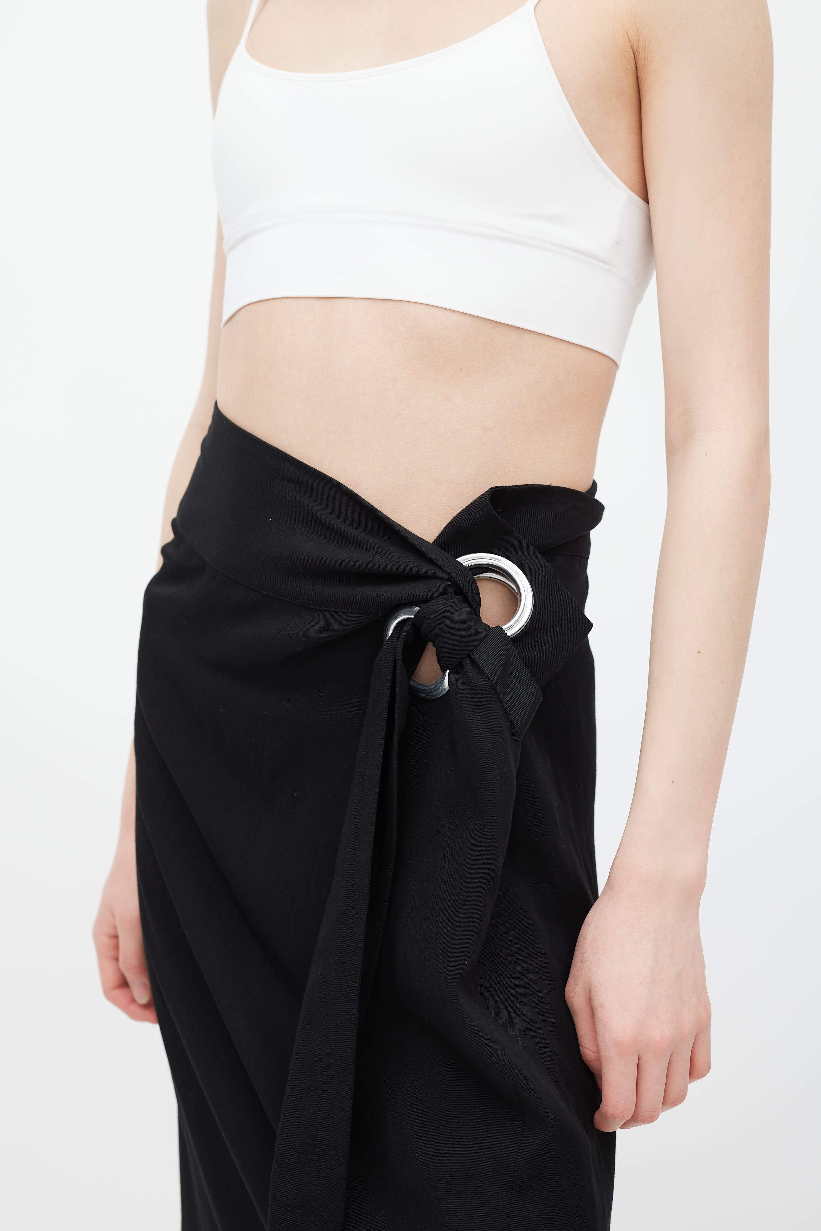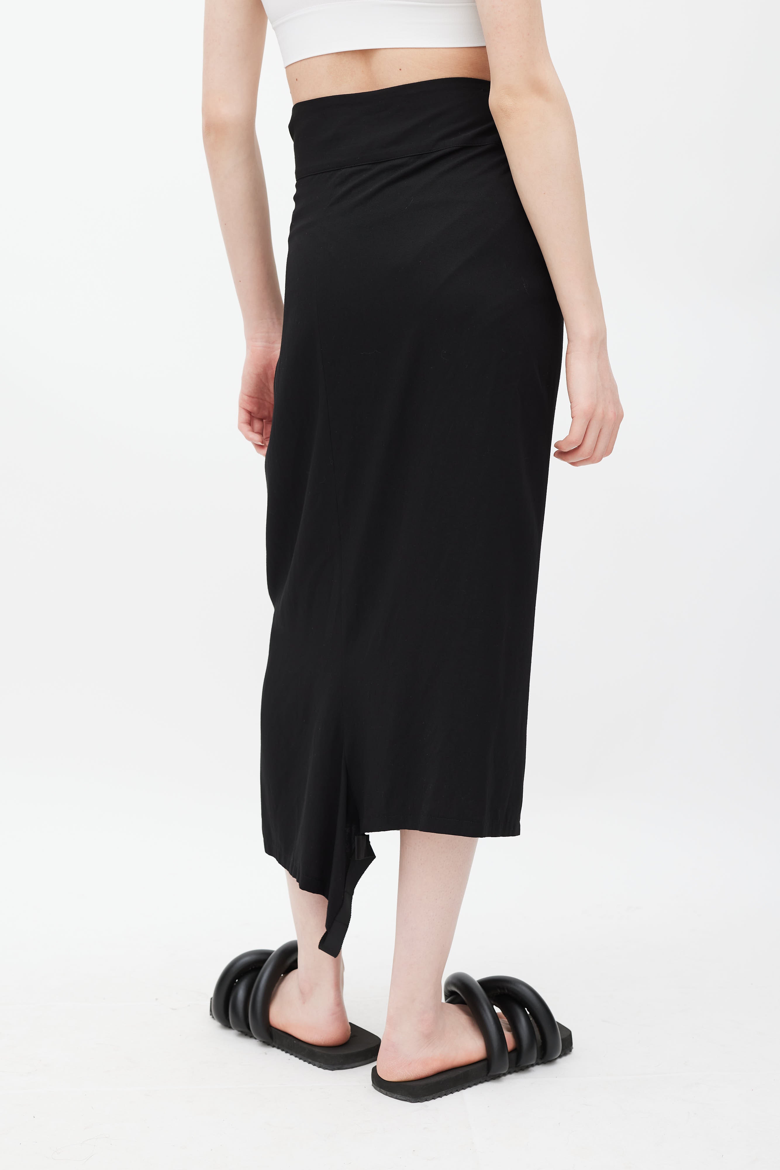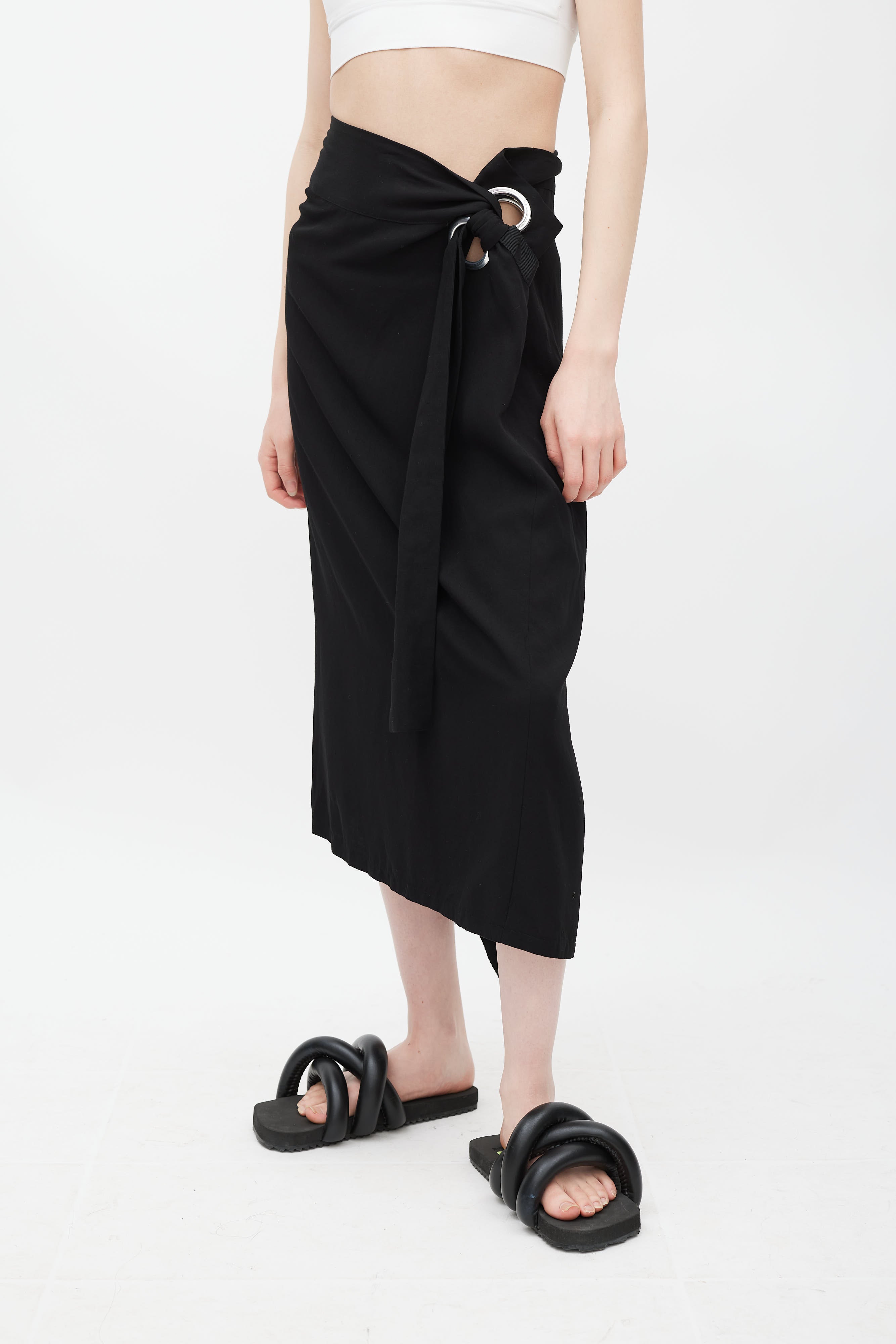 Pre-owned Yohji Yamamoto black skirt featuring a handkerchief hem, and silver tone eyelet hardware at side with tie closure. Clipped to fit model.
