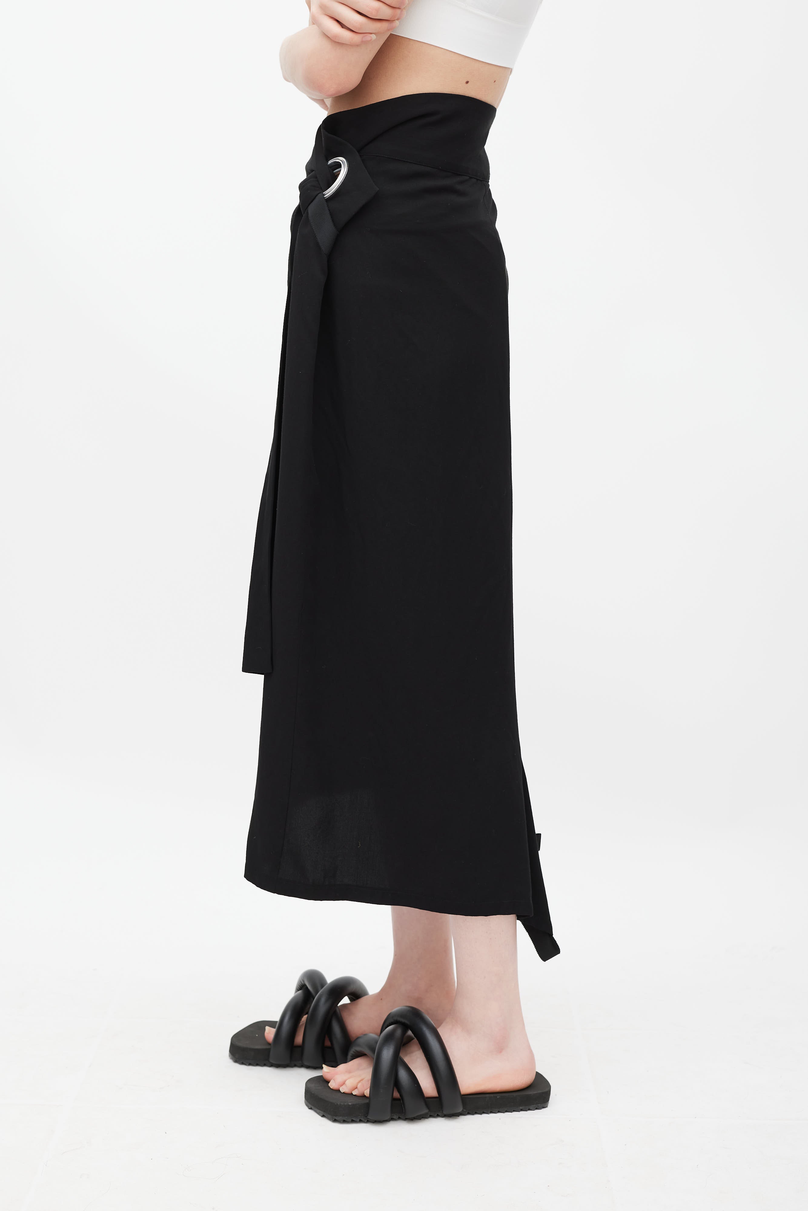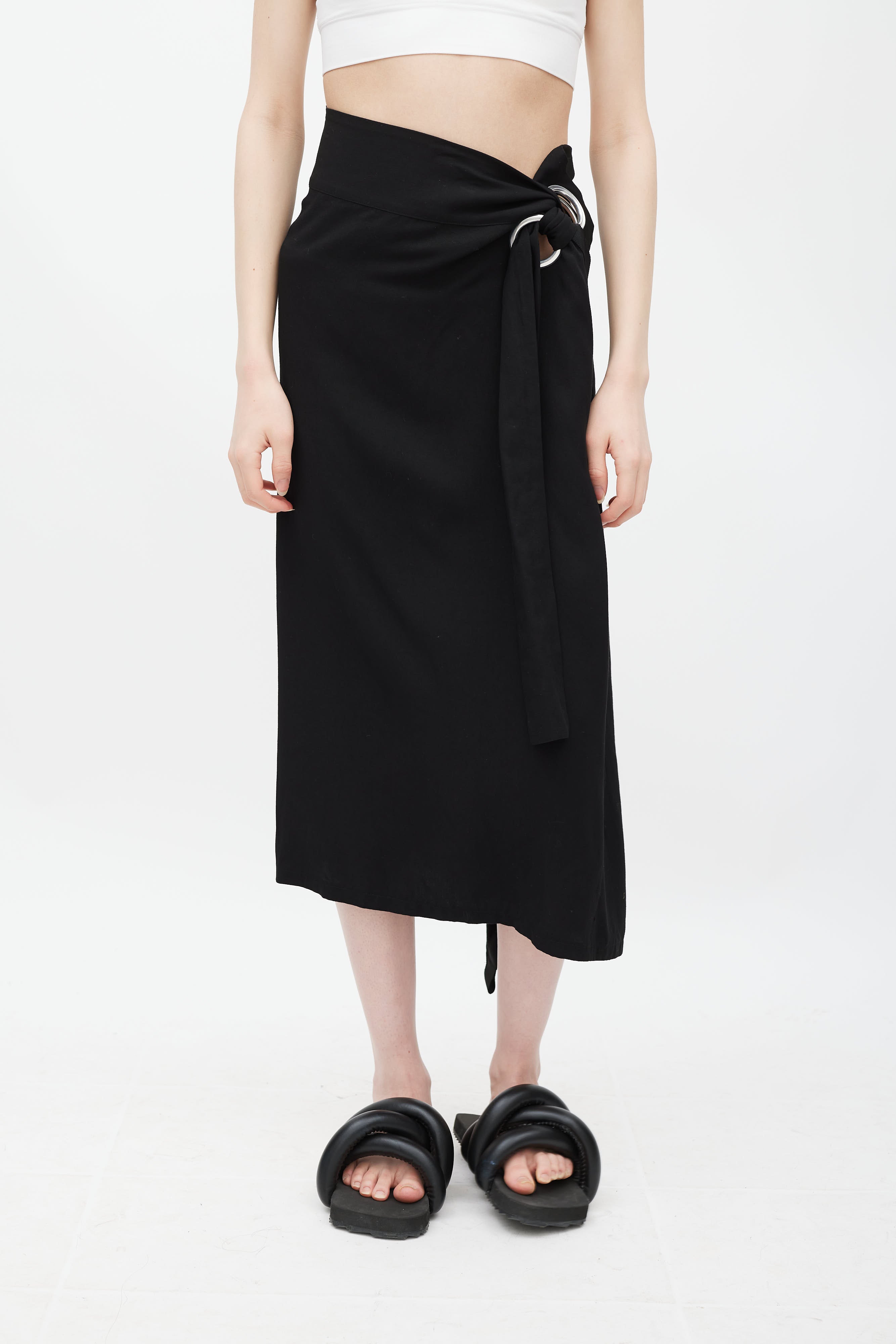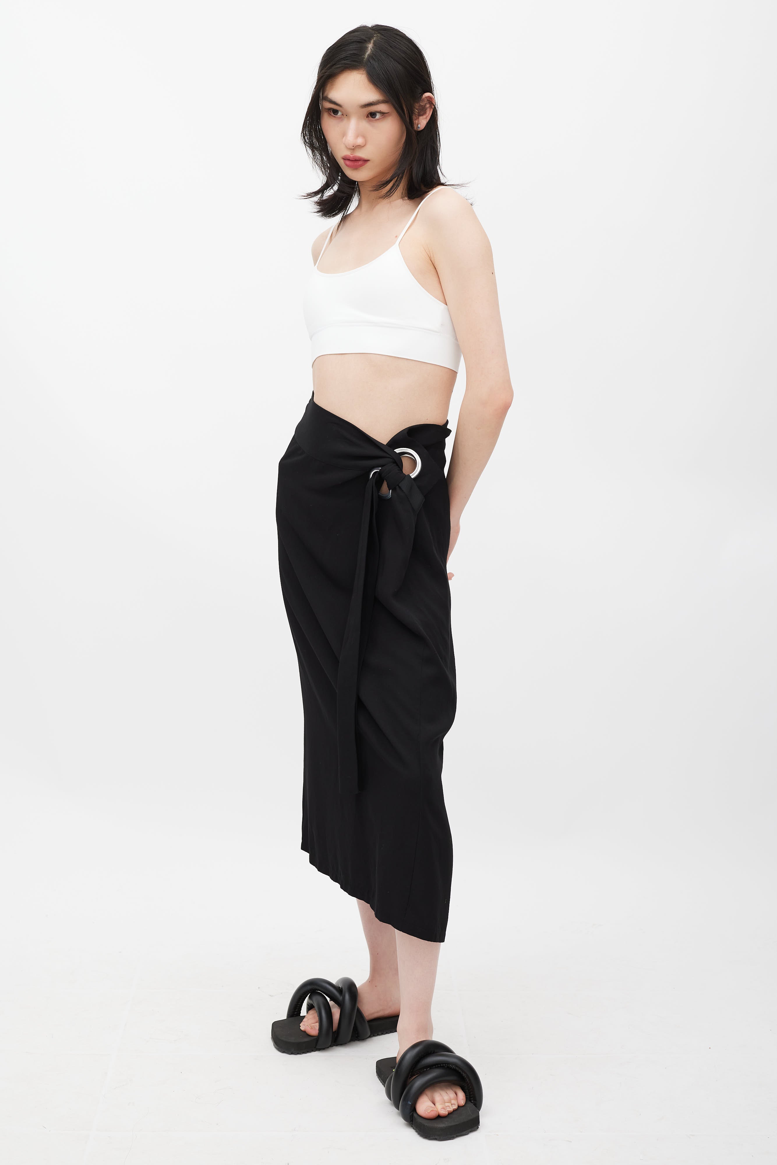 Pre-owned Yohji Yamamoto black skirt featuring a handkerchief hem, and silver tone eyelet hardware at side with tie closure. Clipped to fit model.