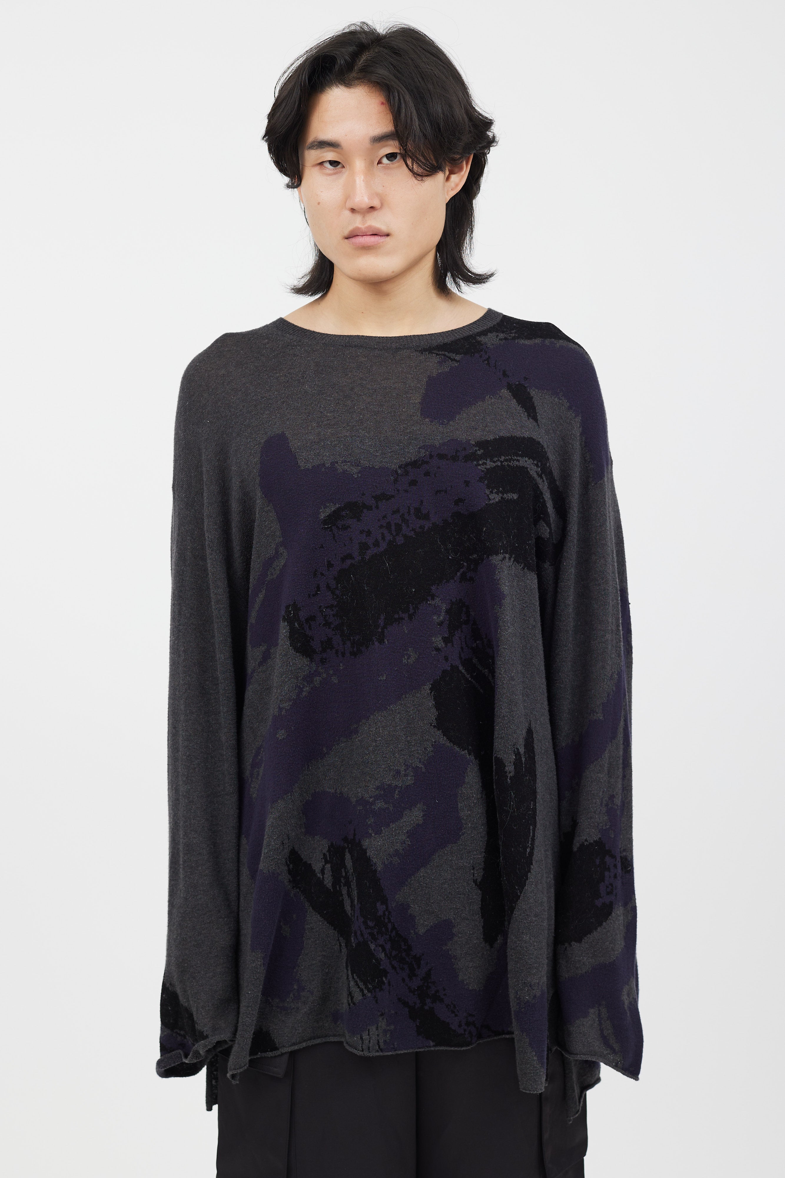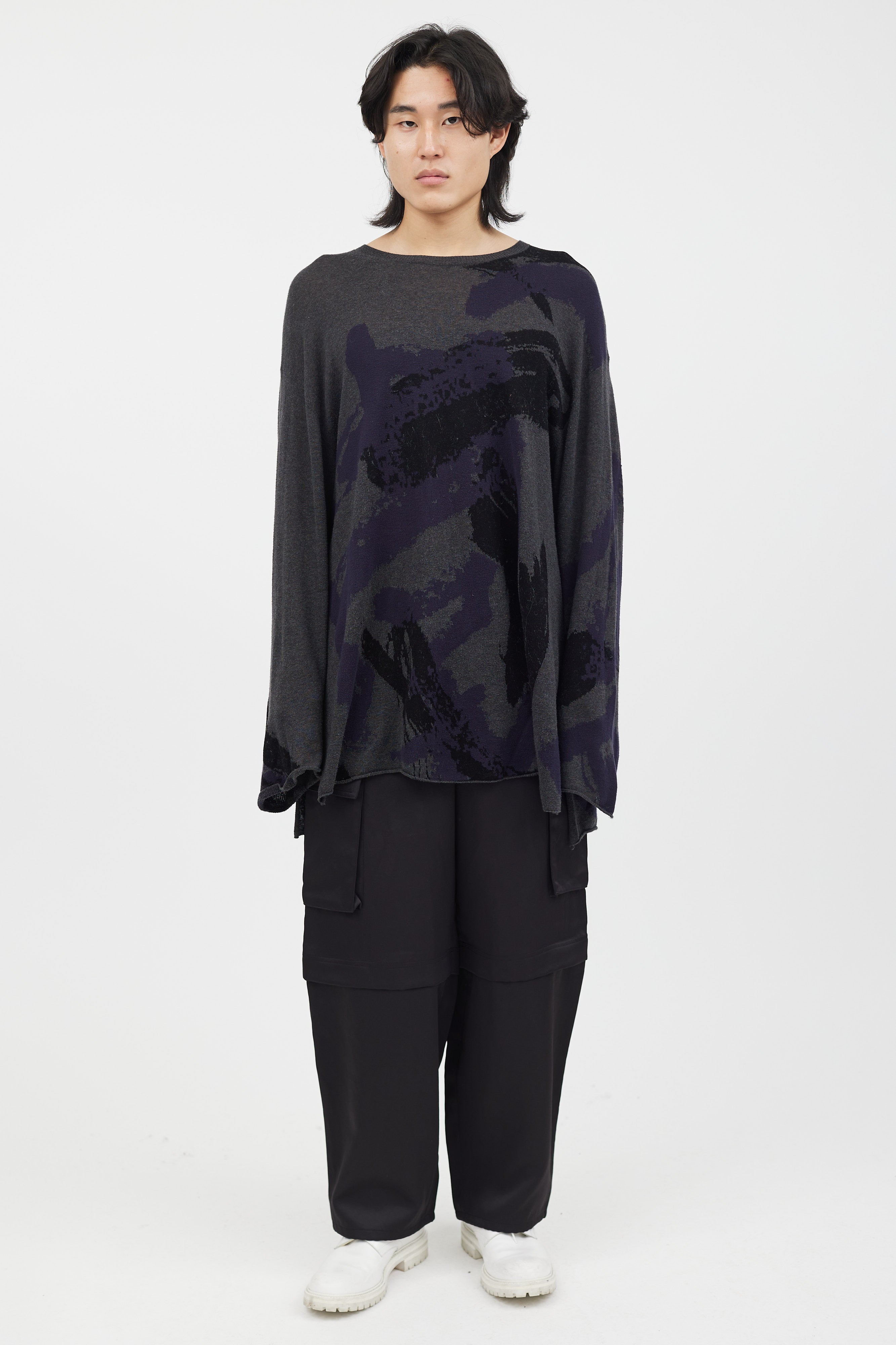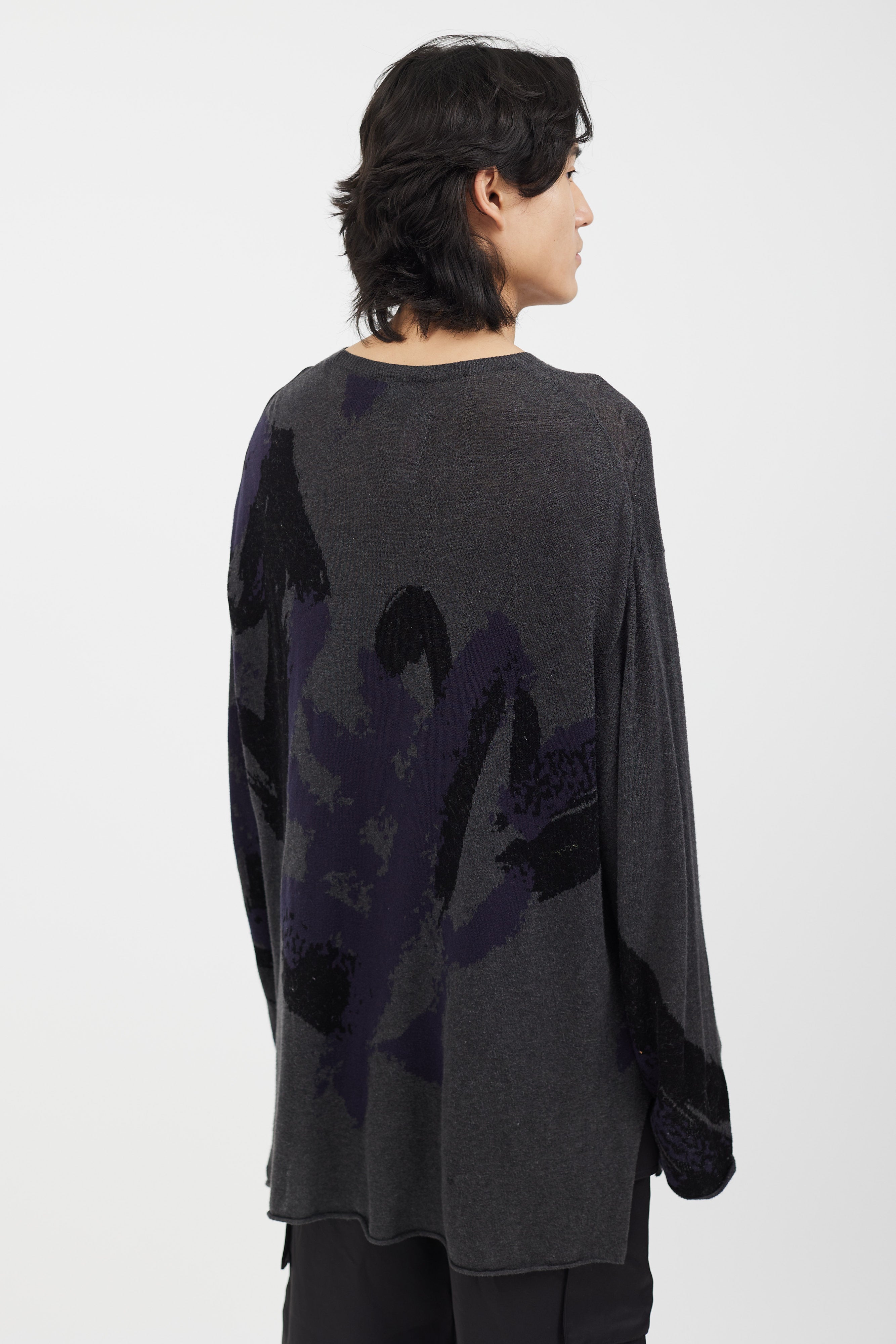Pre-owned Yohji Yamamoto grey knit sweater featuring blue and black graphic at front, raw hem and cuffs, slit openings at side of hem, and ribbed crew neckline.