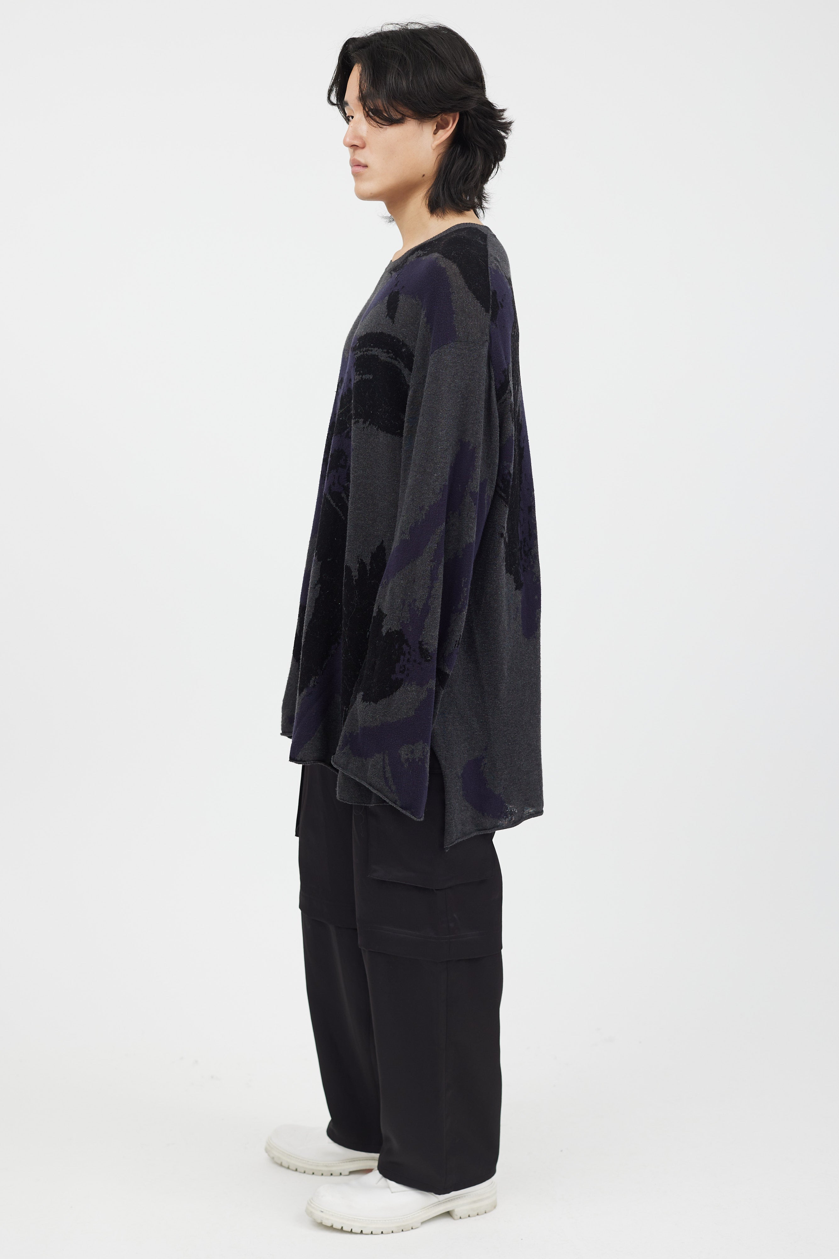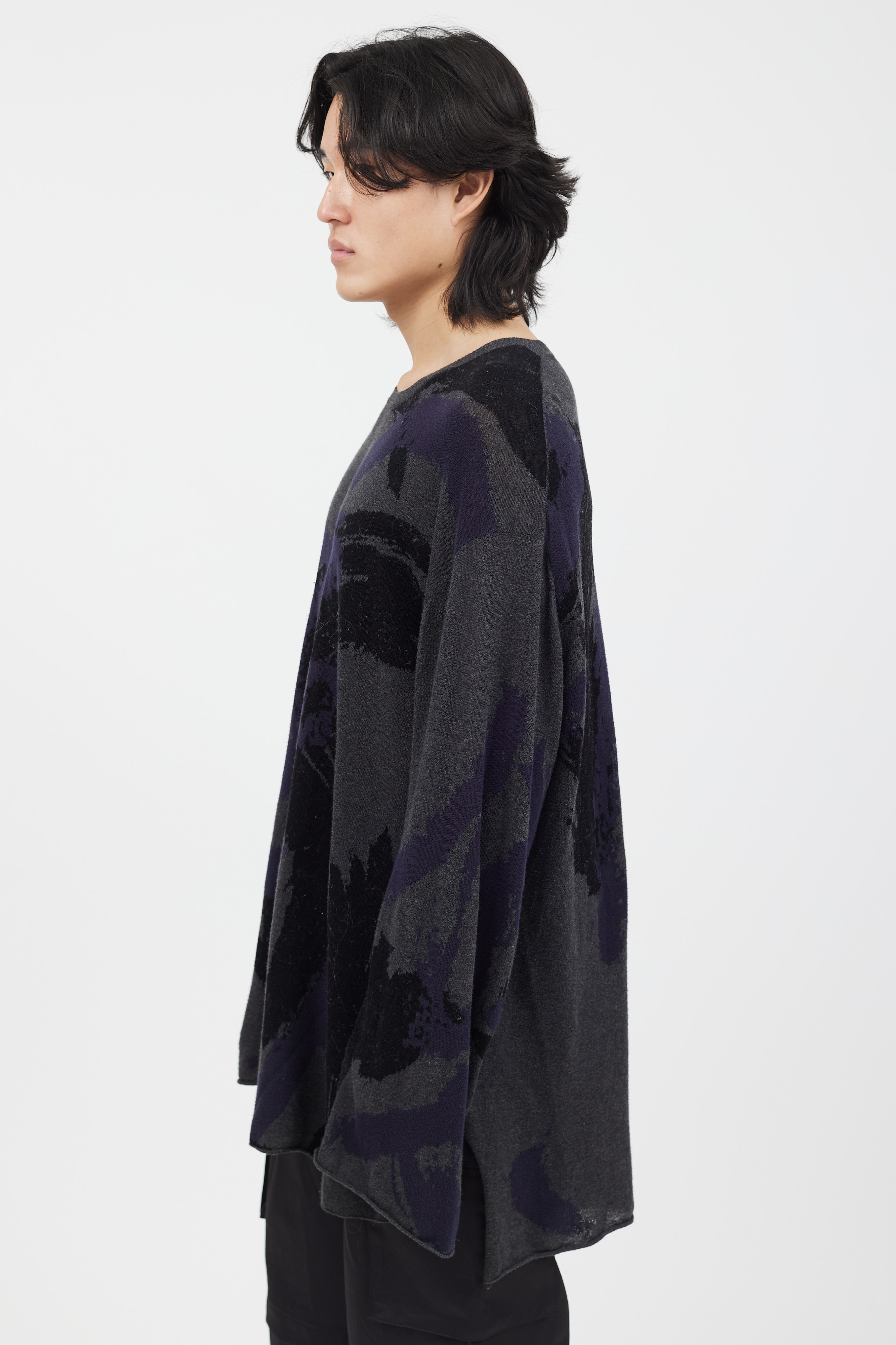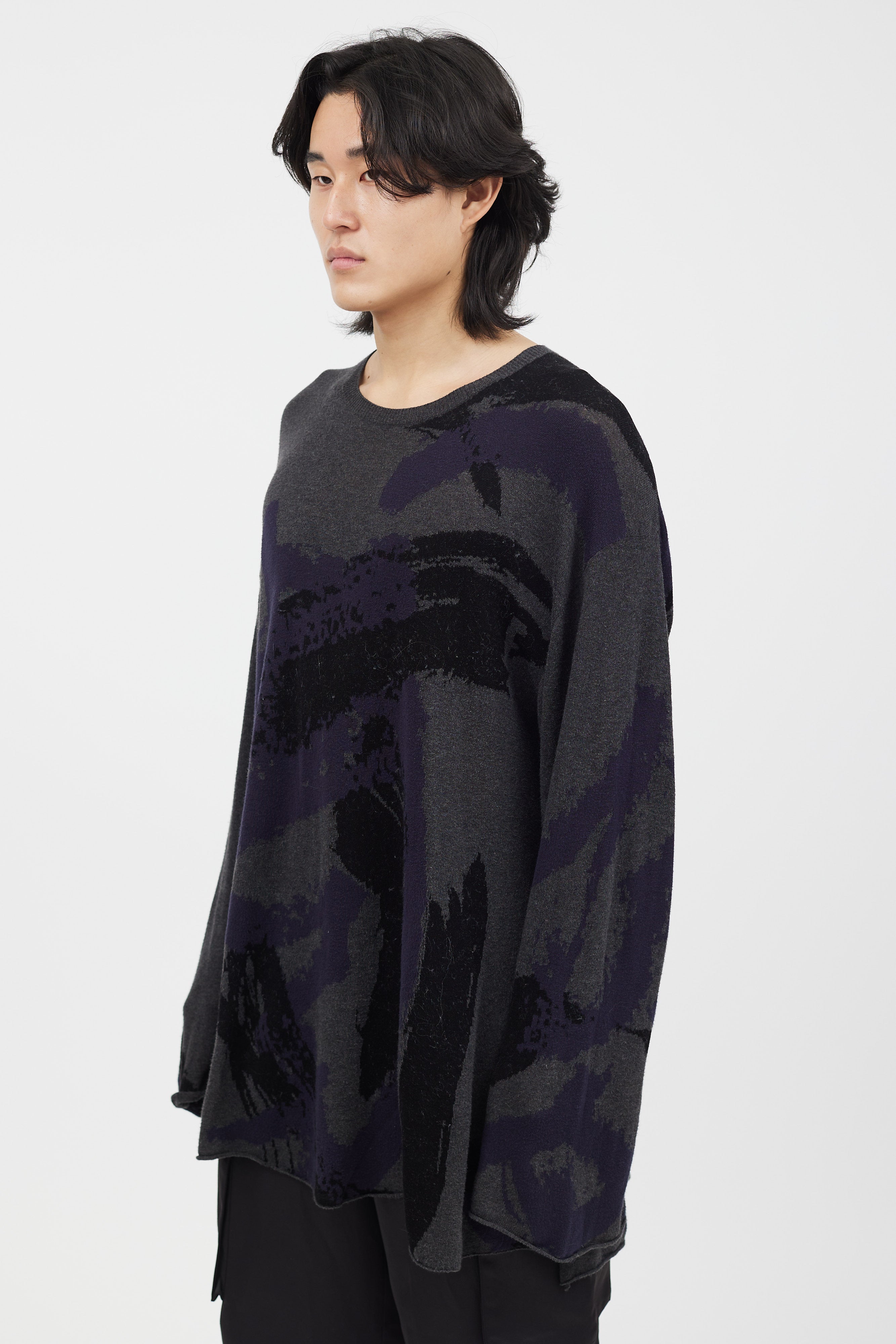 Pre-owned Yohji Yamamoto grey knit sweater featuring blue and black graphic at front, raw hem and cuffs, slit openings at side of hem, and ribbed crew neckline.