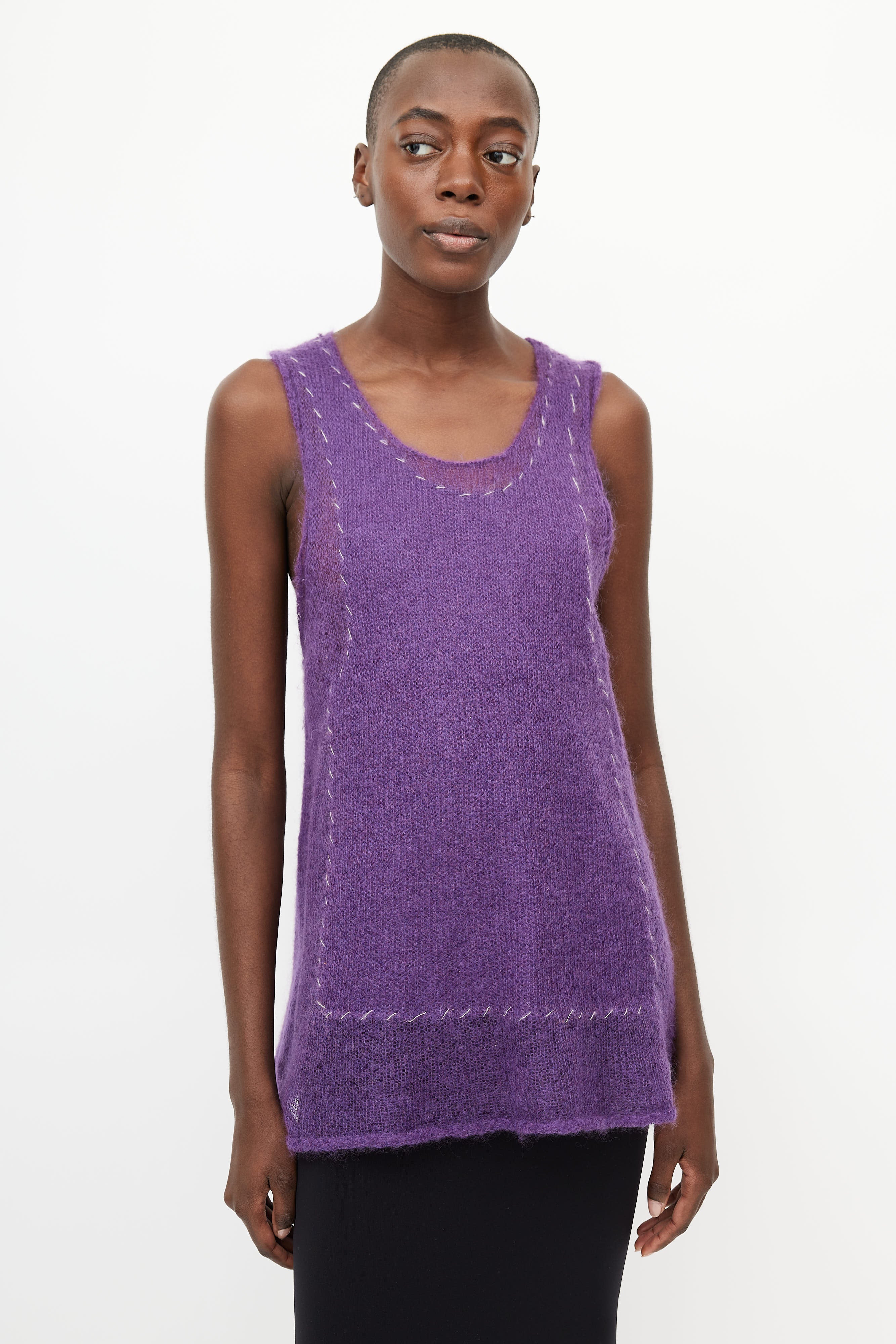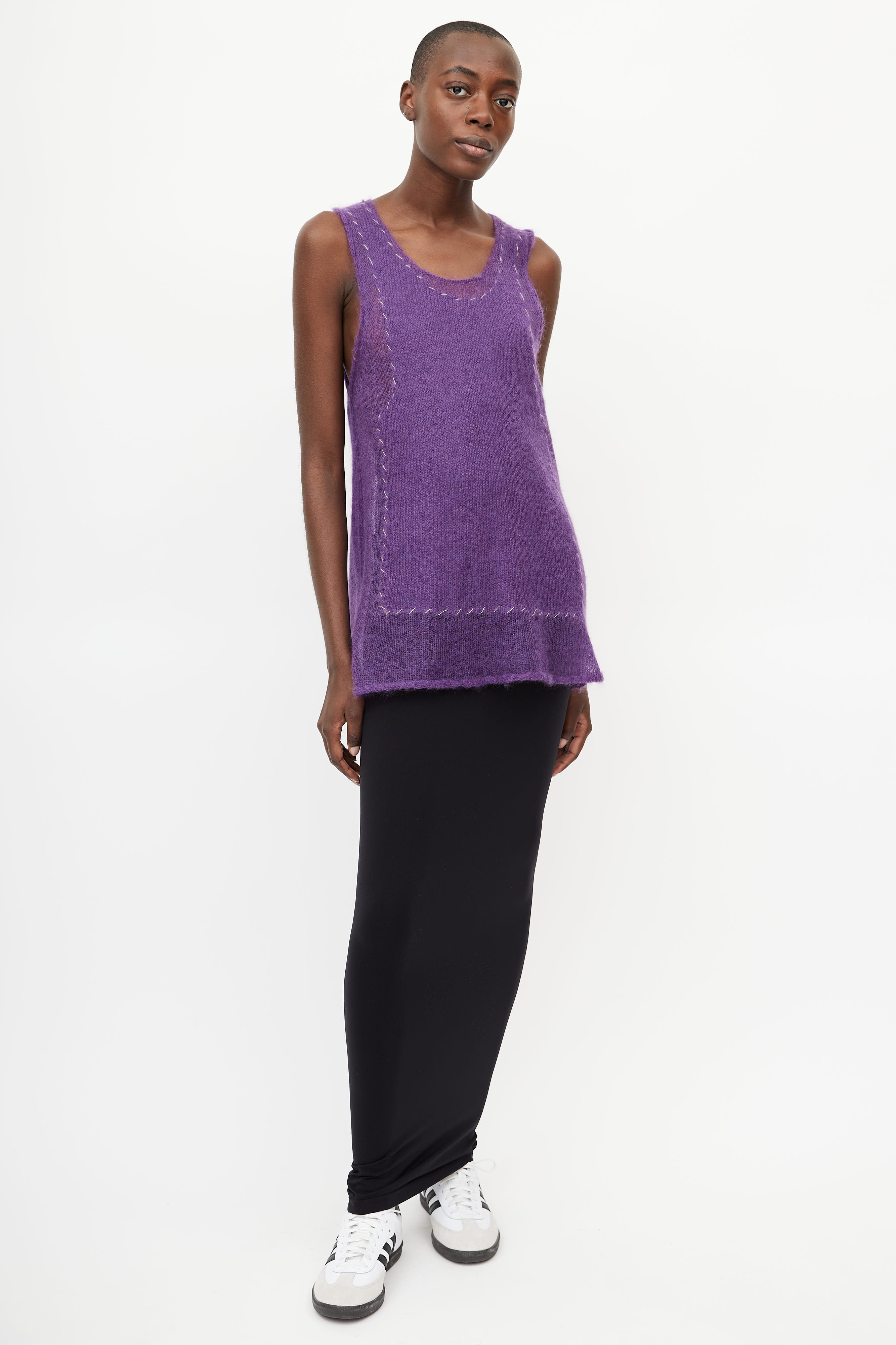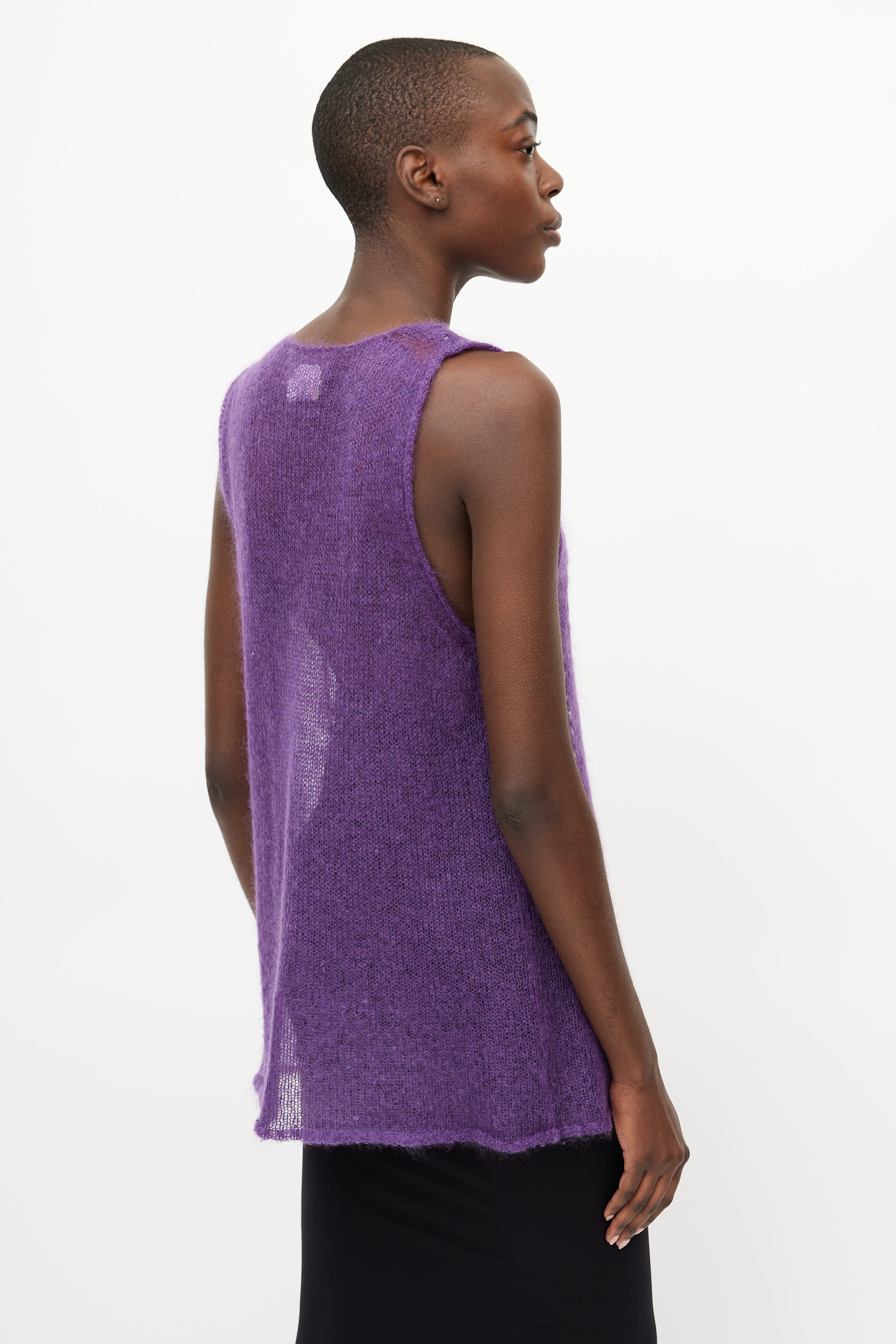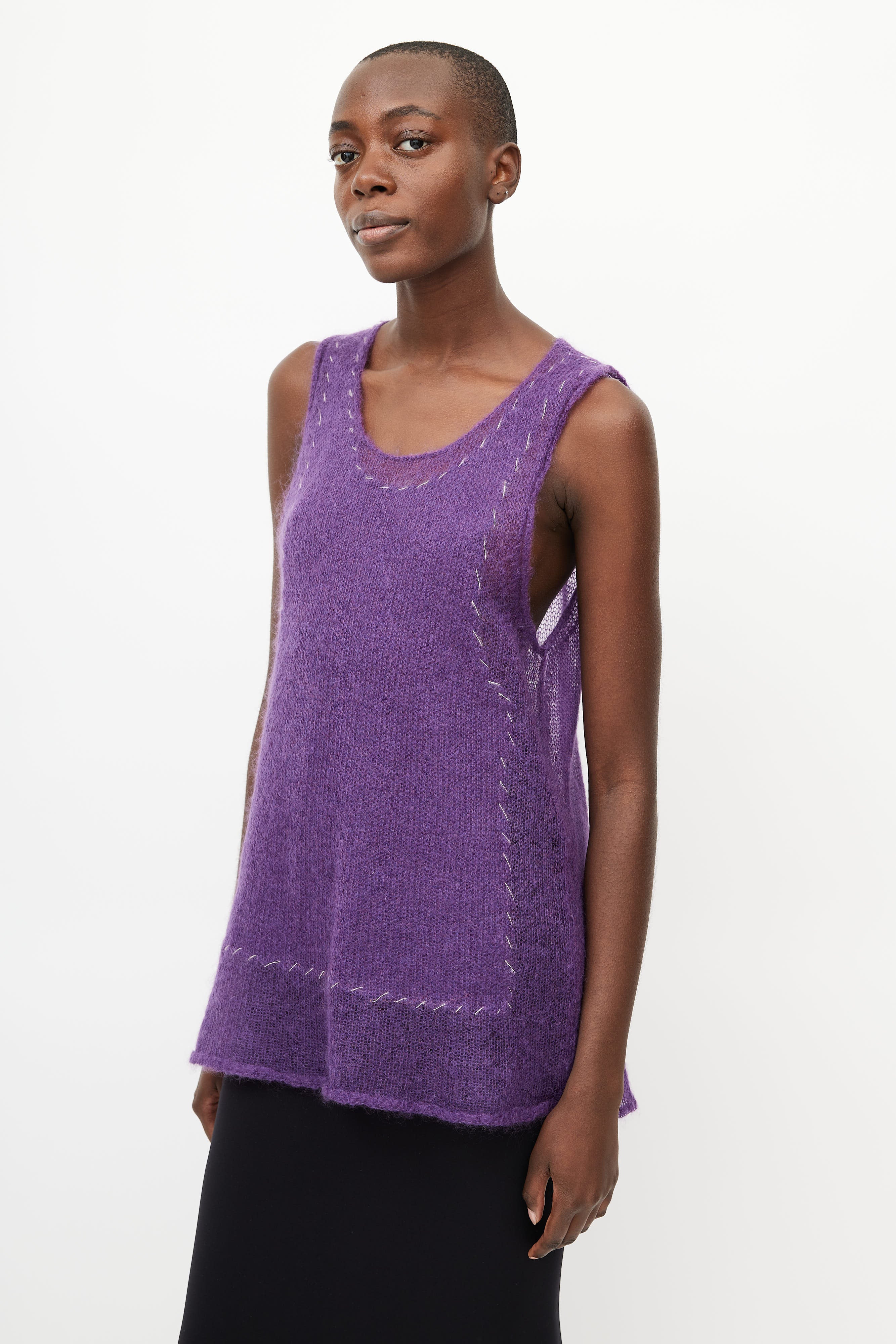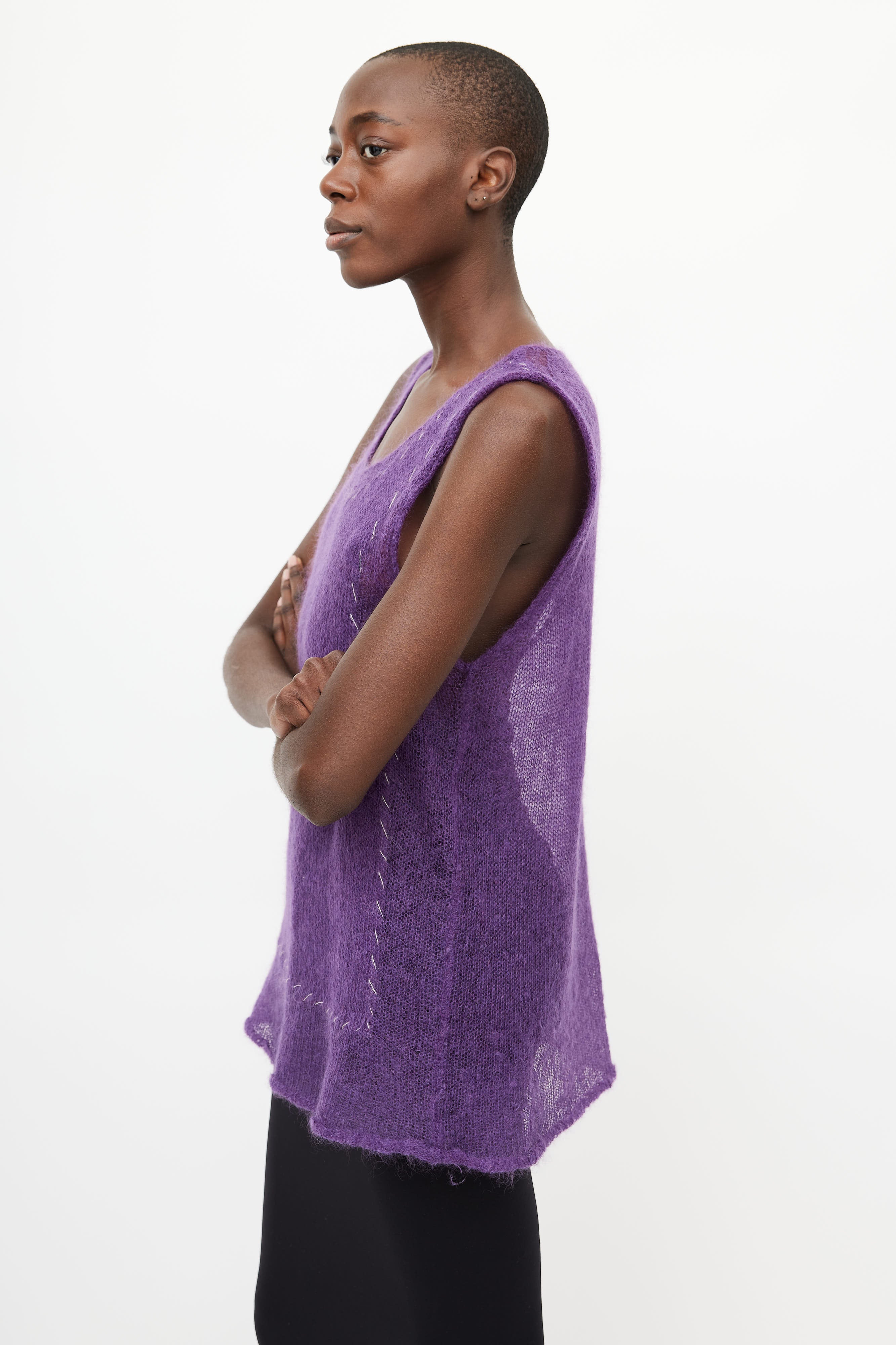 Pre-owned Yohji Yamamoto purple mohair knit vest featuring contrast stitching throughout, scoop neckline, and a wide fit.