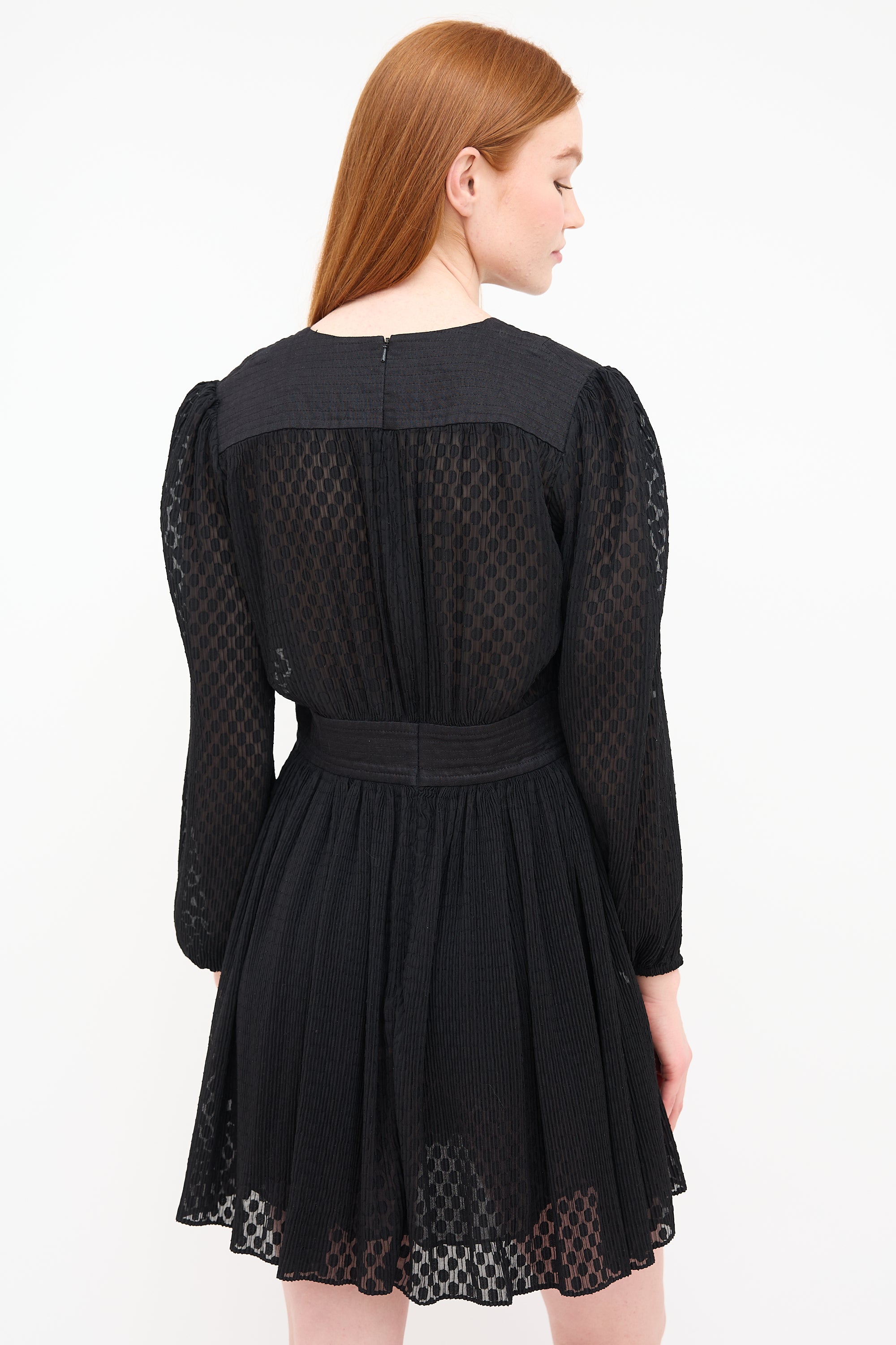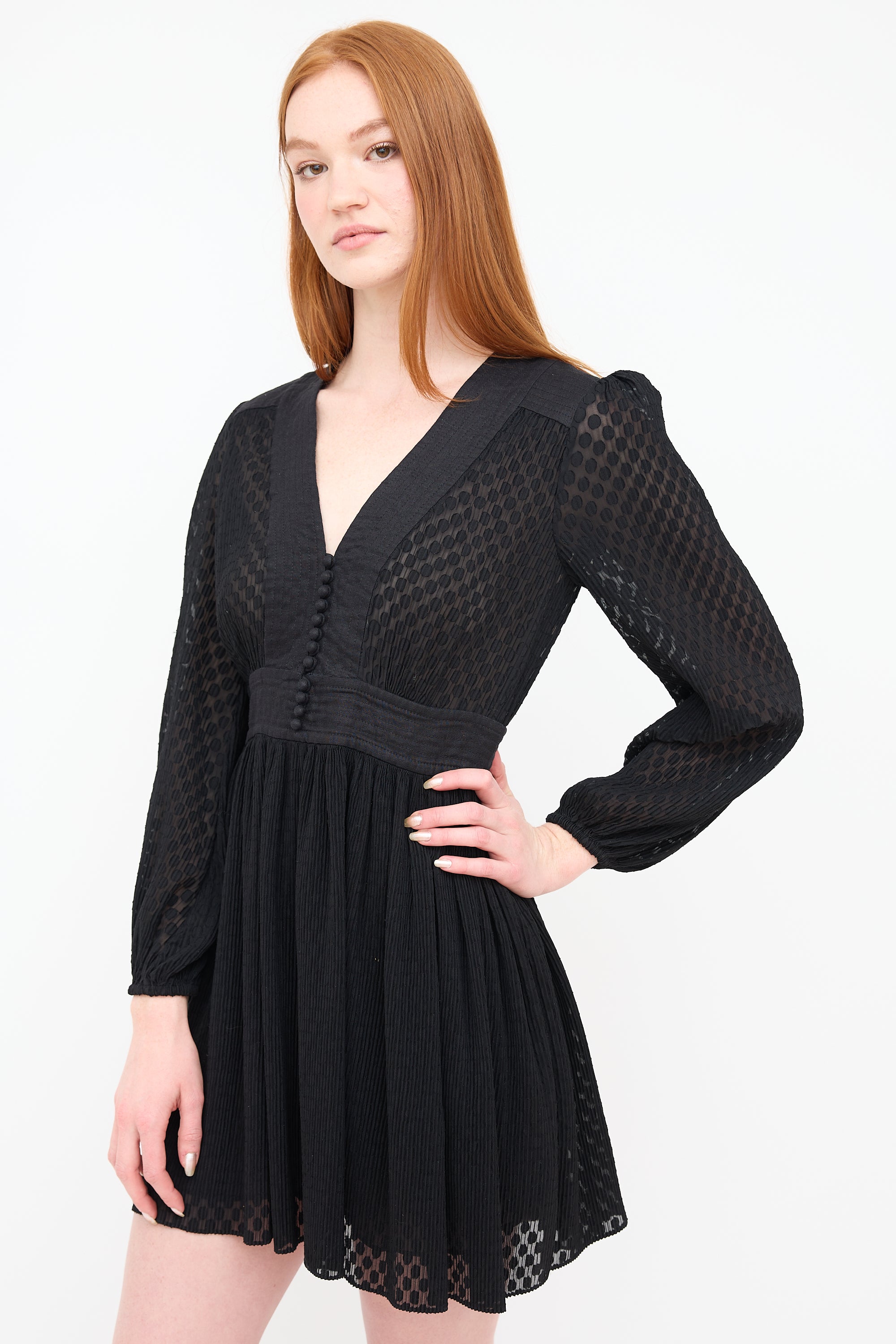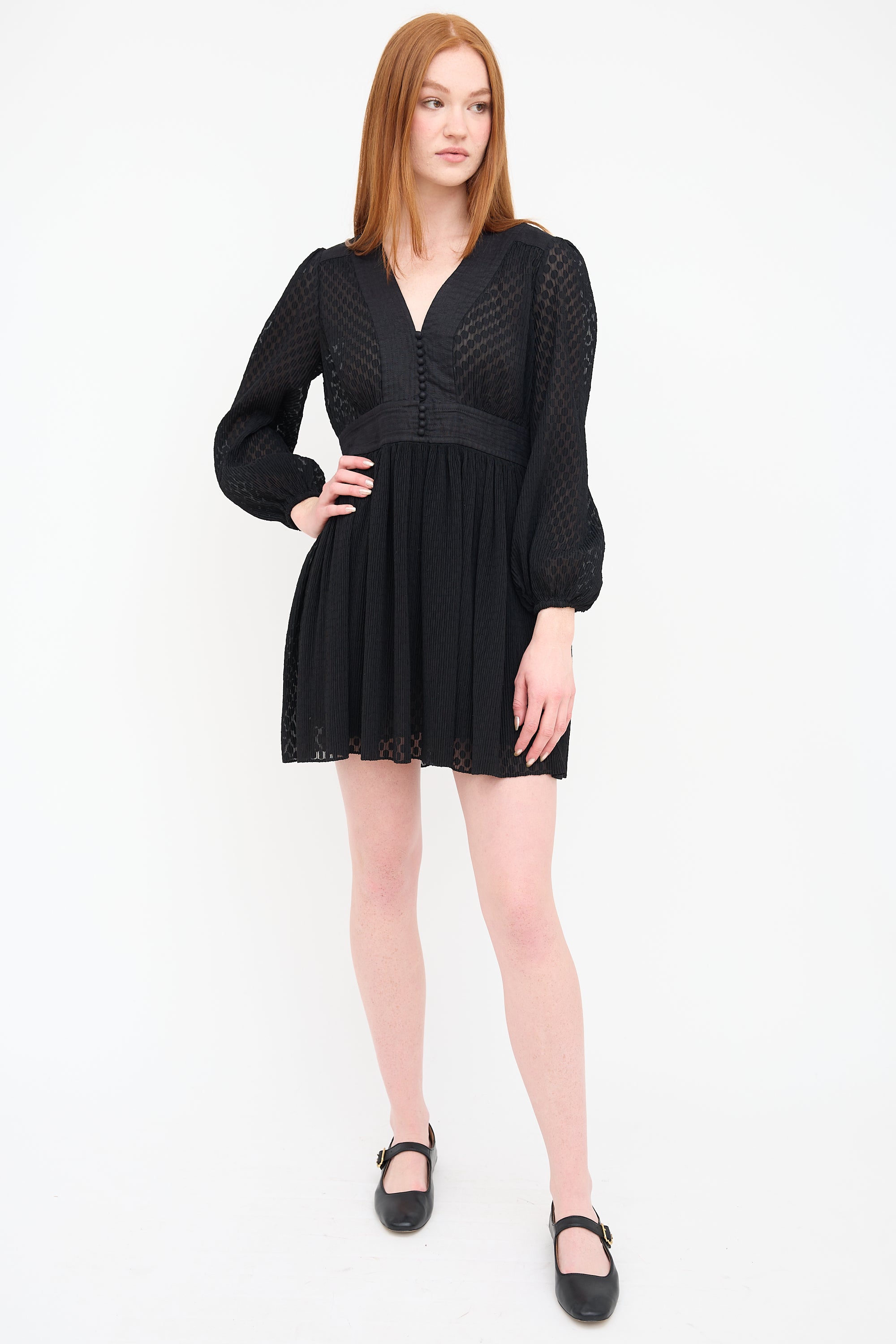 Pre-owned Zimmermann black polka dot fil coupé plissé mini dress featuring a deep V-neckline, quilted paneling, loop button front, long balloon sleeves with elasticized cuffs, concealed back zip closure, and sheer black lining at skirt.