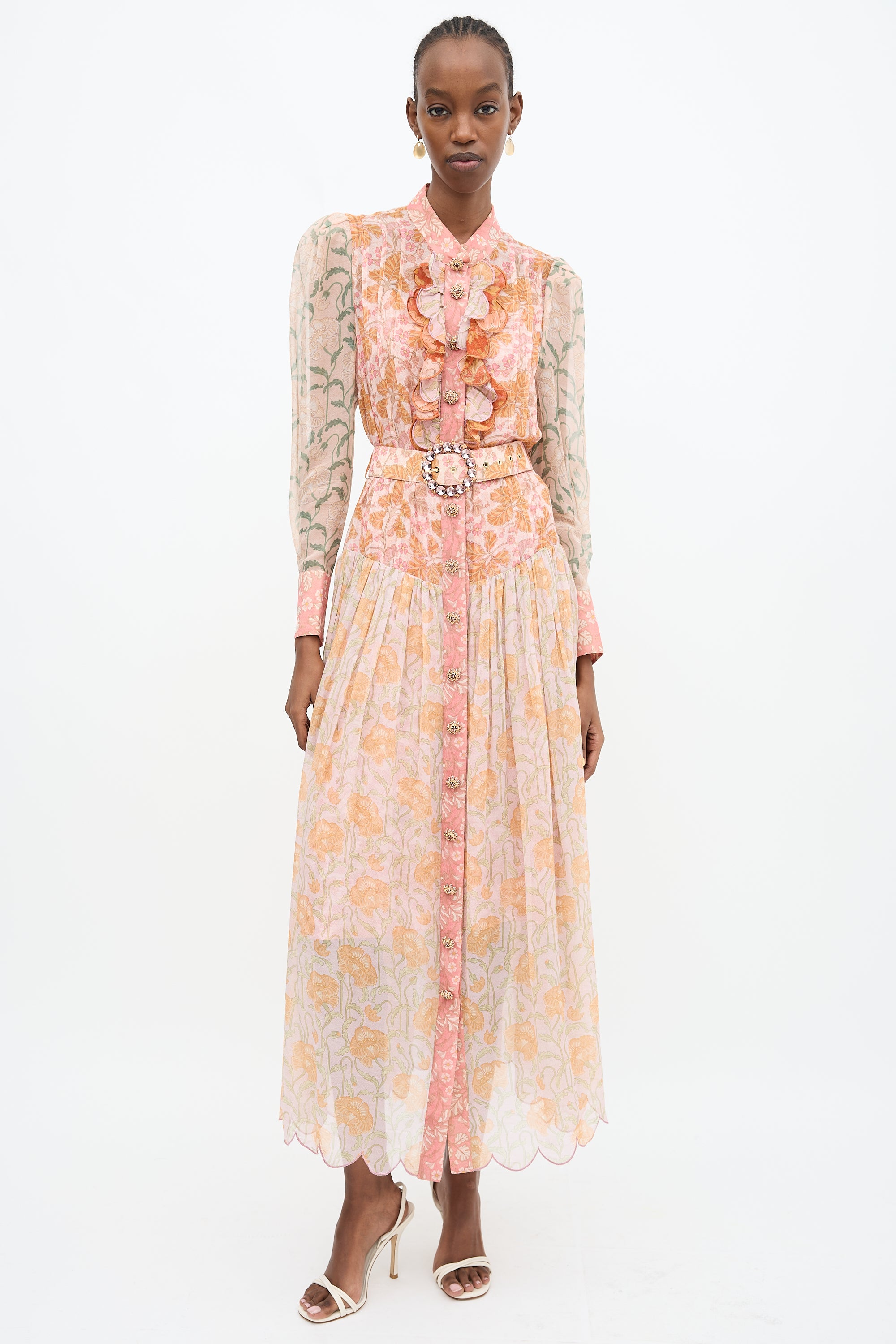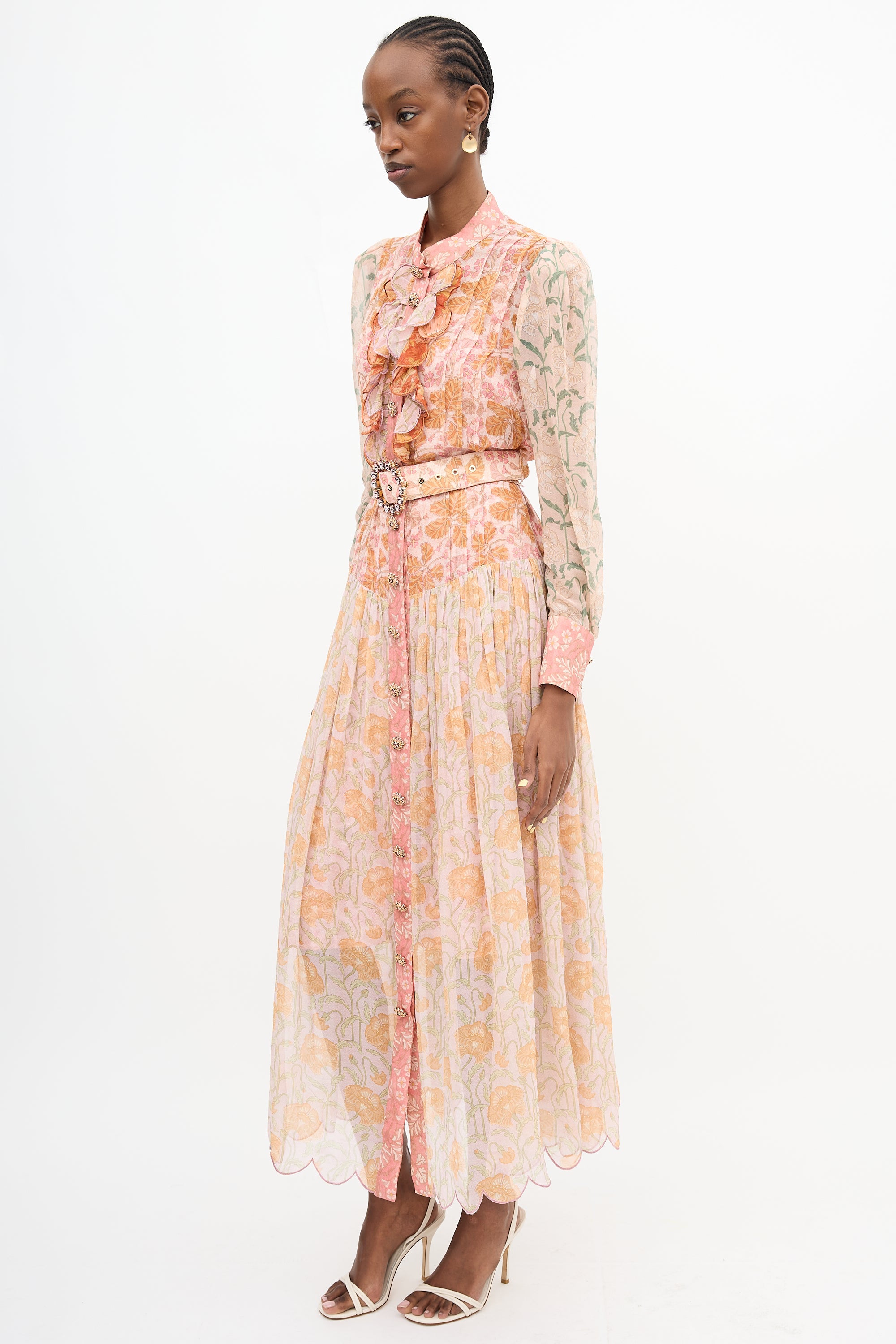 Pre-owned Zimmermann pink silk blend dress featuring a floral colourblock print, stand collar, ruffled and pleated front, gem buttons at front and cuffs, matching buckle belt, and scalloped hem. Includes matching slip.