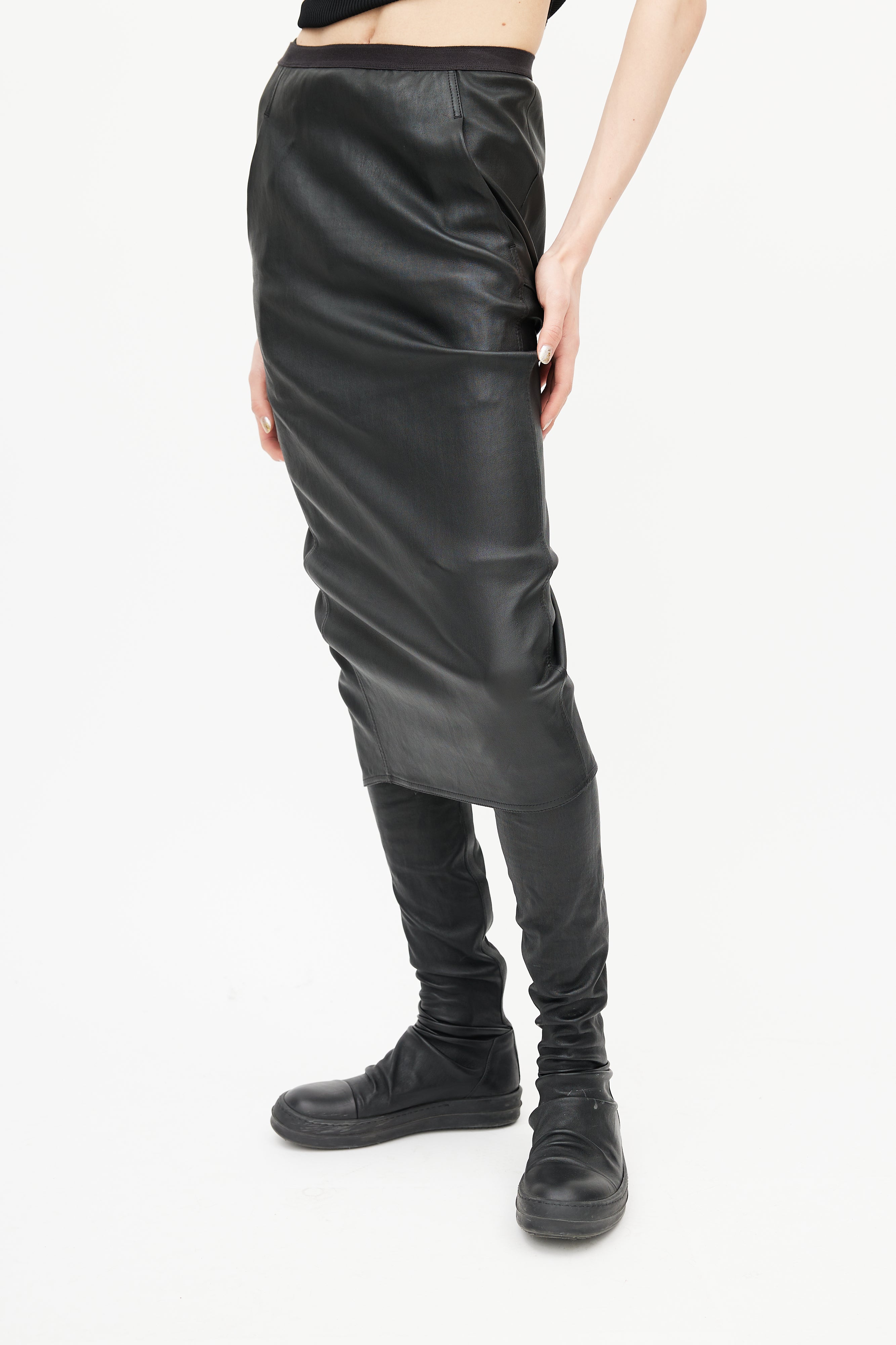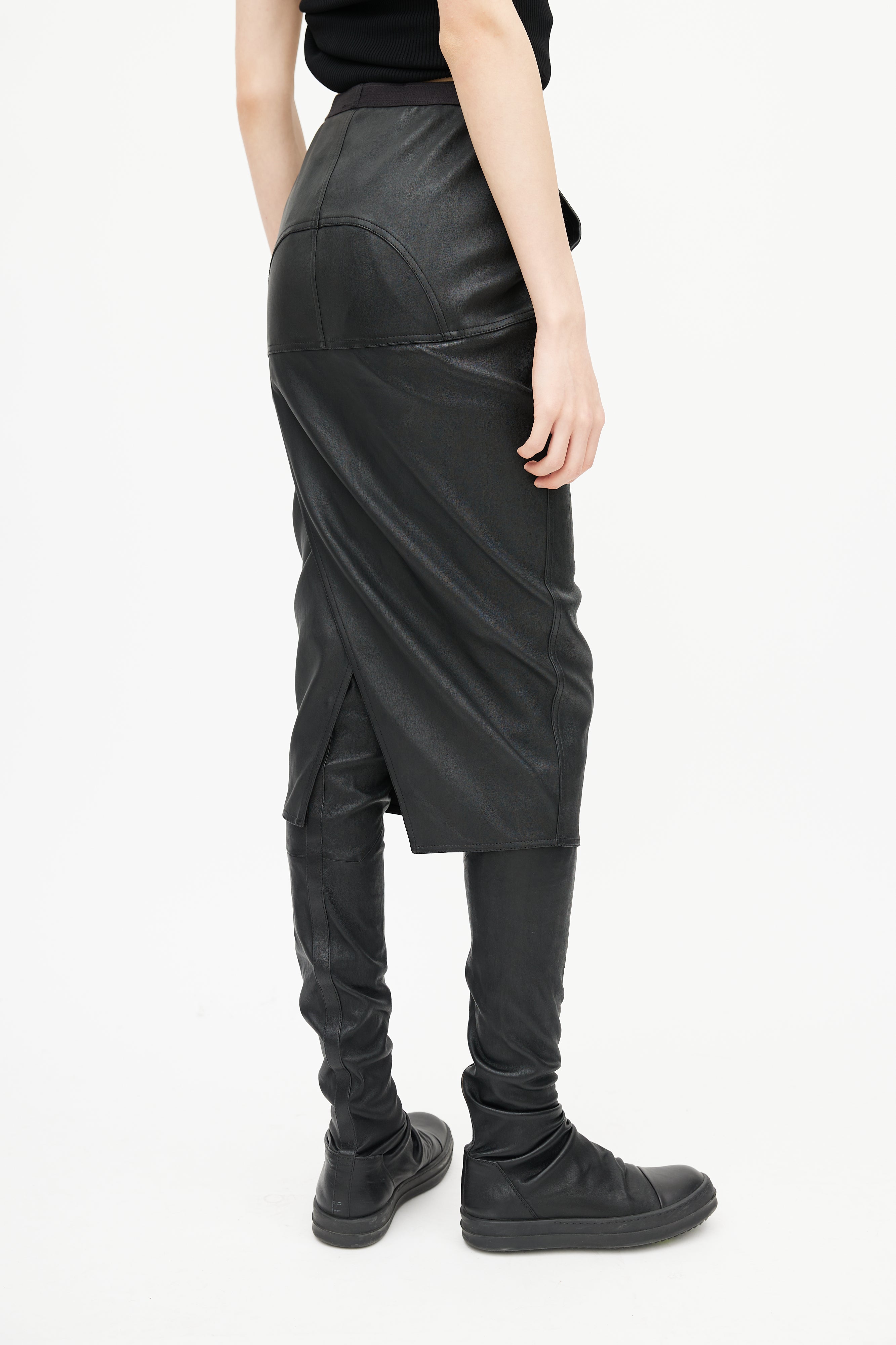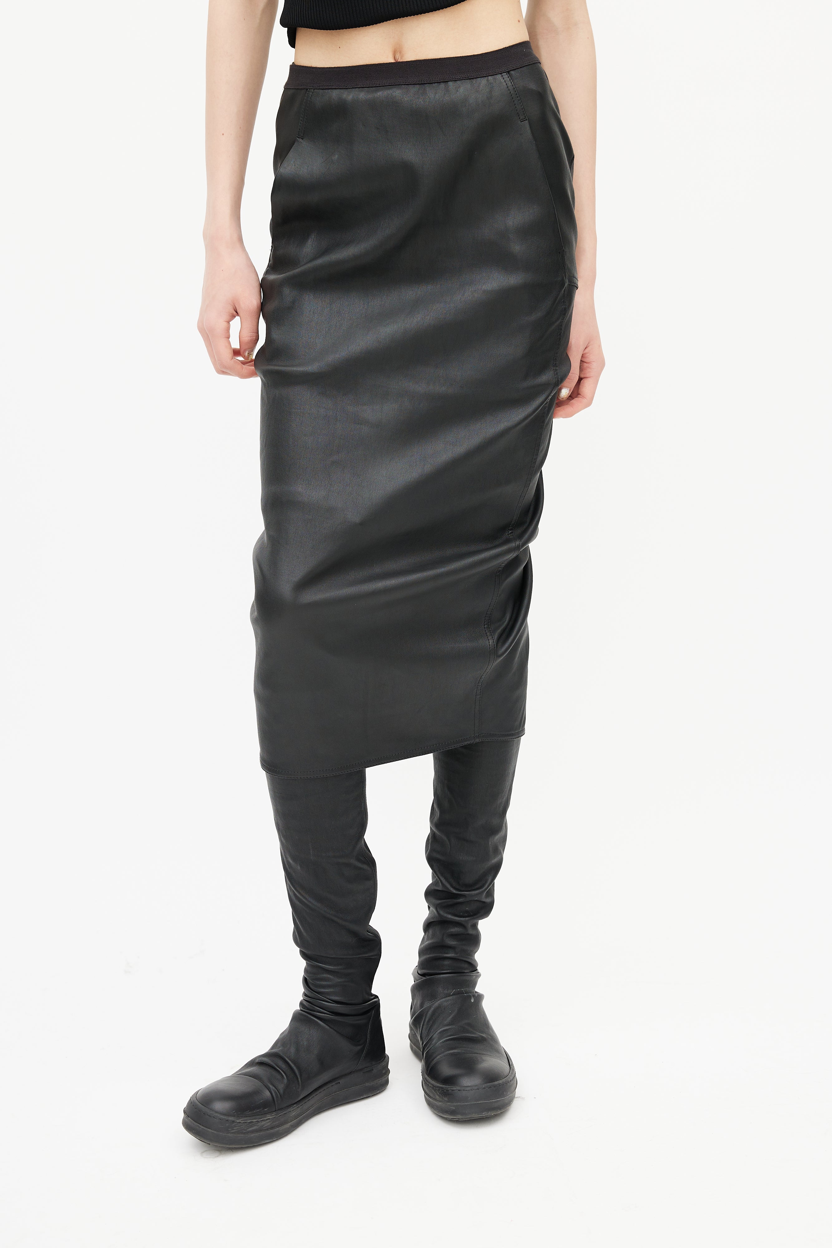 Pre-owned Fall/Winter 2021 Rick Owens black leather pencil skirt featuring an elasticized waist, two slip pockets at waist, and panelled seams at back. Lined.