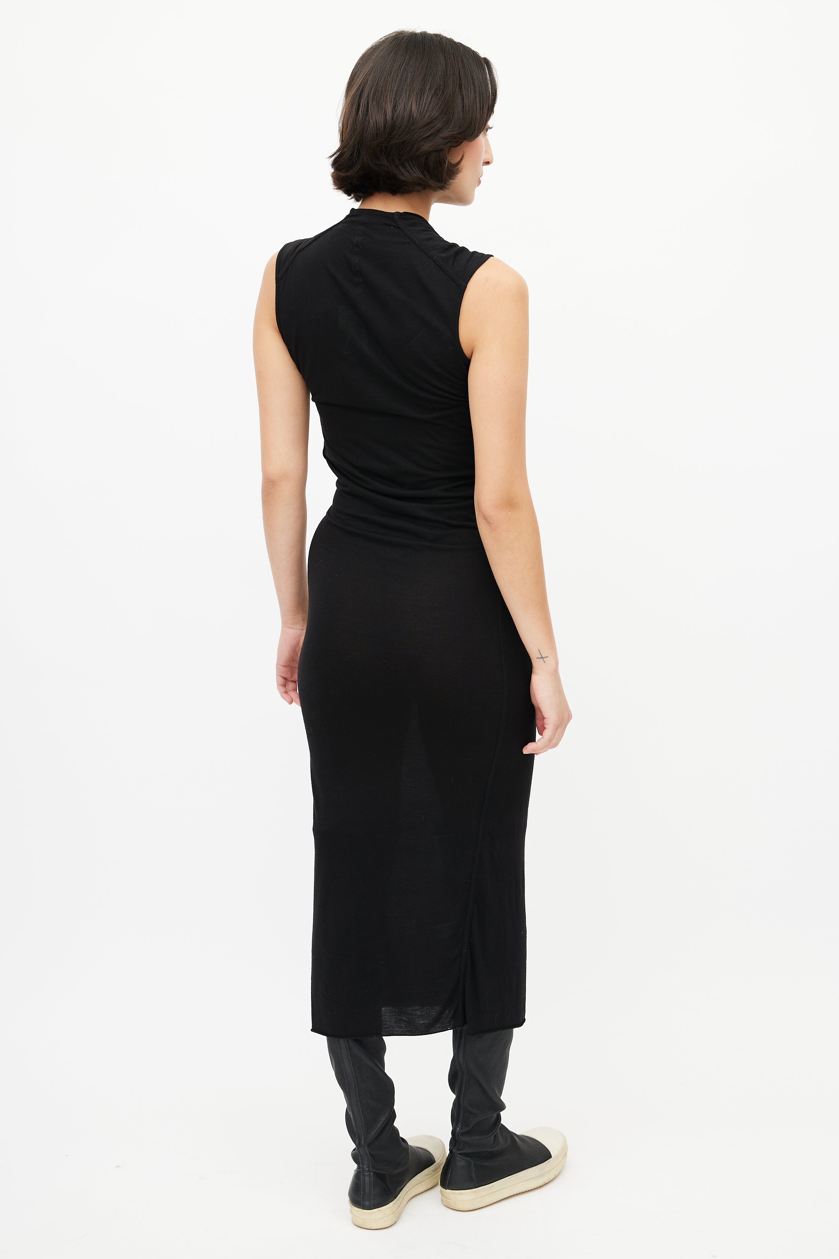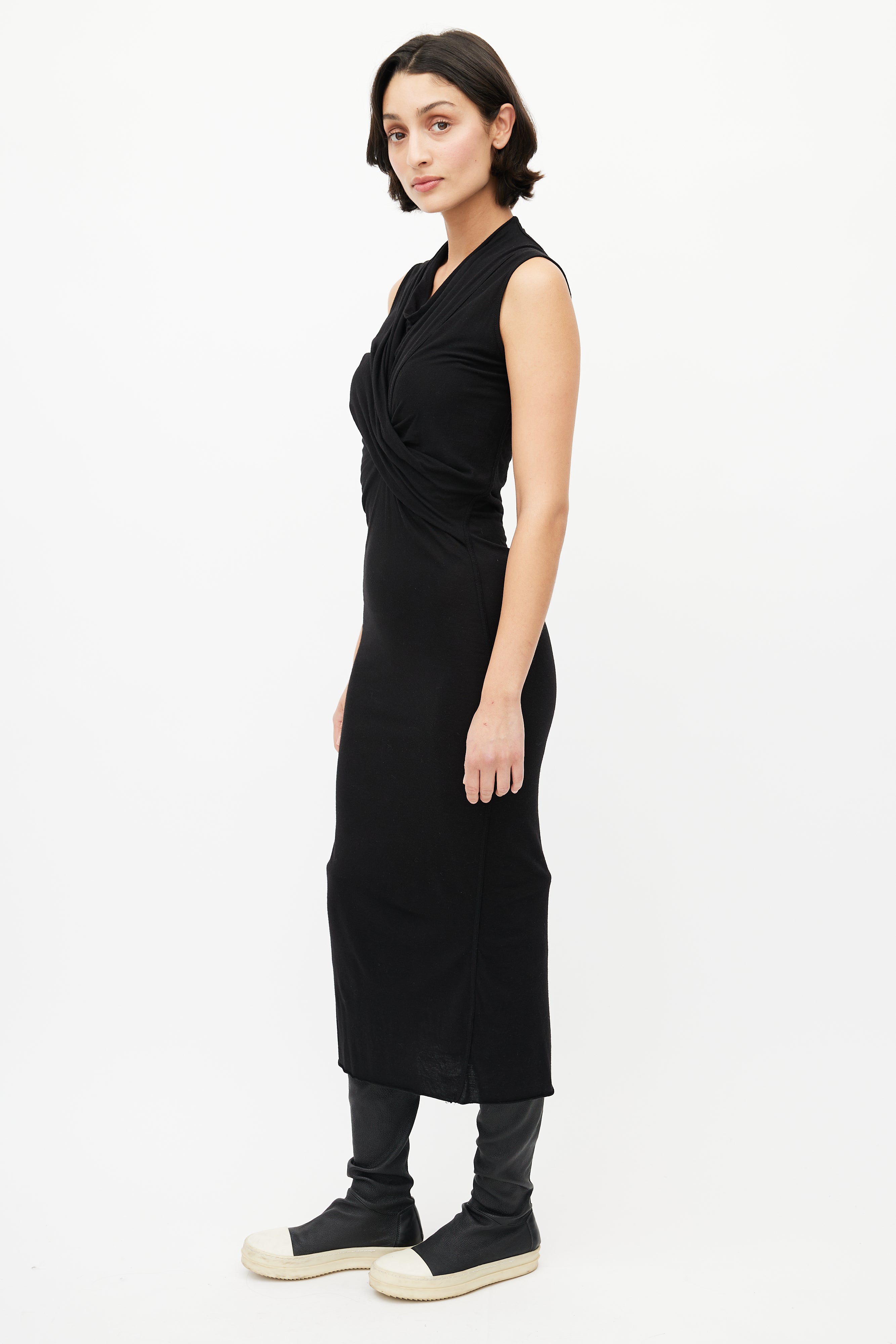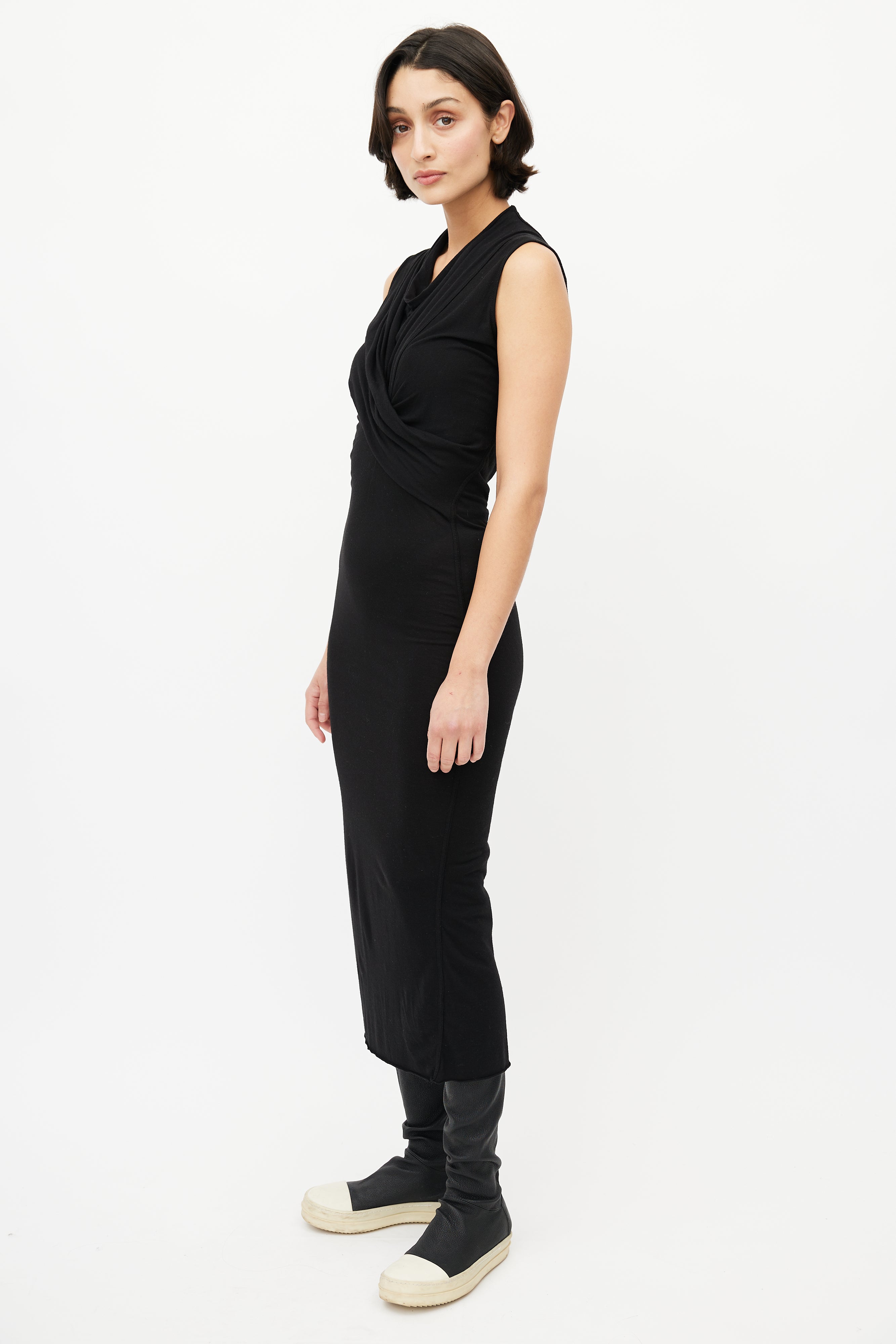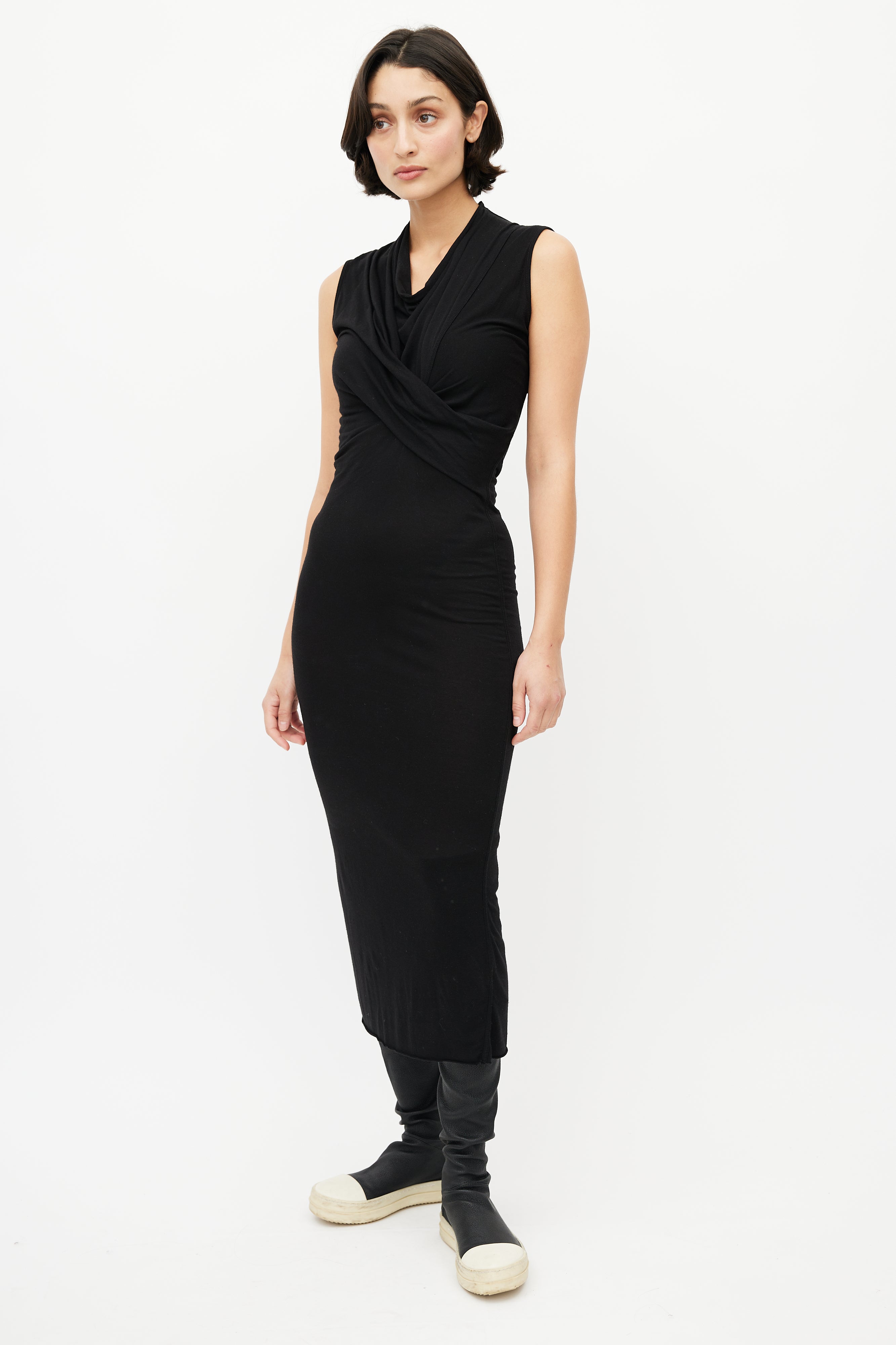 Pre-owned Rick Owens Lilies black maxi dress featuring a cowl neckline, draped front, and sleeveless styling.