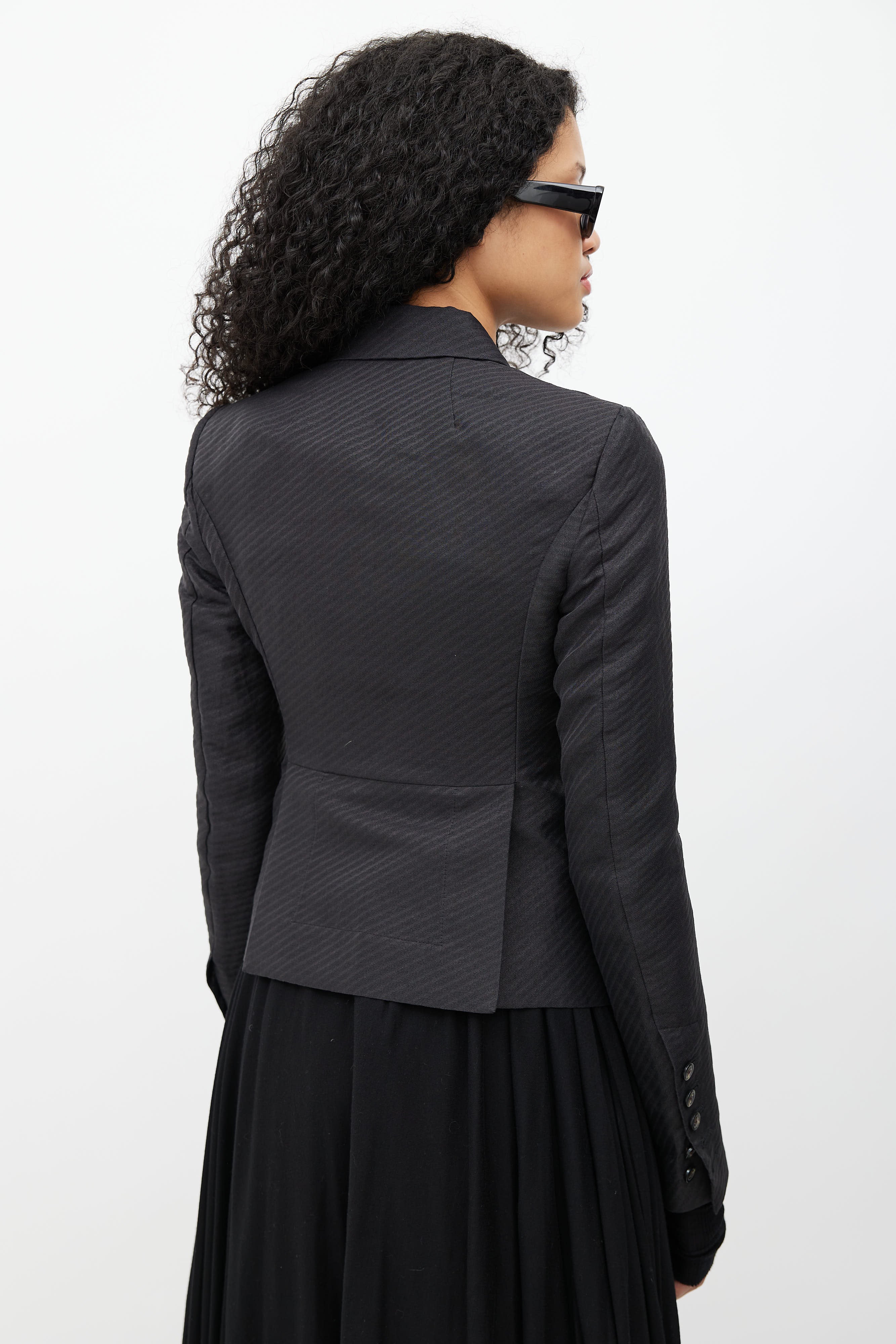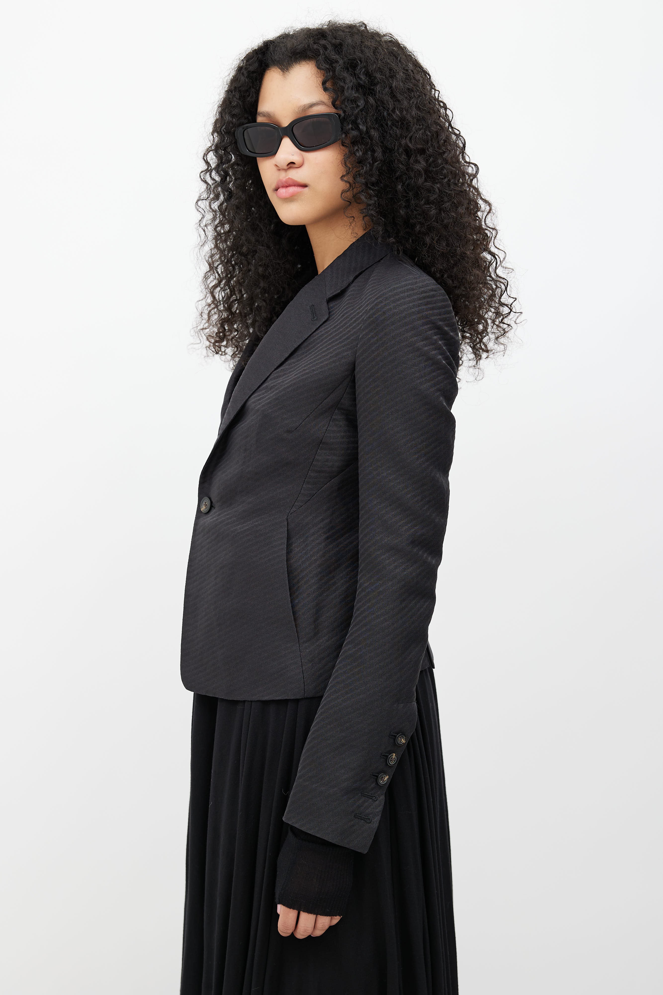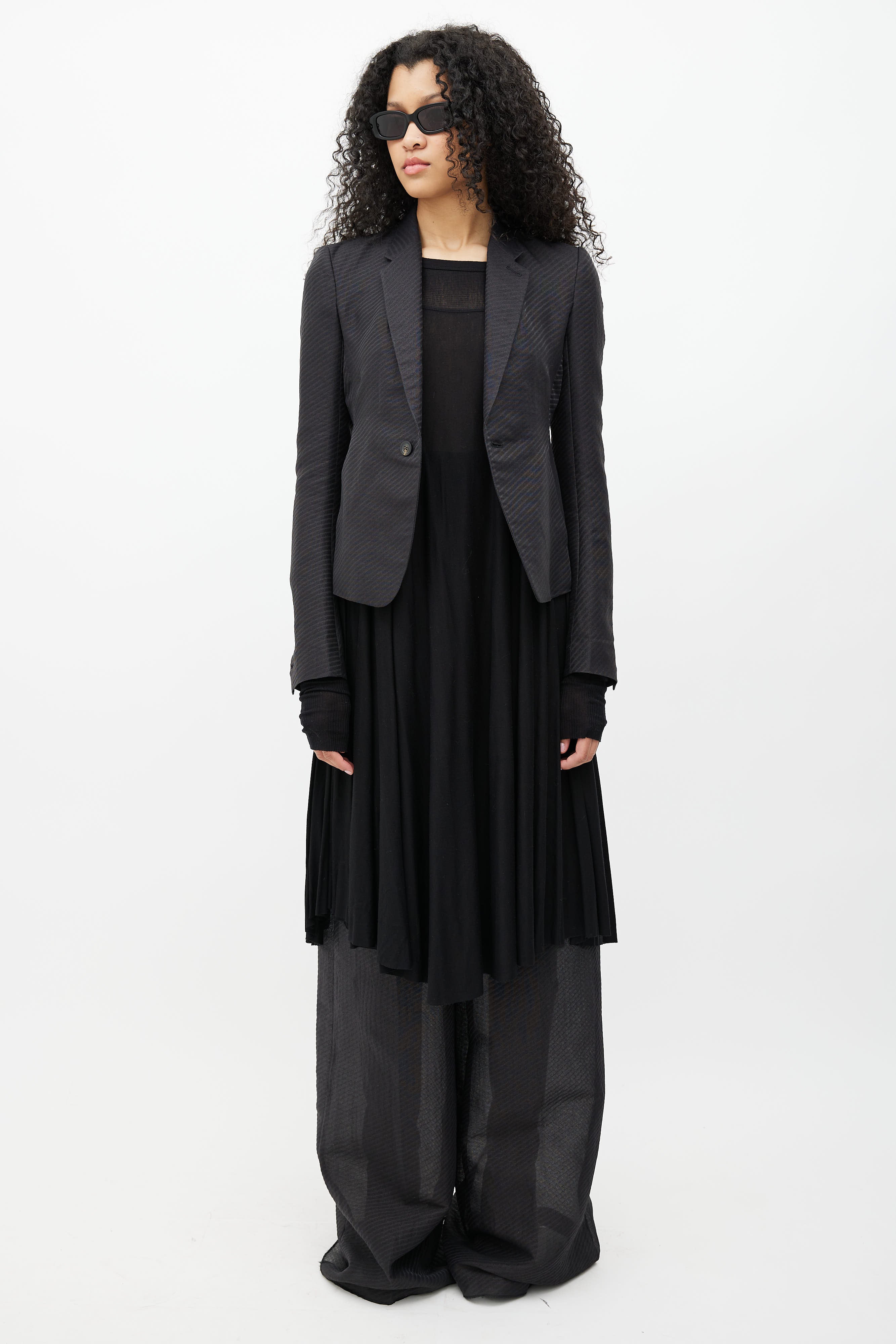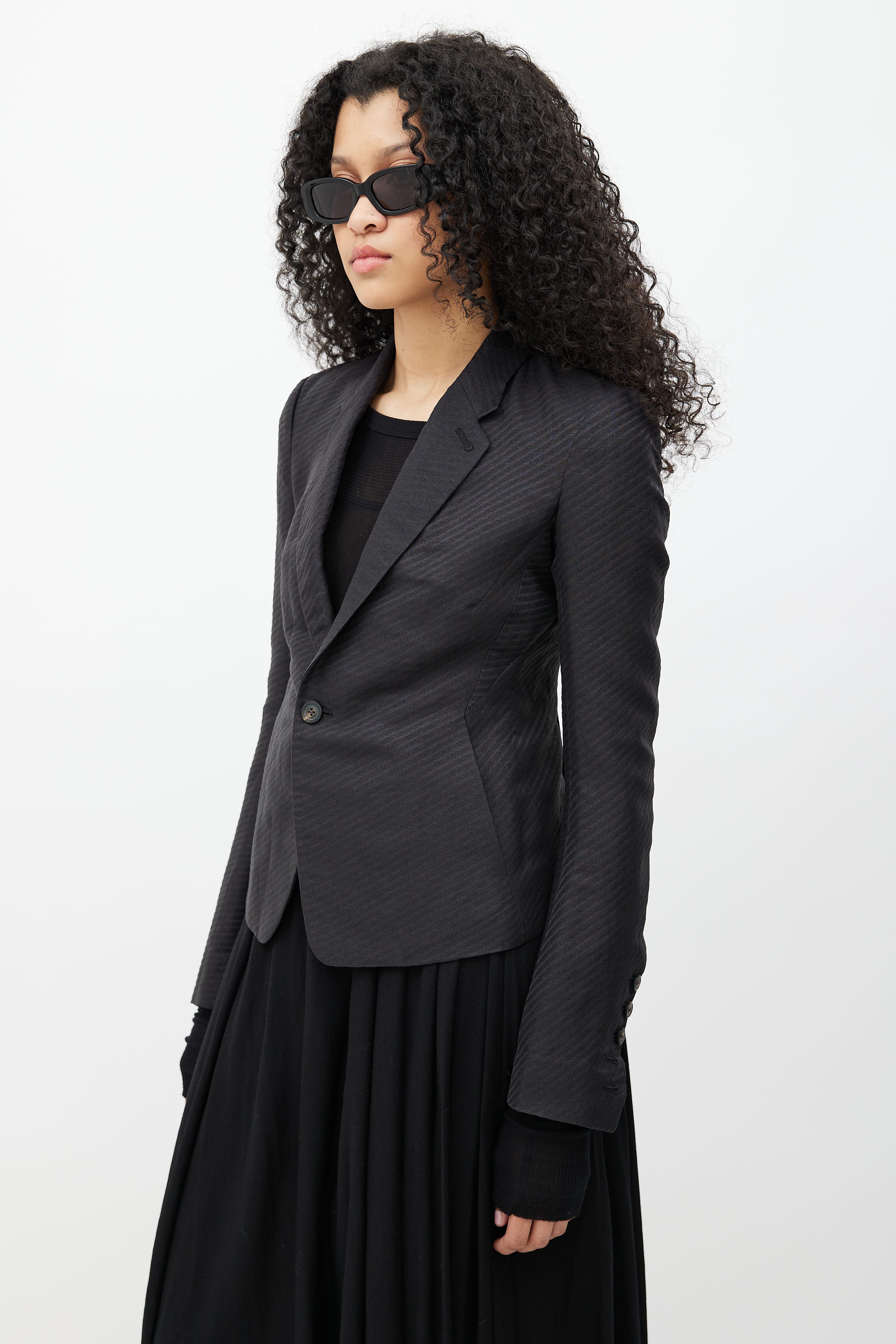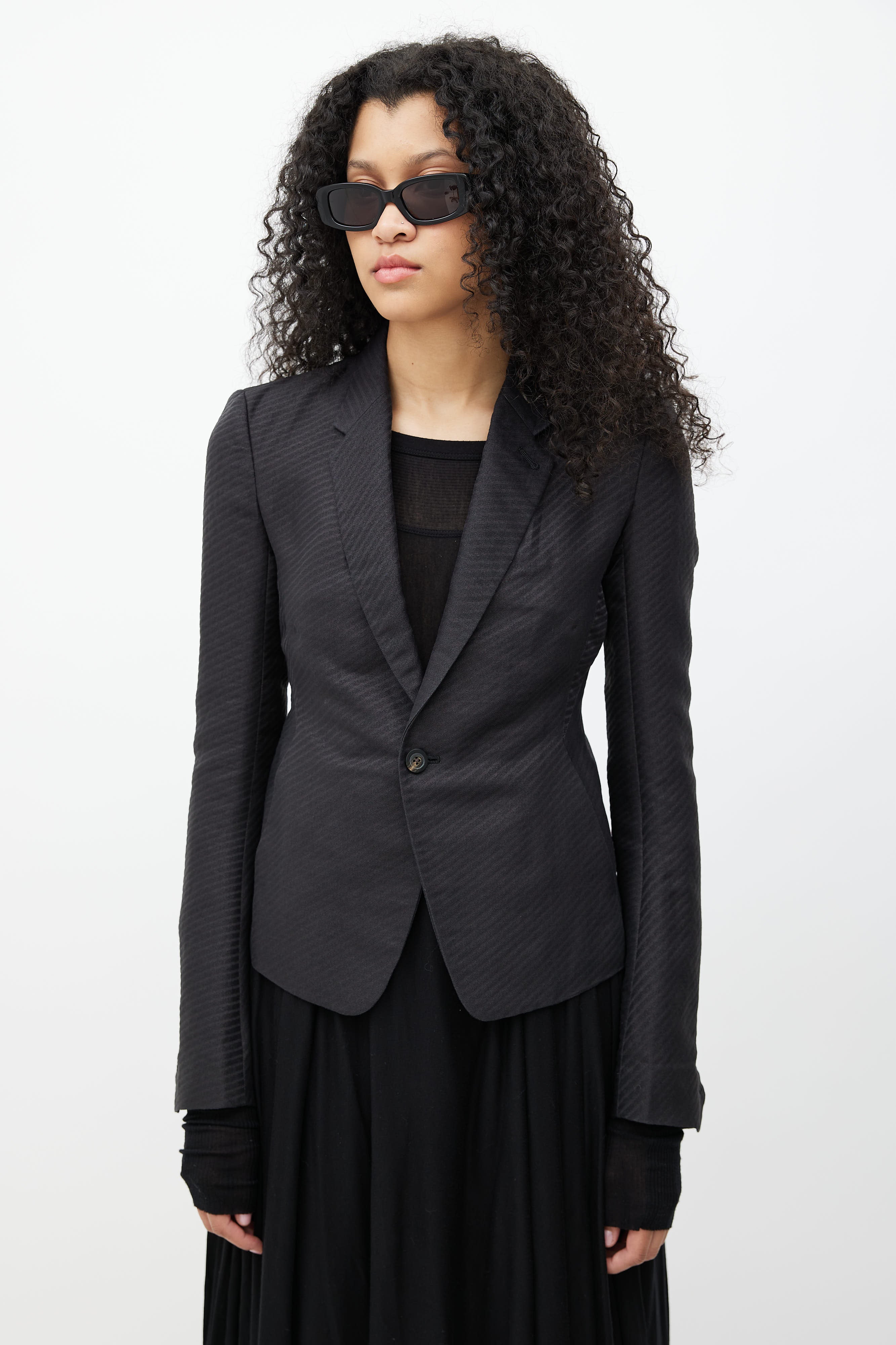 Pre-owned SS 2018 Rick Owens black blazer featuring notch lapel, buttoned cuffs, single button closure, and two back flaps. From the Dirt collection.