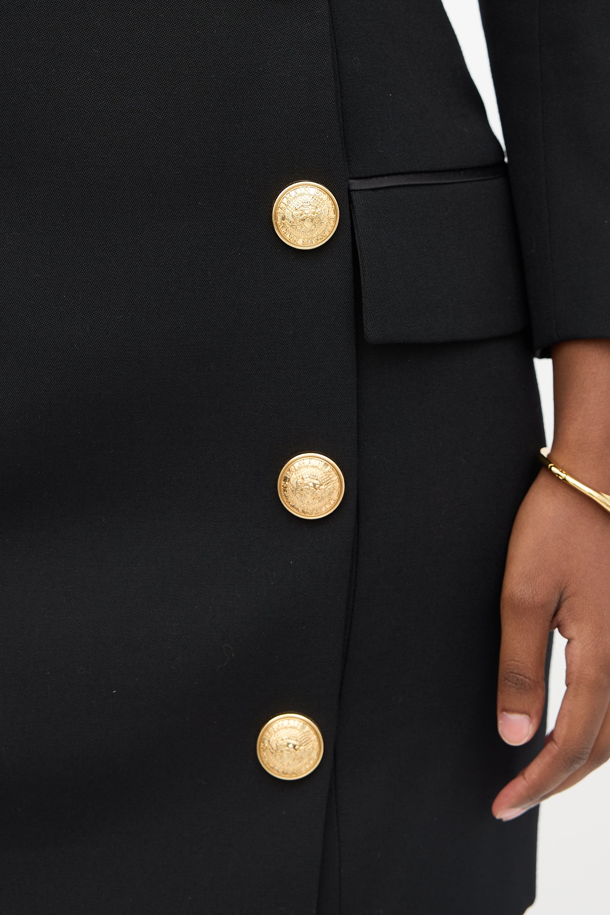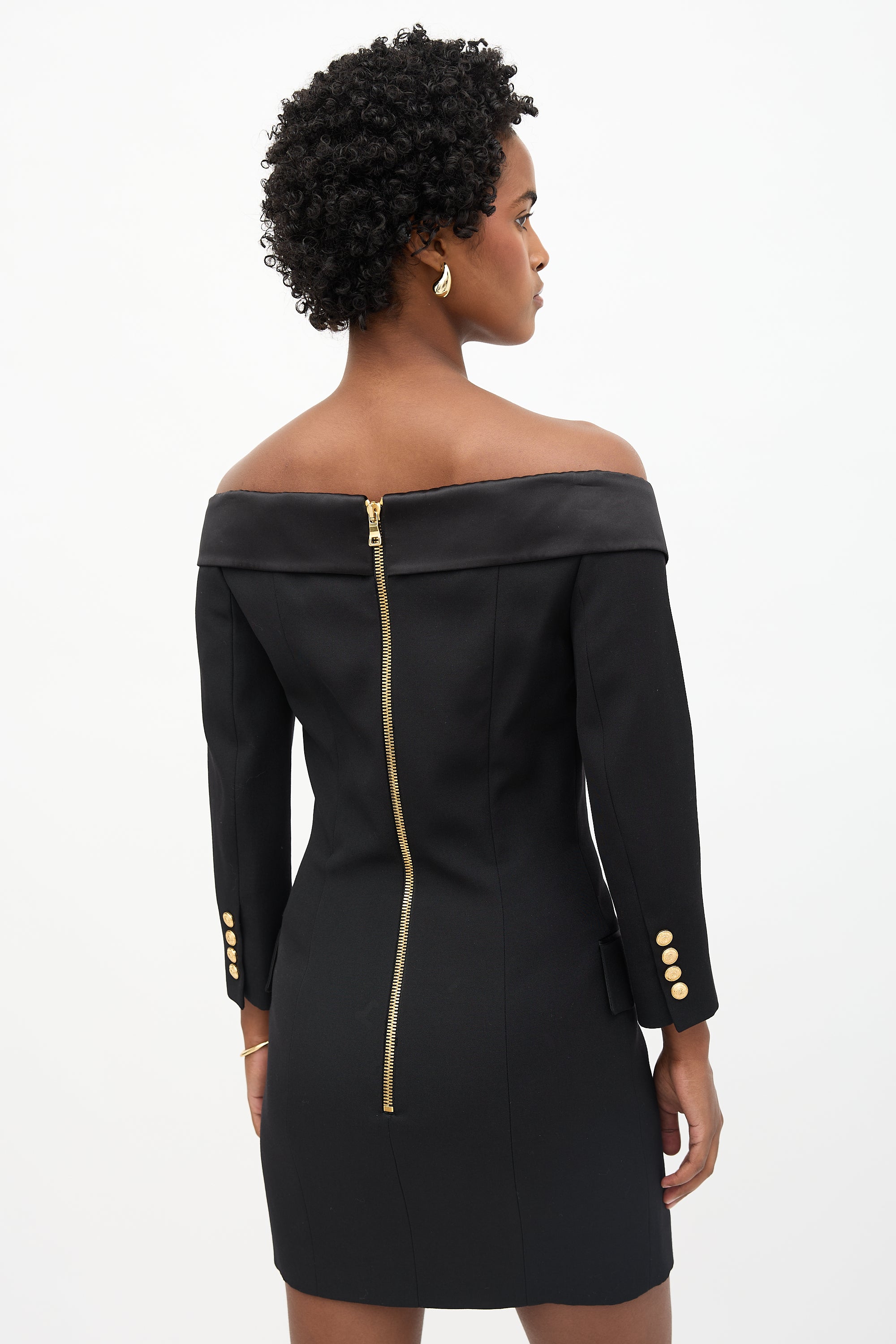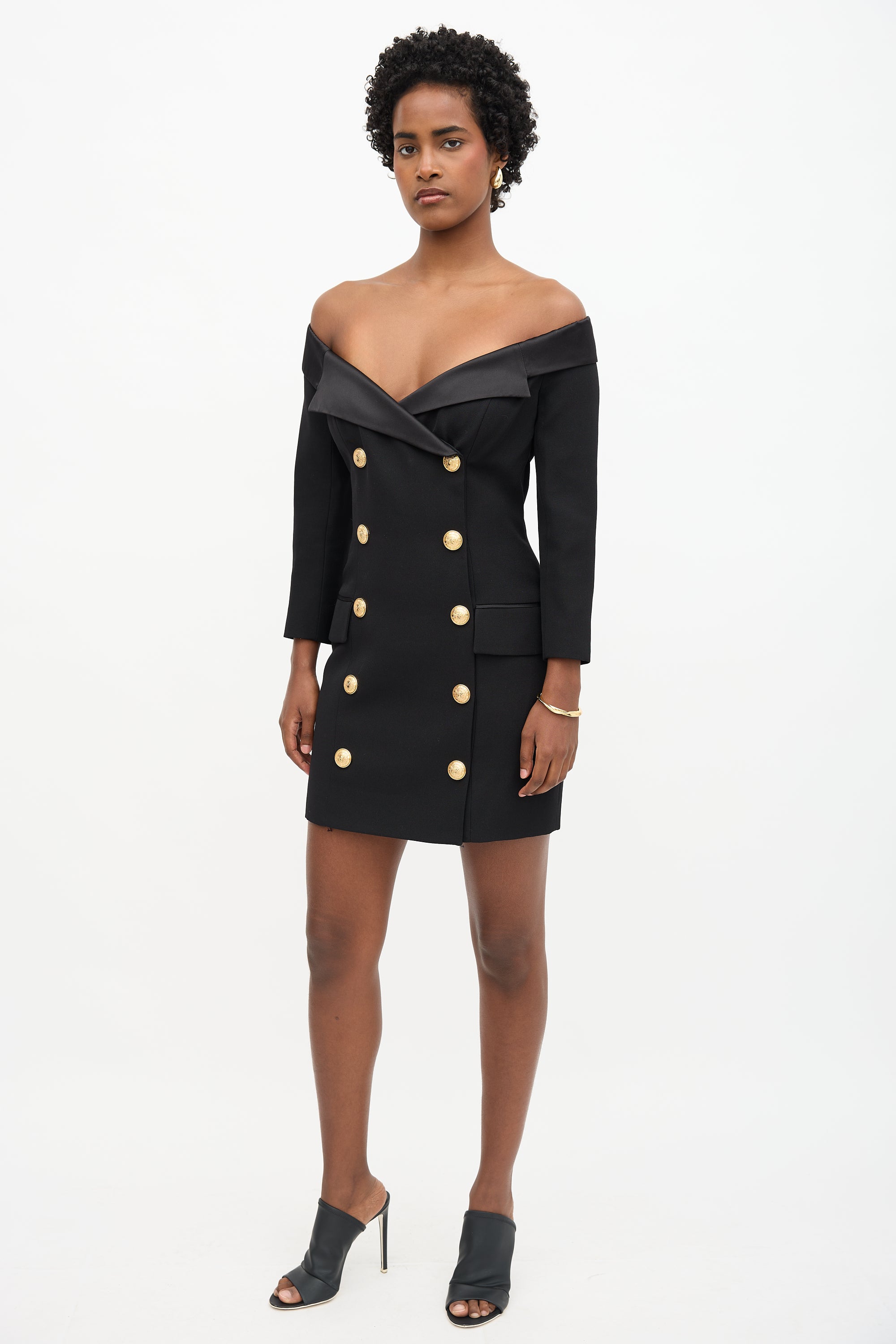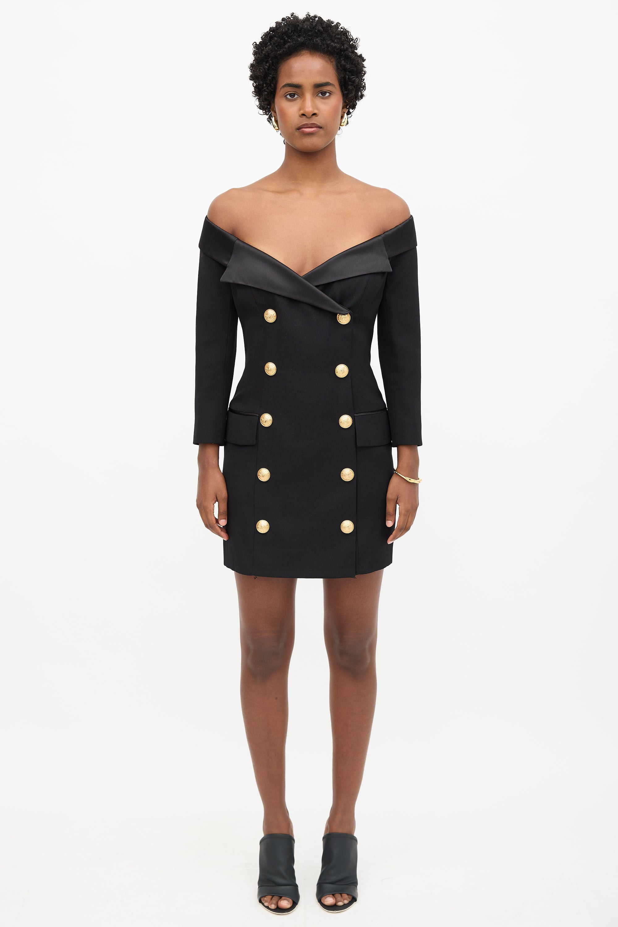Pre-owned Balmain black mini dress featuring off shoulder topline with satin lapel detail, decorative gold tone double breasted button front, two front pockets, back zip, three quarter sleeves, and buttoned cuffs. Lined.
