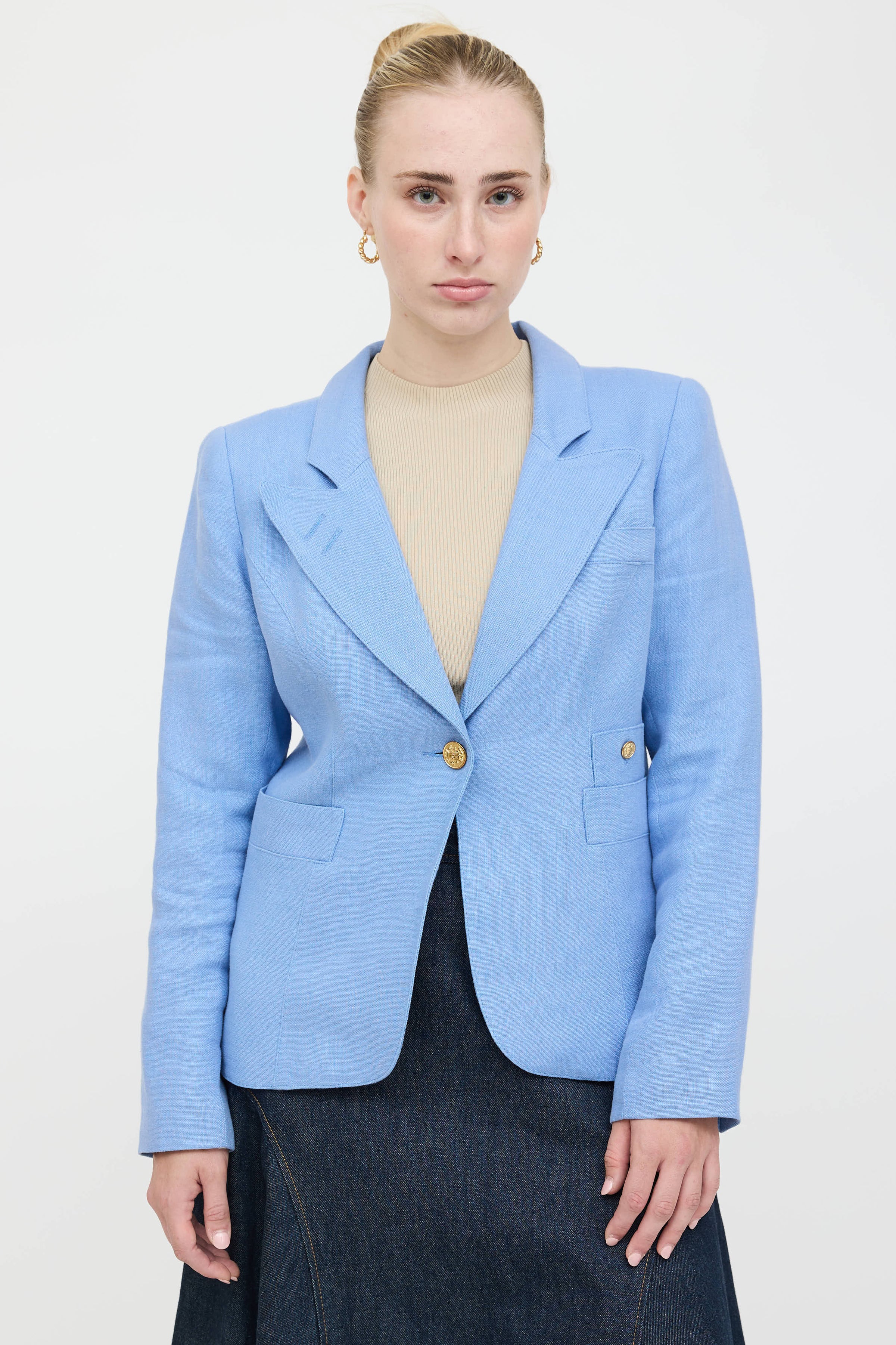 Pre-owned Smythe blue long sleeve blazer featuring peak lapel collar, gold tone button front, shoulder pads, welt pocket at chest and at front, buttoned cuffs, and cutout at back hem. Lined.