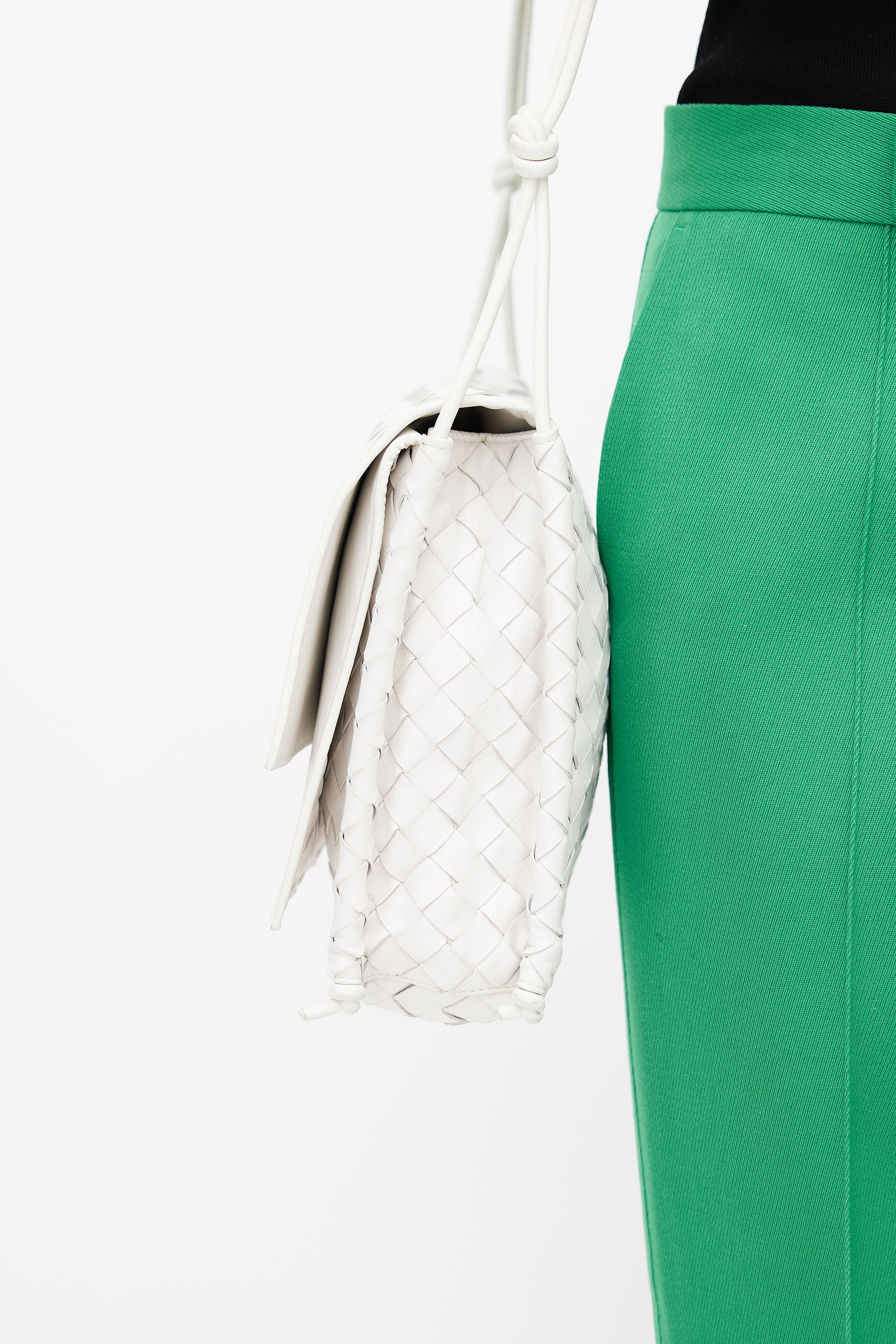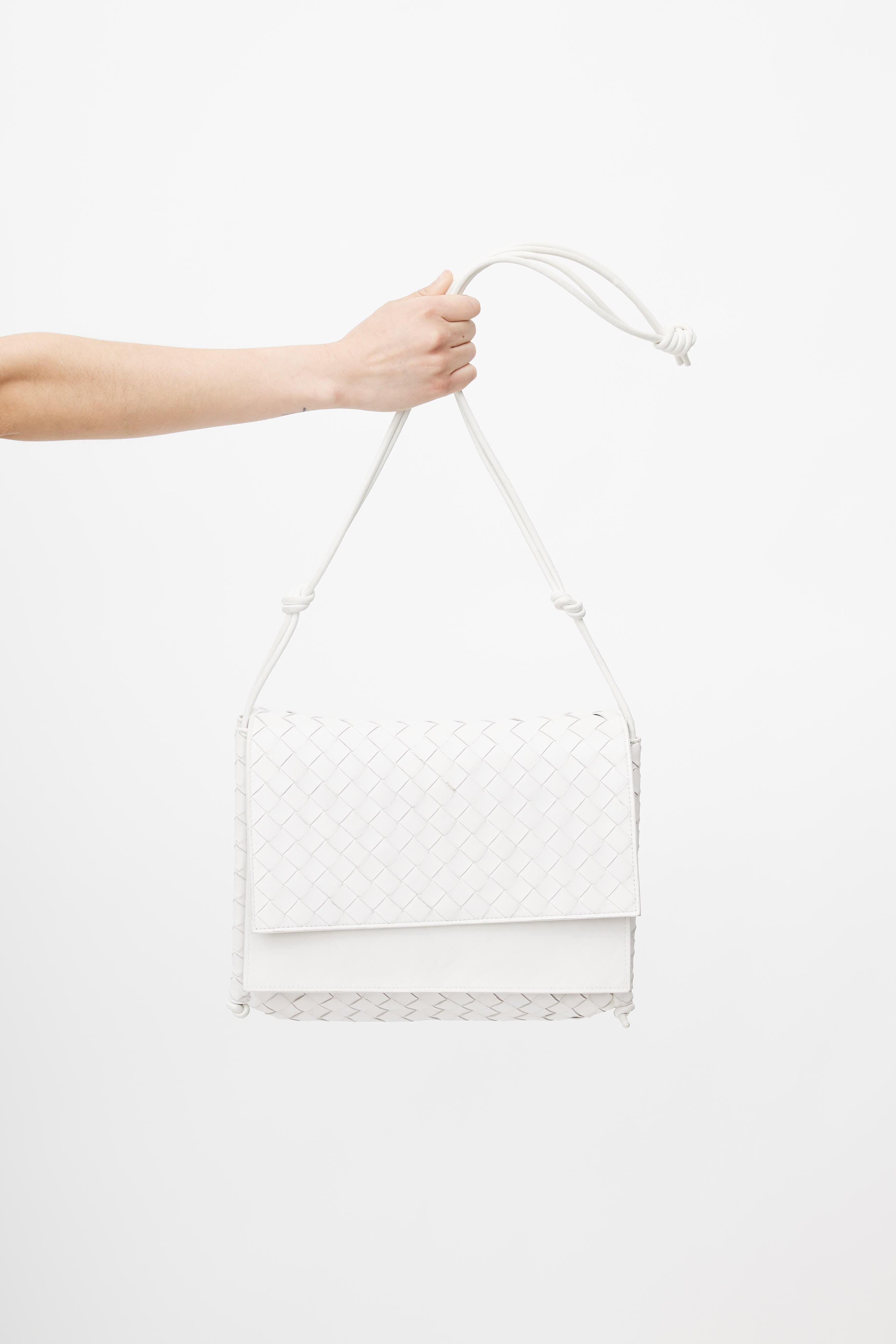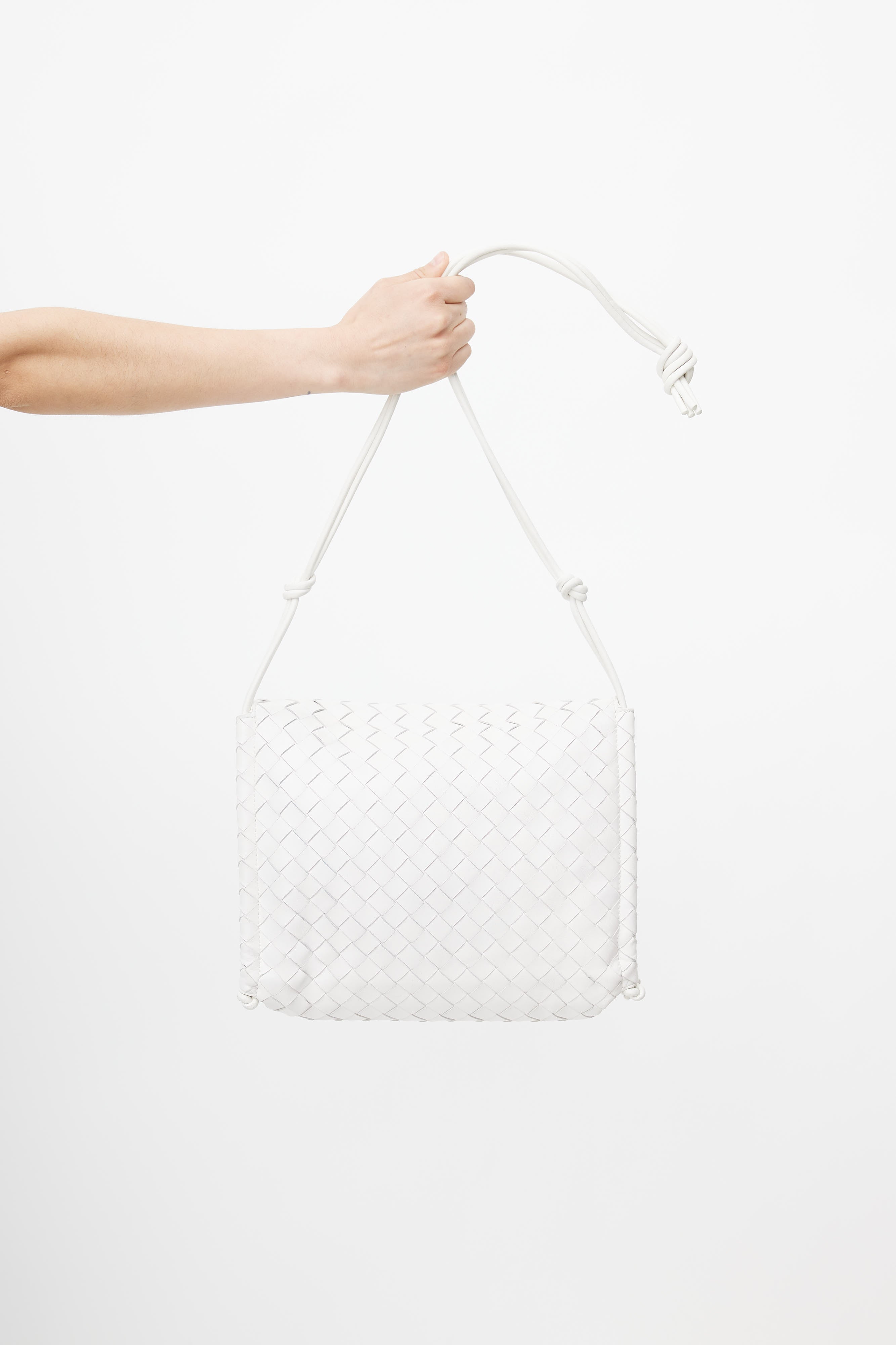 Pre-owned Bottega Veneta white BV Fold crossbody bag featuring Intrecciato weave, knotted shoulder straps, layered top flaps, and single main compartment with embossed logo. Comes with original dust bag and box.