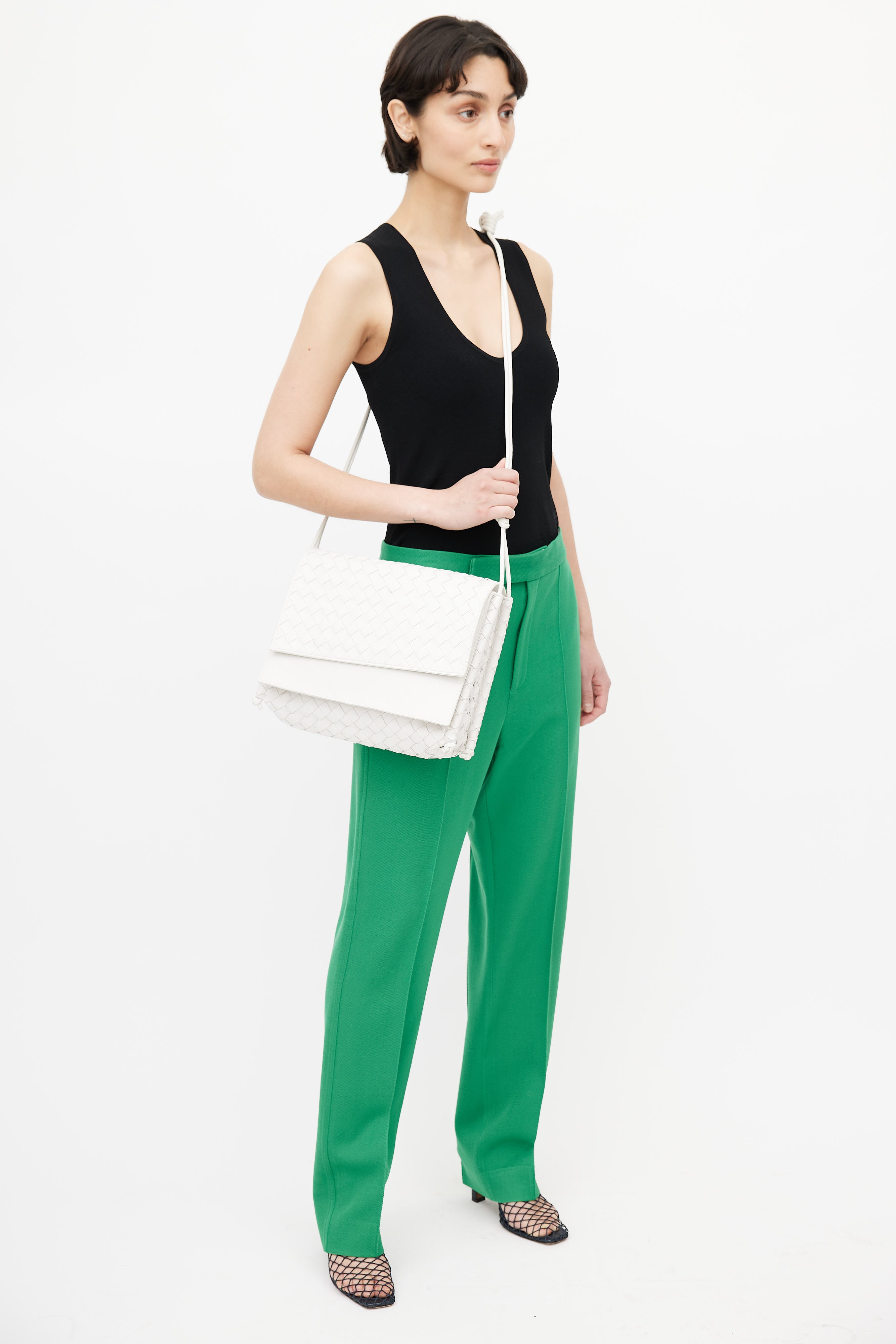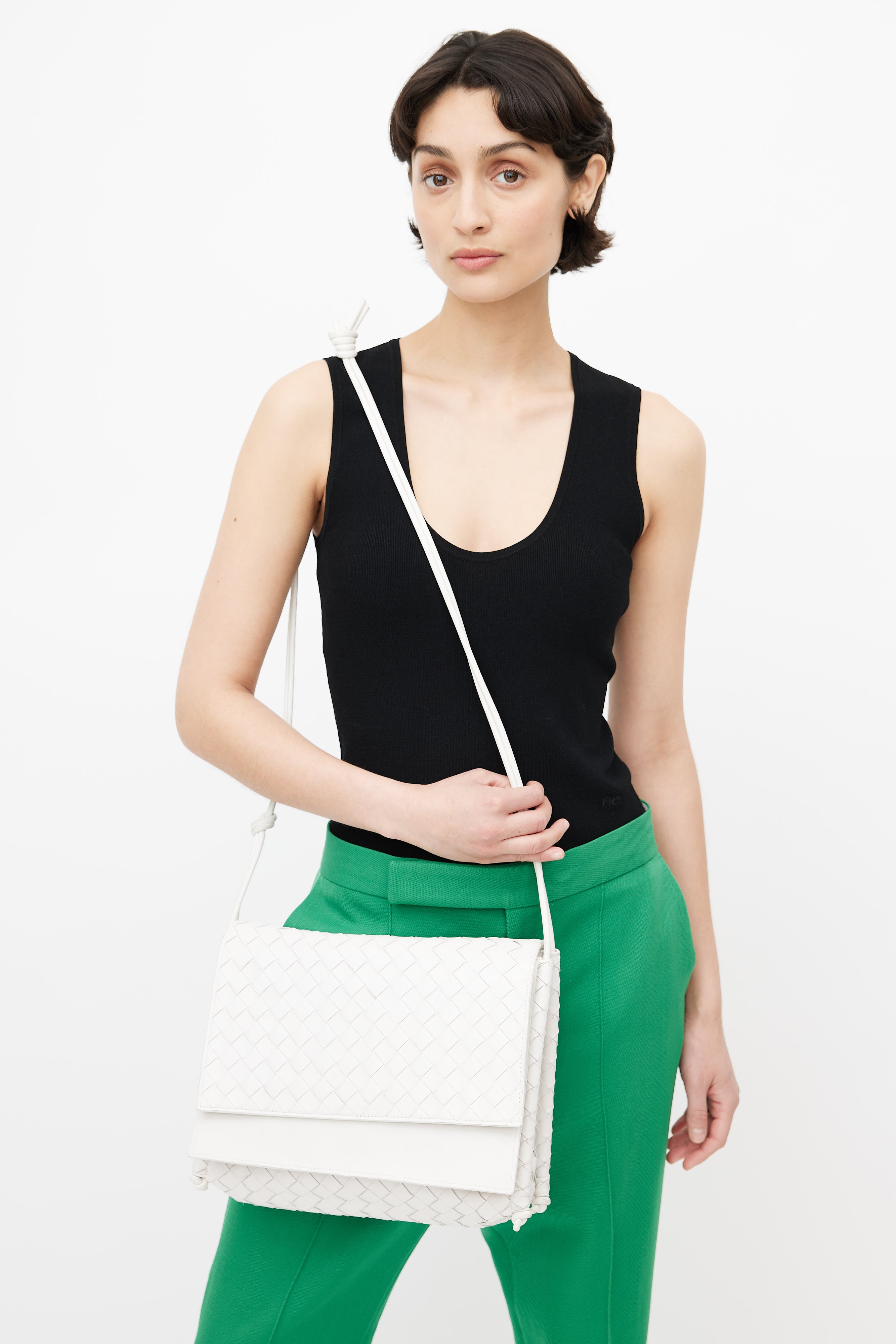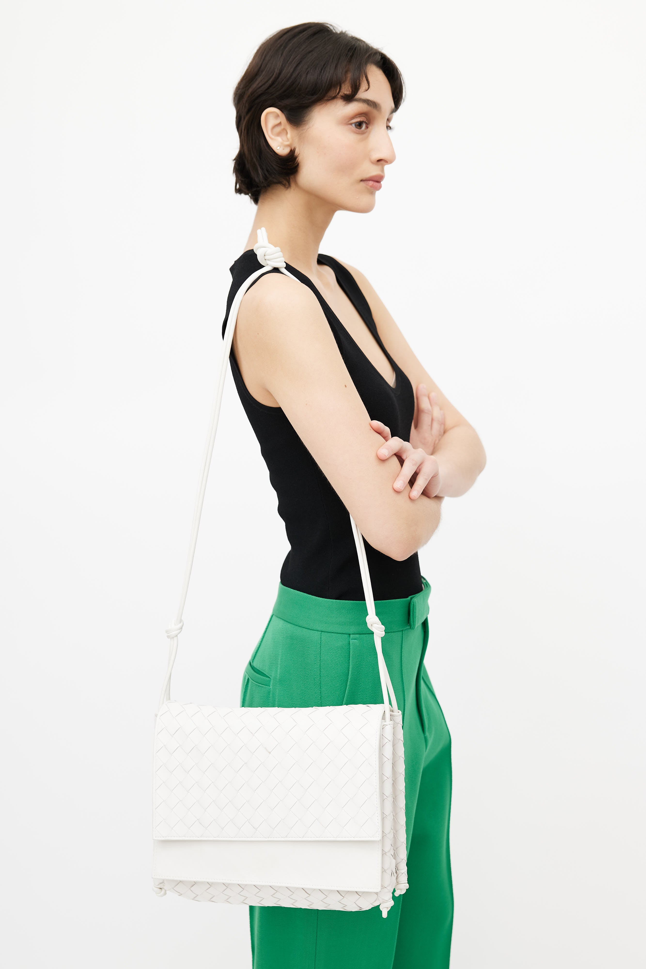 Pre-owned Bottega Veneta white BV Fold crossbody bag featuring Intrecciato weave, knotted shoulder straps, layered top flaps, and single main compartment with embossed logo. Comes with original dust bag and box.