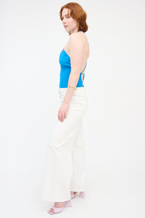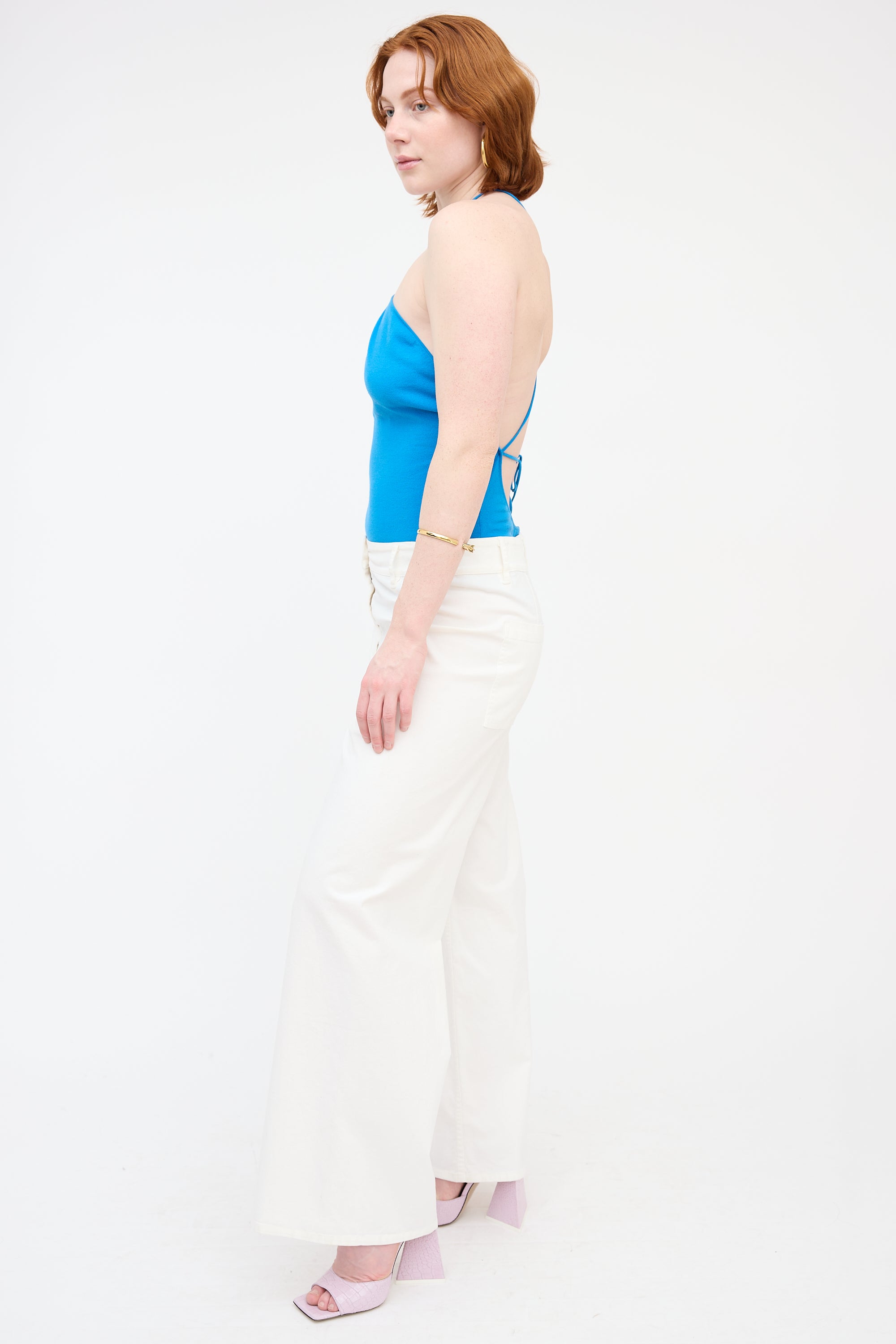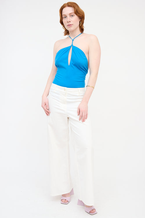 Bottega Veneta Pre-Fall 2020 cashmere bodysuit in Swimming Pool featuring keyhole cutout at front, halter neckline, strappy back, and brief bottom with snap button closure.